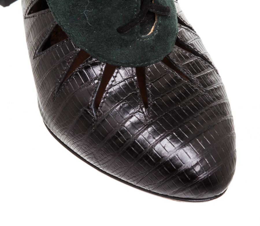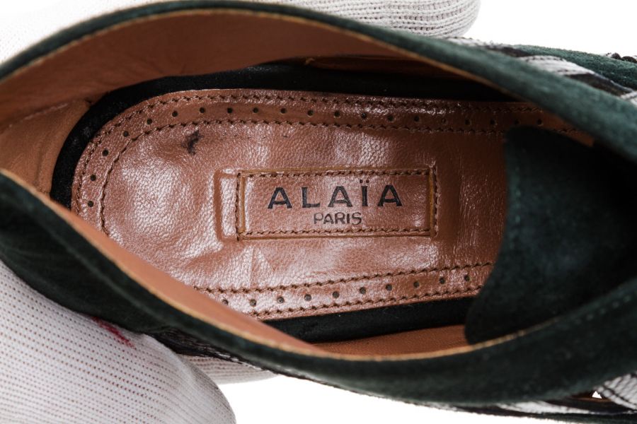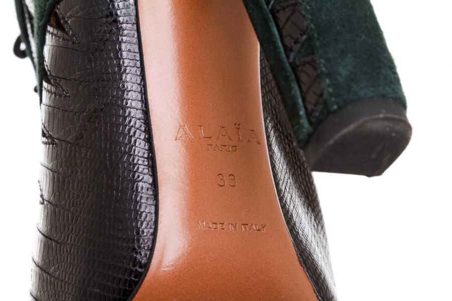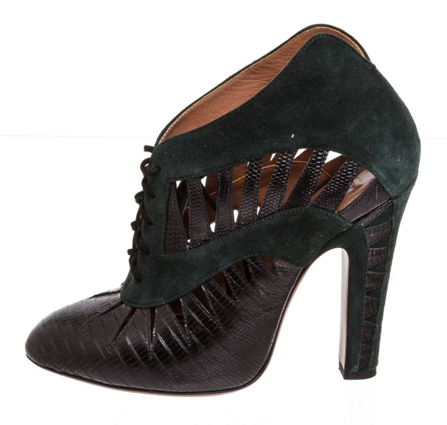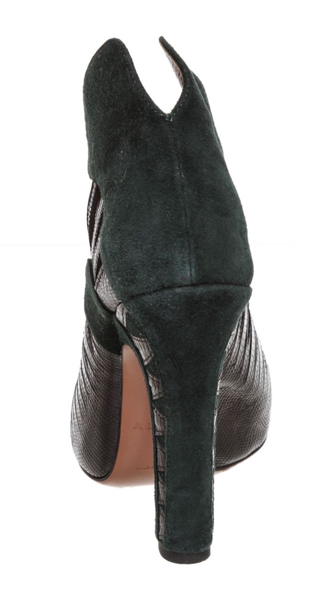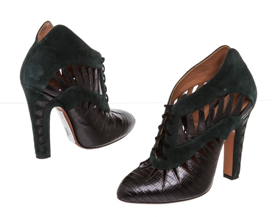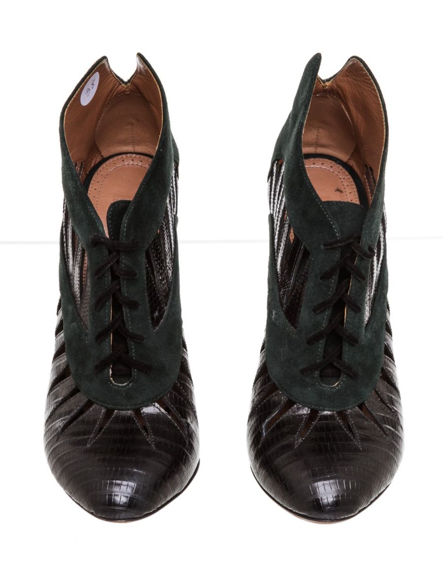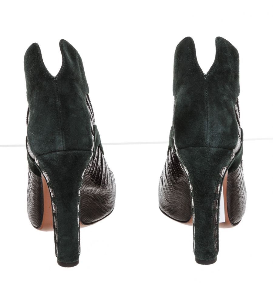 Azzedine Alaïa Cut-out Lace-up Boots ,Green suede and black crocodile leather stamped booties , Inverted triangle cut-out detailing