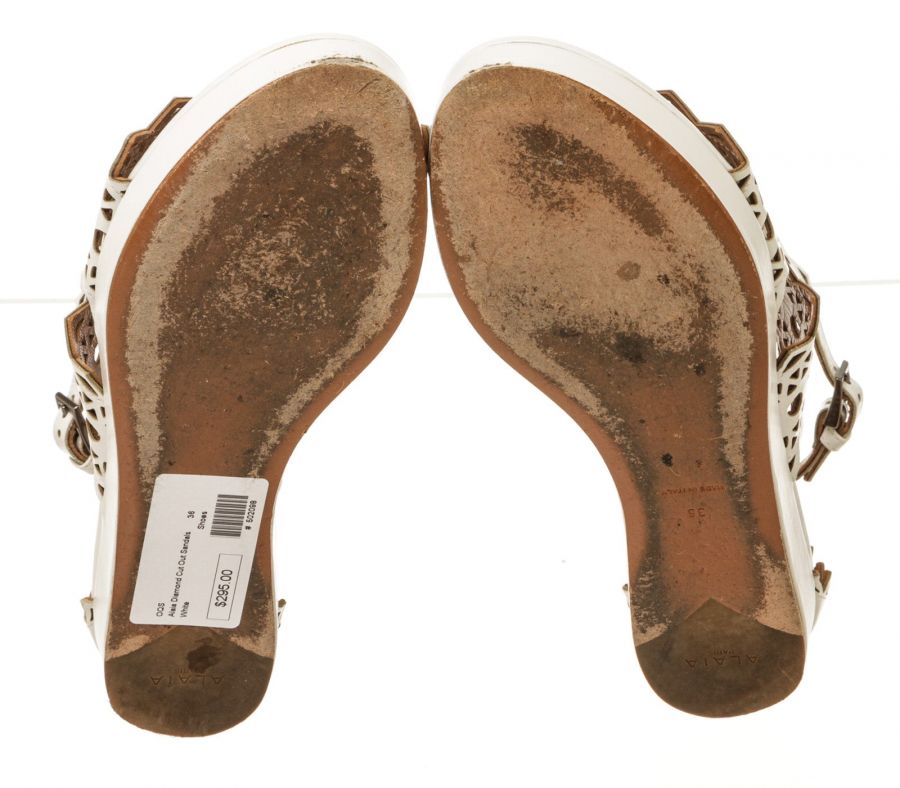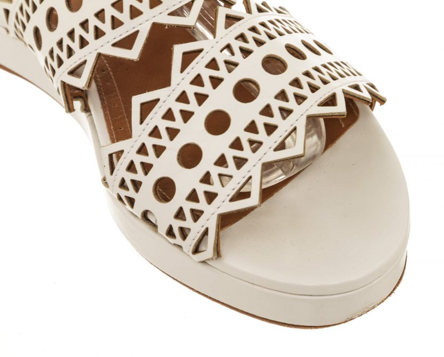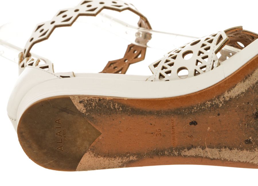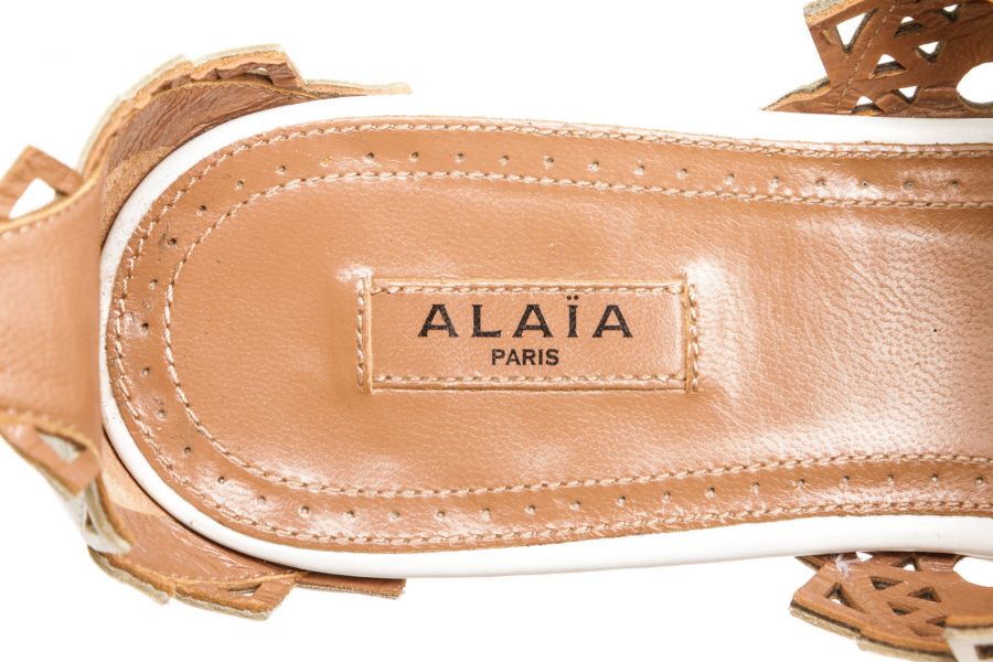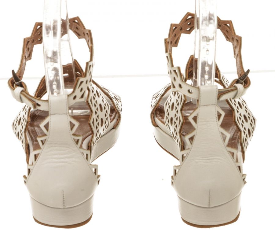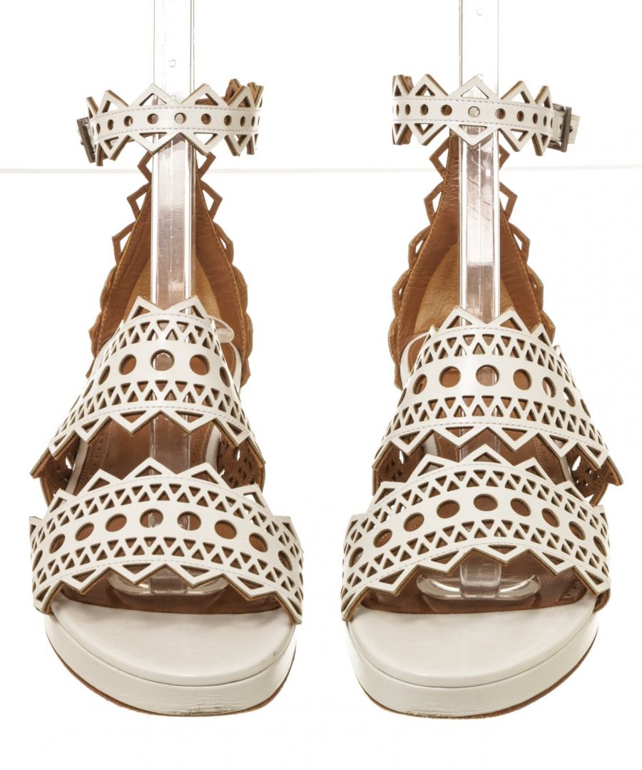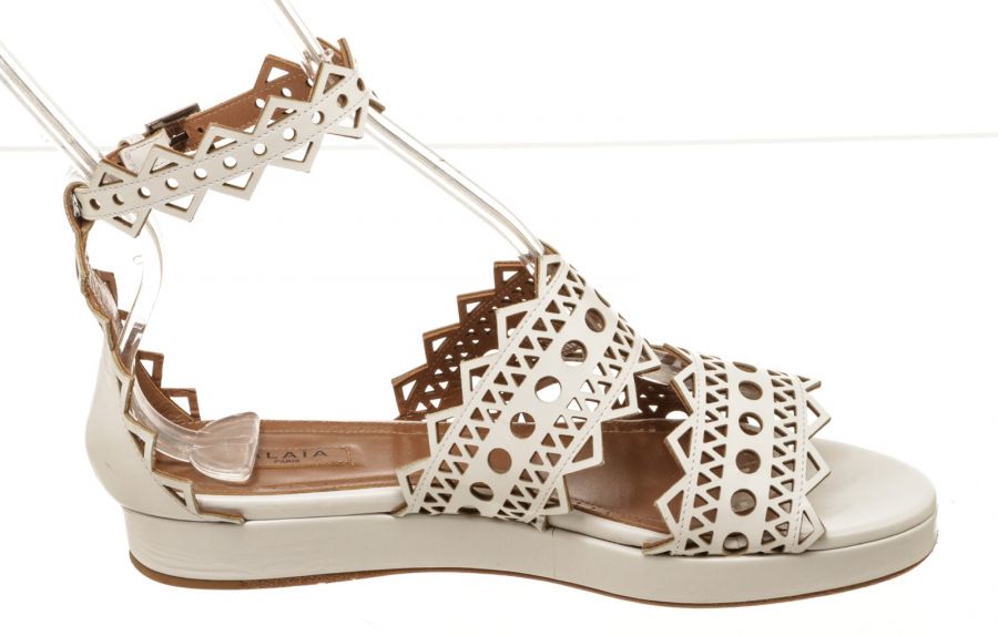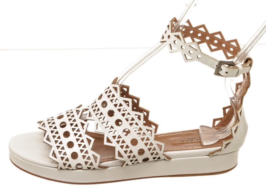 Step out in sophisticated style courtesy of these beautifully crafted white patent leather flats from Alaïa. Stunning in their simplicity, these white flat sandals feature an open toe, a buckle-fastening ankle strap and a flat sole, with a laser-cut design to finish. Add to distressed skinny denim or a classic A-line skirt to give everyday ensembles a timeless designer touch.