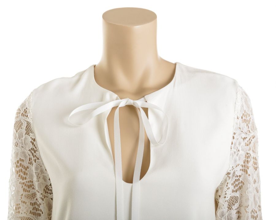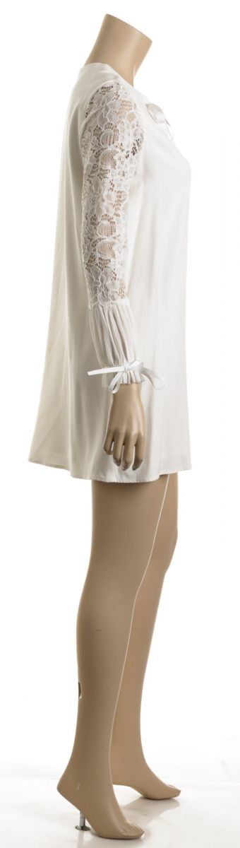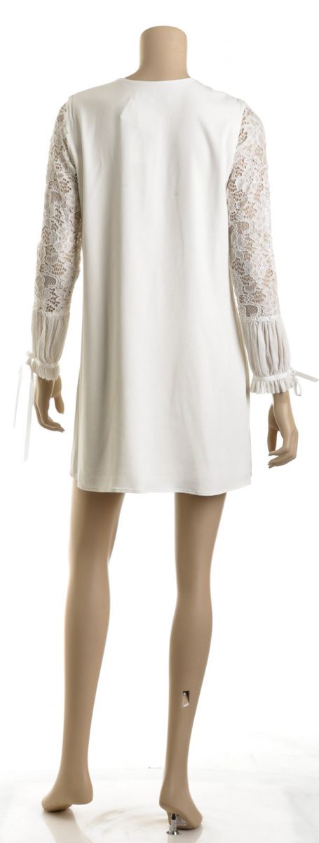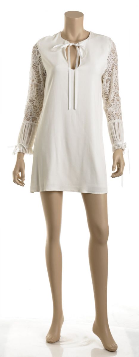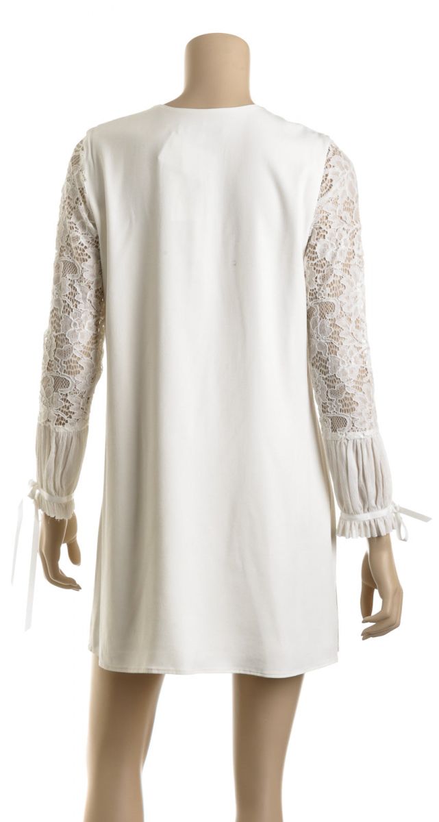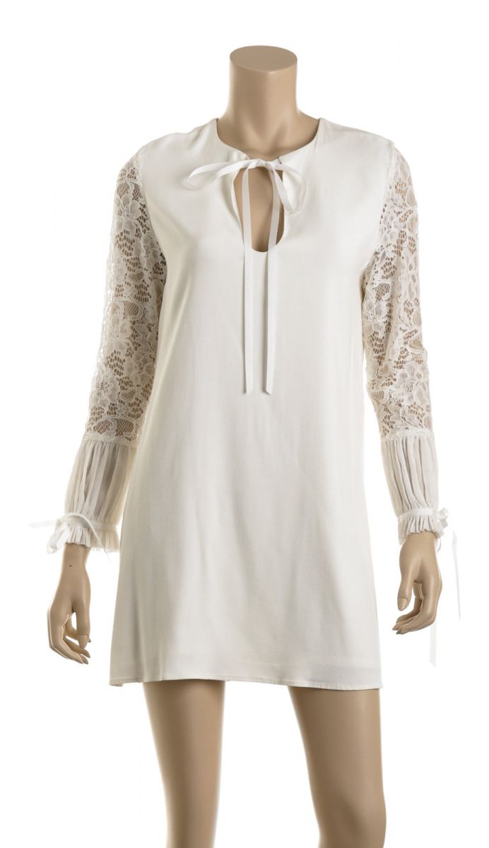 Alexis white crepe pull-over shift dress features lace and crepe peasant sleeves and a V-Neck that ties at the top. RC 493119 CR 9.13.19