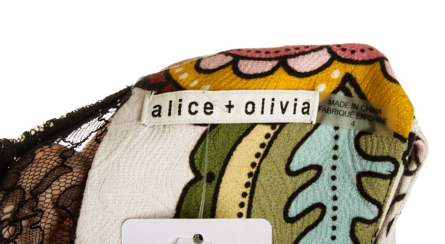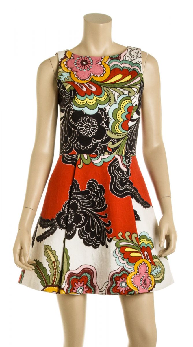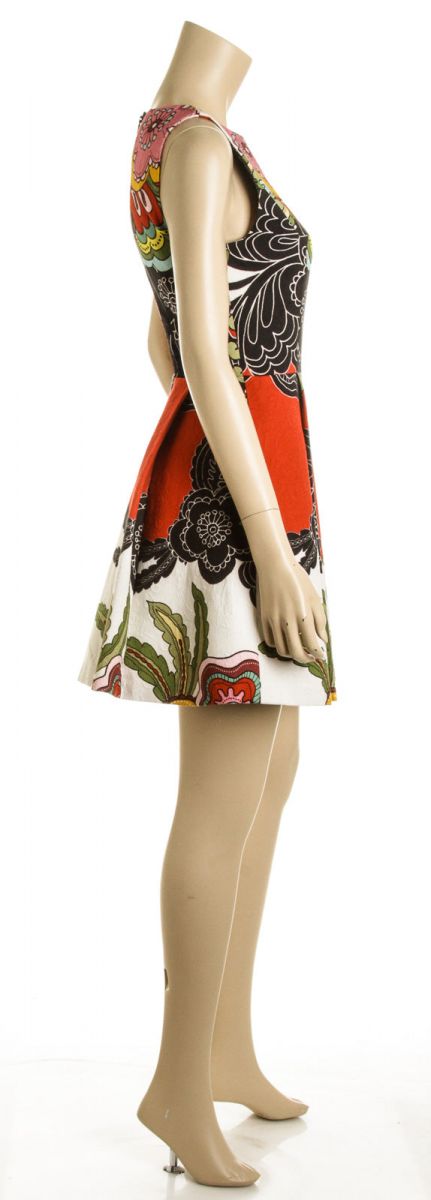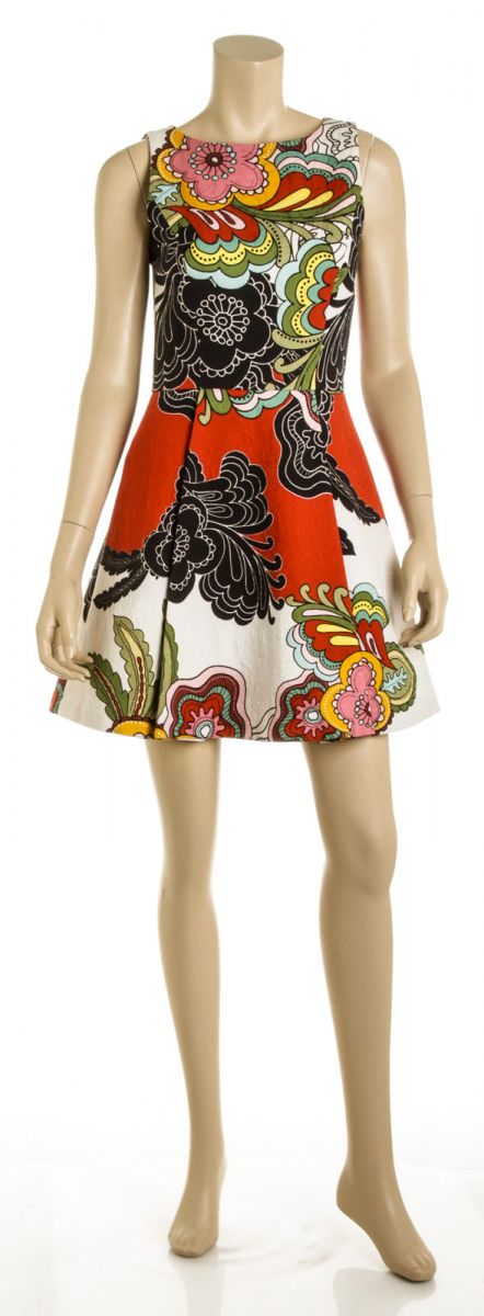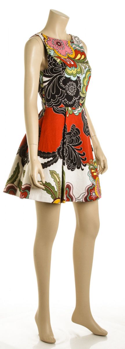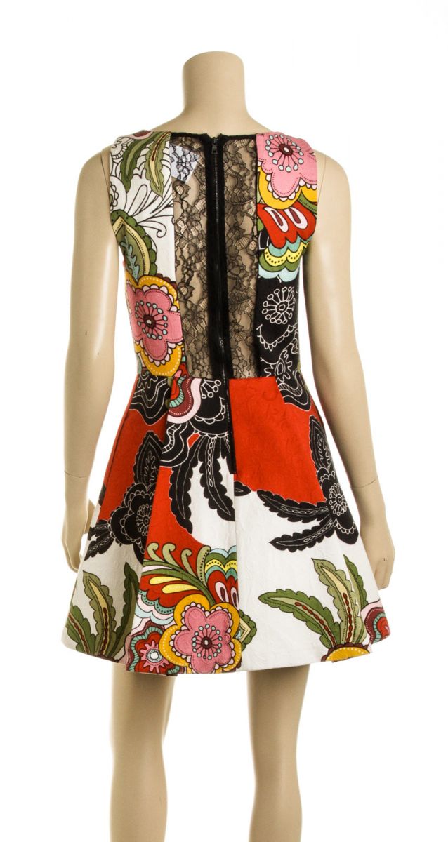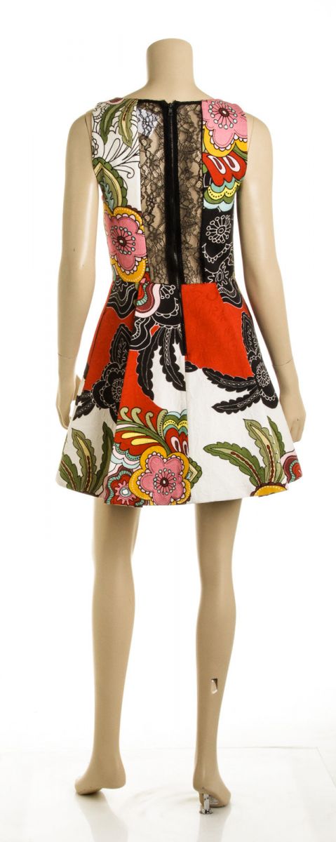 Be bold in this multicolor paisley floral print dress by Alice + Olivia! This A-line dress features hidden slit pockets, pleated skirt detail, and a black lace peek-a-boo cutout detail where the zipper enclosure is located.