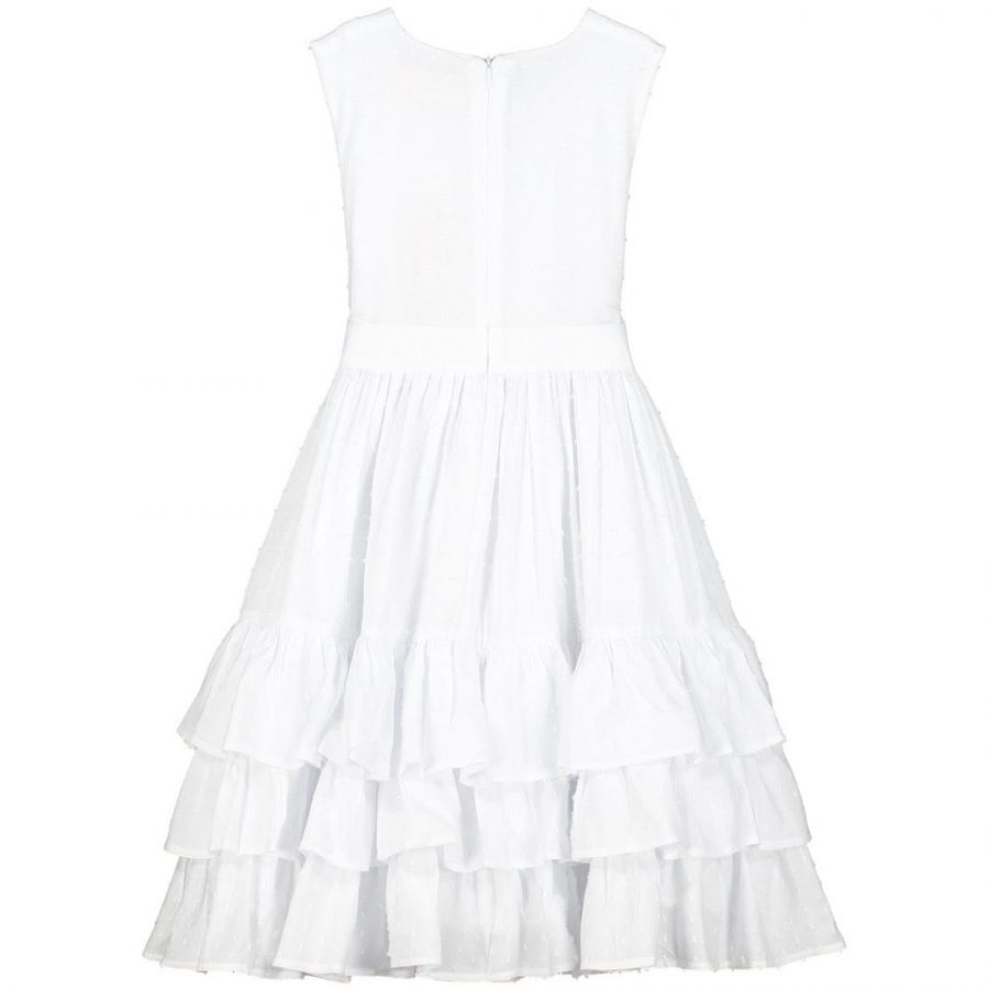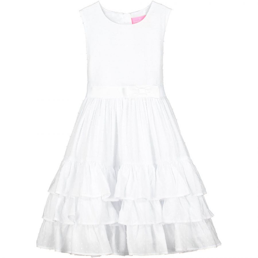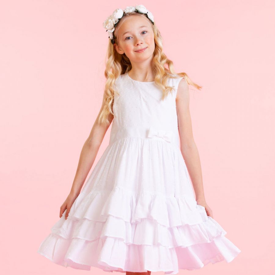 Girls fresh white cotton dobby frill hem dress with a white bow belt. The dress is sleeveless with a semi fitted bodice, gathered skirt at the waist and three gorgeous frills on the hem. The dress is knee length, fully lined in a cotton with an invisible zip back fastening.