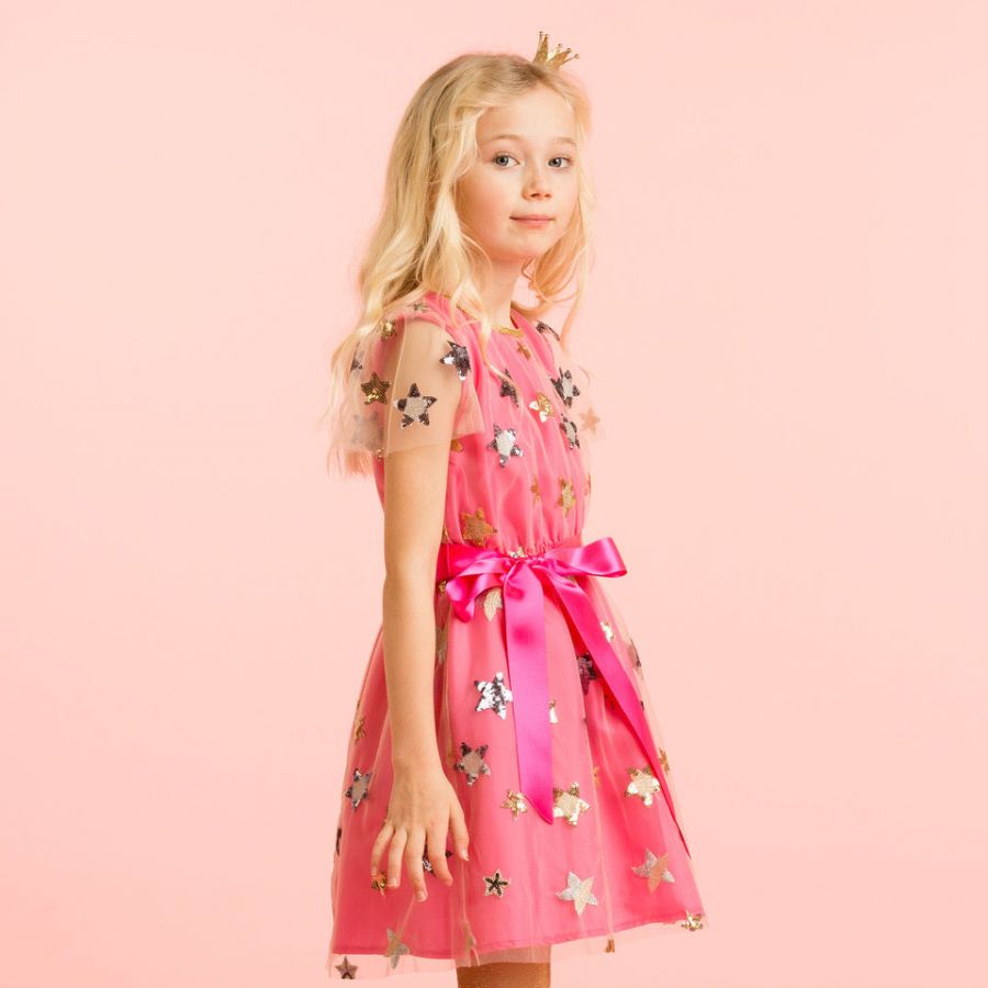 • Beautiful girls bright pink dress with twinkling stars made of embroidered sequins in gold and silver on a fine fluid tulle, lined with a bright pink silky fabric.