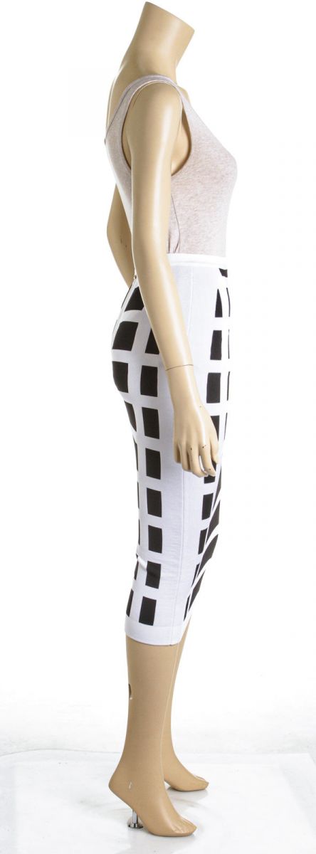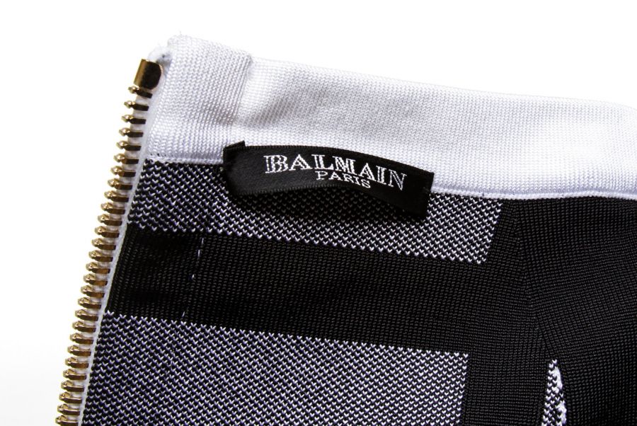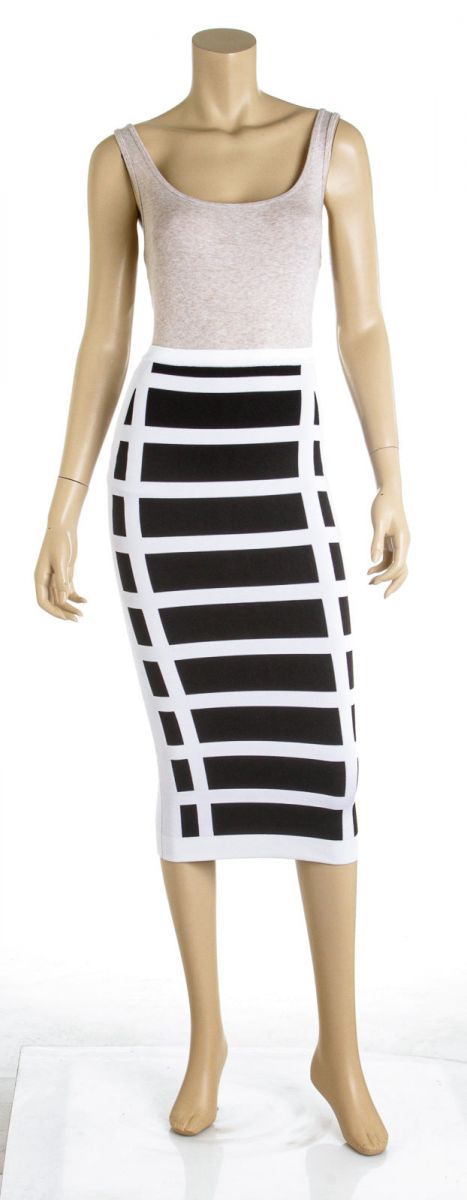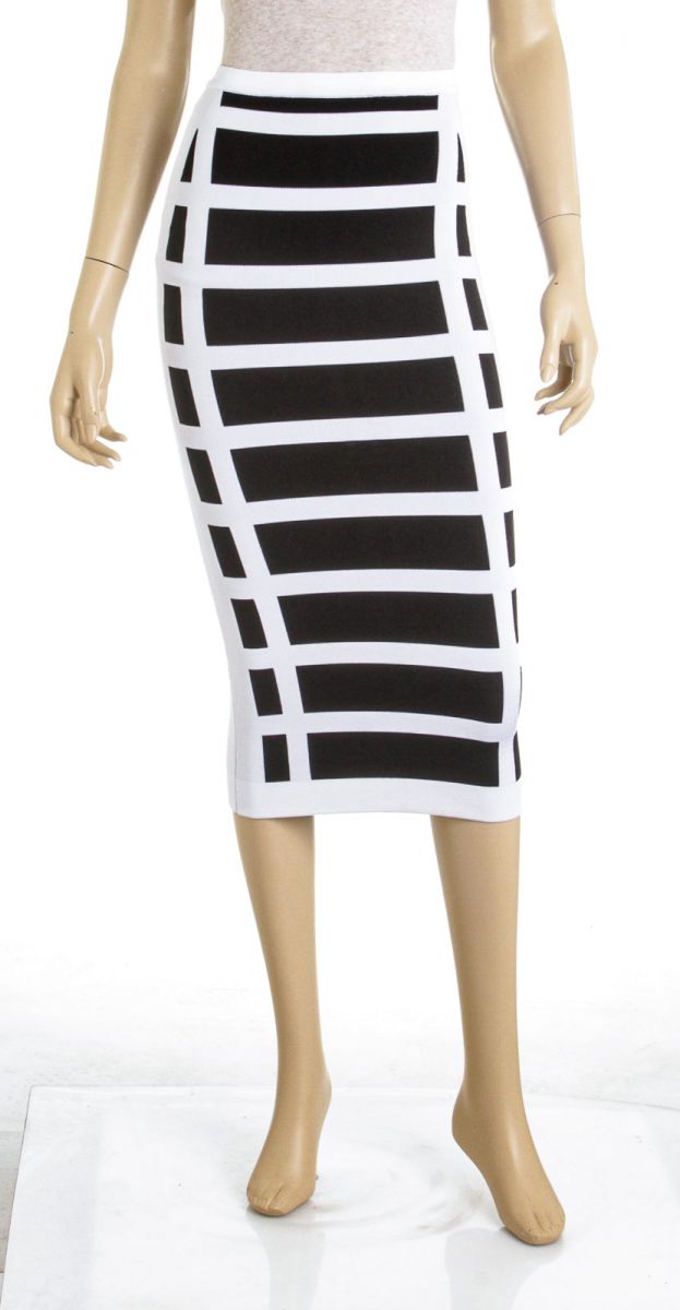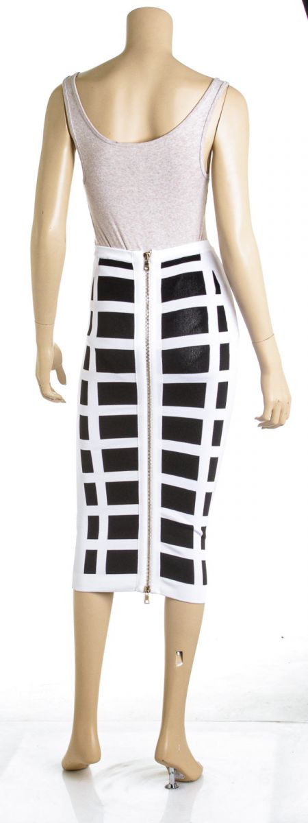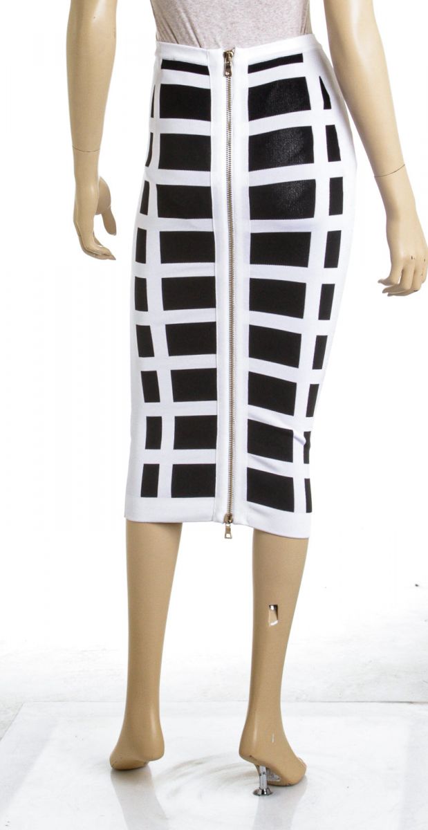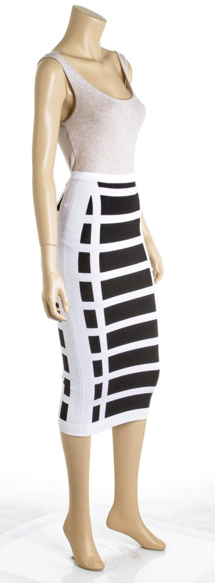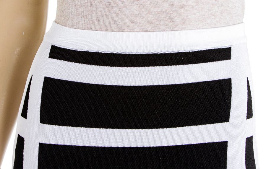 This Balmain skirt is decorated with black and white stripe print, it makes monochrome dressing as easy as can be. Features a two-tone detail and elastic waistband, high rise, exposed back zip closure and body conscious silhouette.