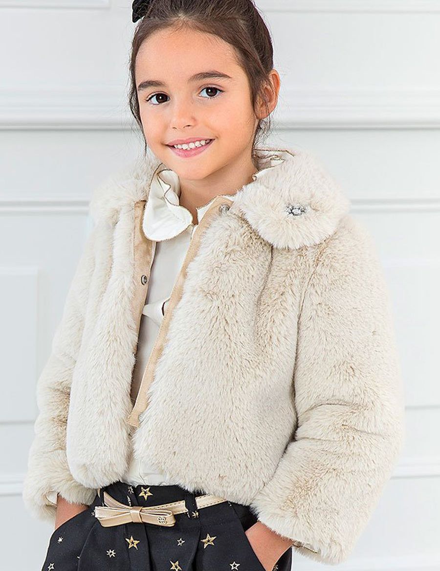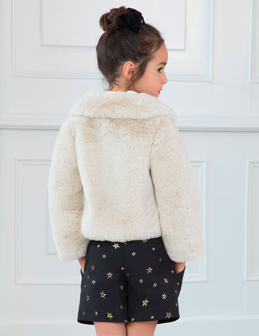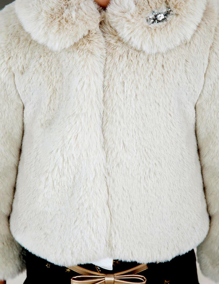 Stylish short fur coat with matching collar. Clasp on the front. Jewel ornament on the neck flap. Faux Fur.
