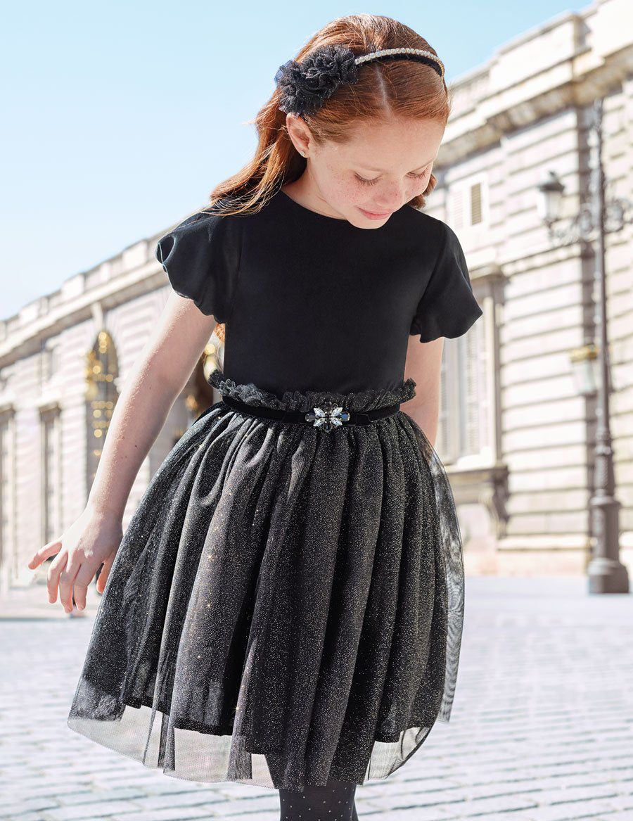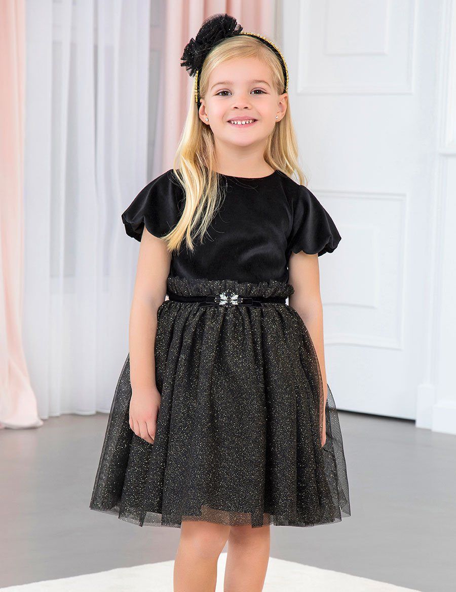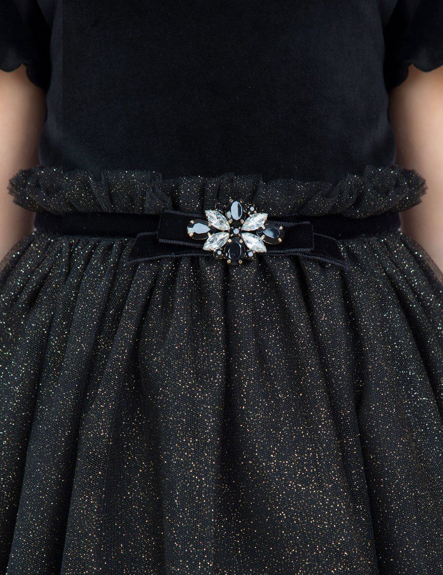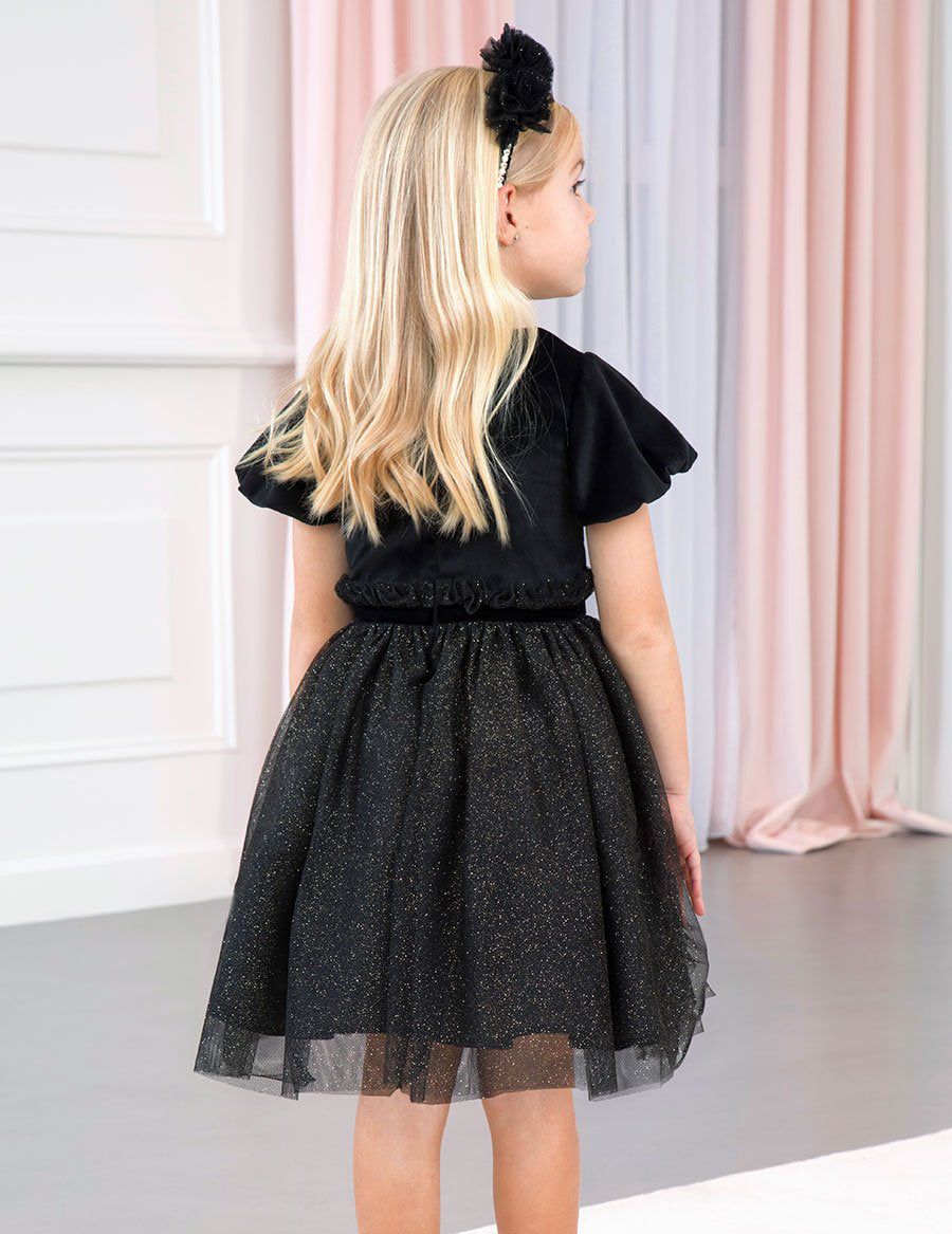Elegant velvet dress with tulle skirt for girl. The garment is short-sleeved with a collected effect. The waist has a decorative lacing made of velvet and jewel application. The back has an invisible zipper closure. Ideal to wear this fall / winter on special occasions.