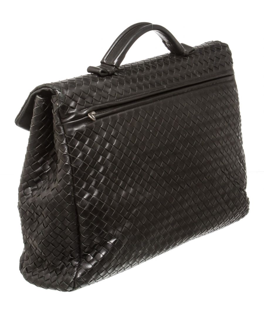 Crafted from black Intrecciato leather, this Bottega Veneta briefcase features a leather top handle, silver-tone hardware, exterior back zippered pocket and push lock closure that opens to two divided interior compartments TRD 487699 MP 1.22.19