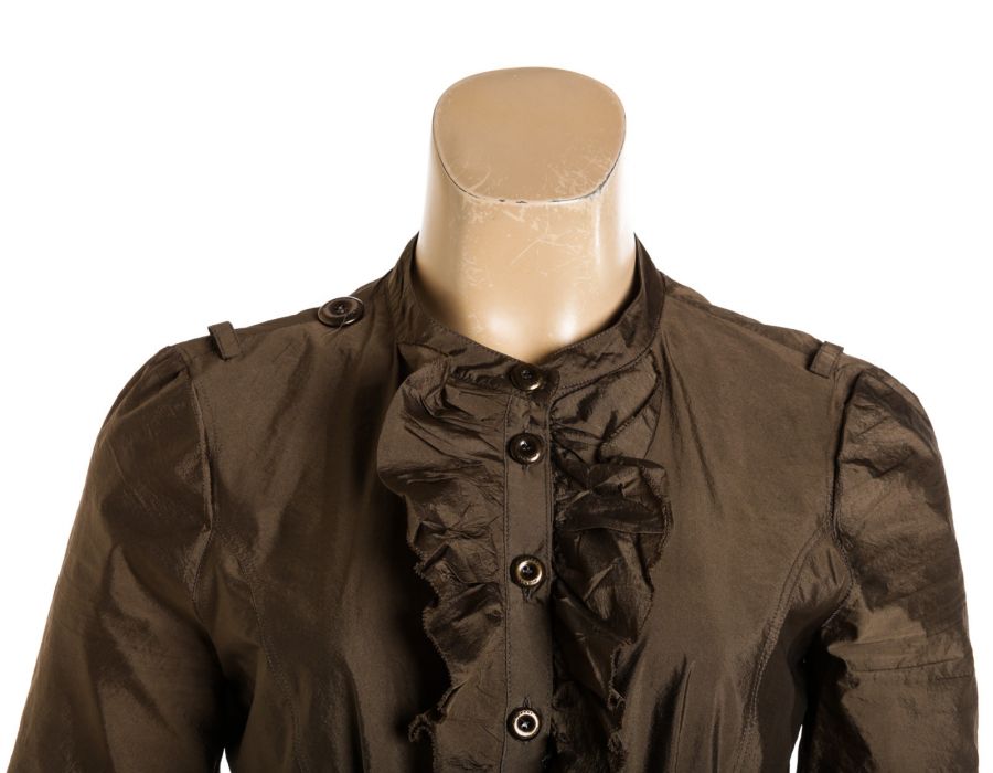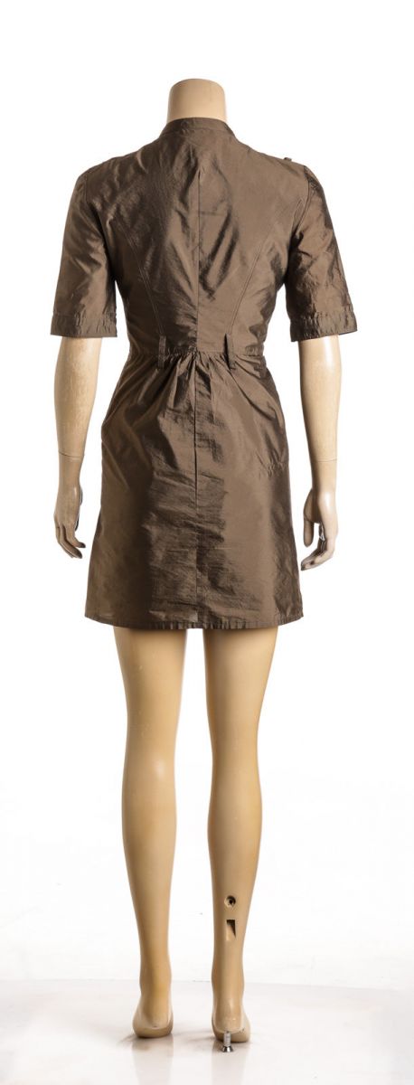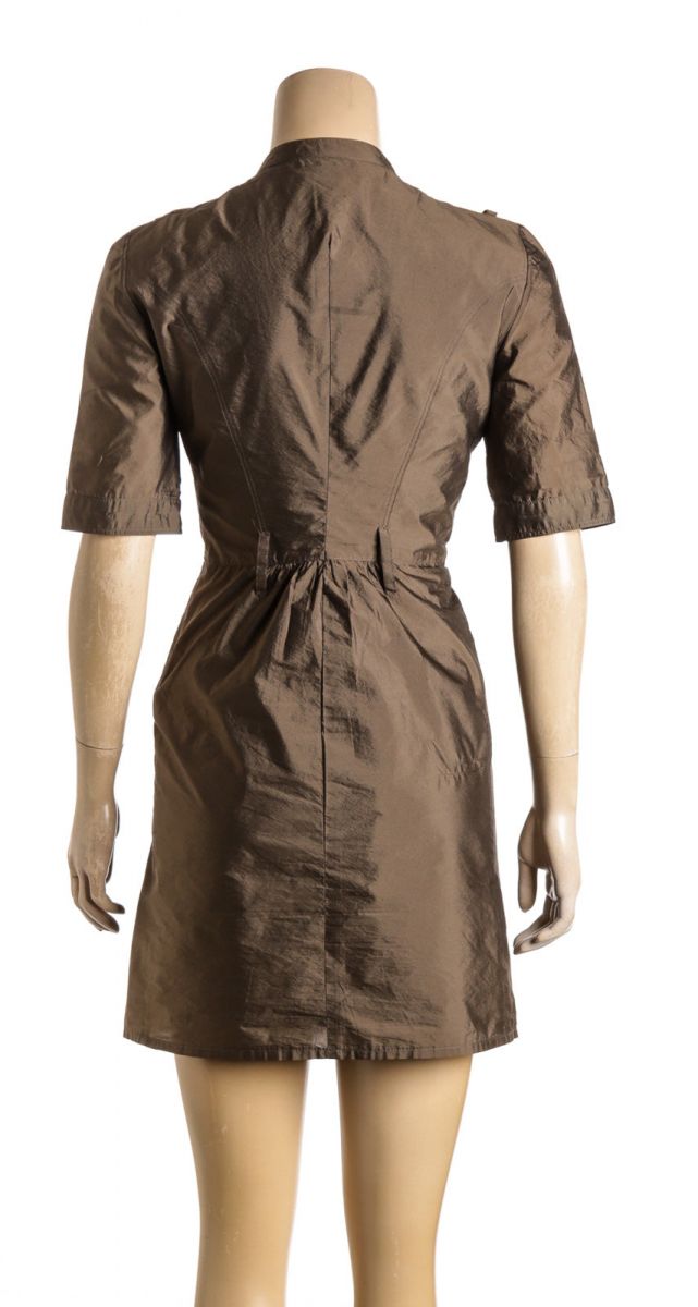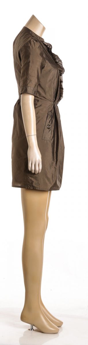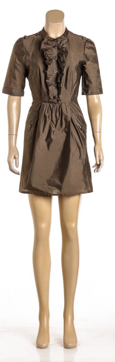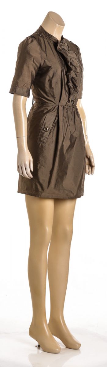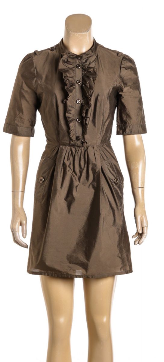 Olive green Burberry dress that features front button and ruffle accent, concealed side zip fastening, round neck, tapered at the waist and two slit pockets. RC 484637 MP 9.14.18