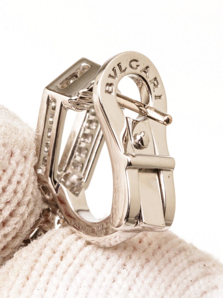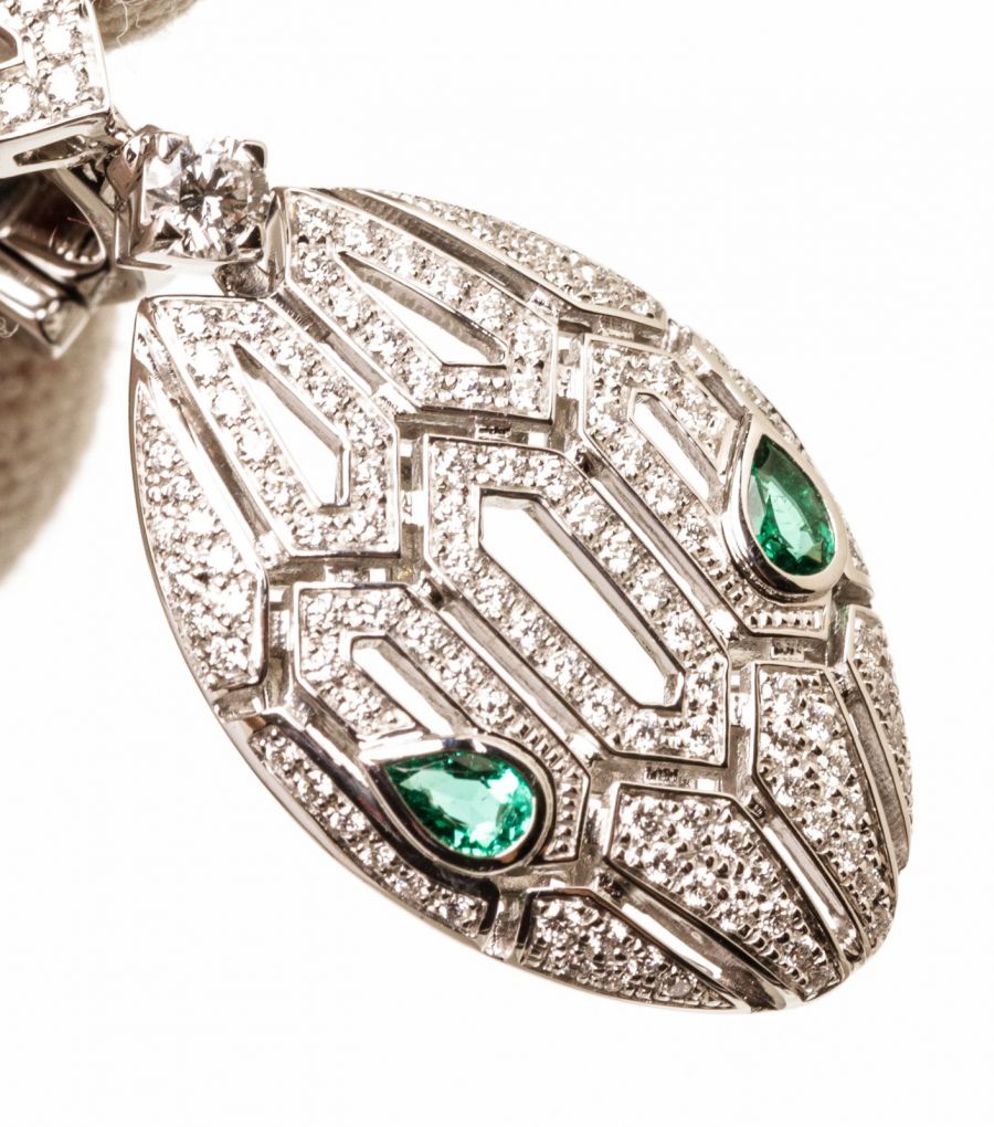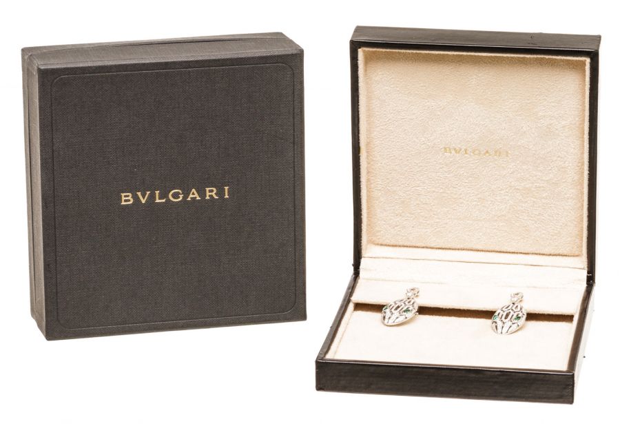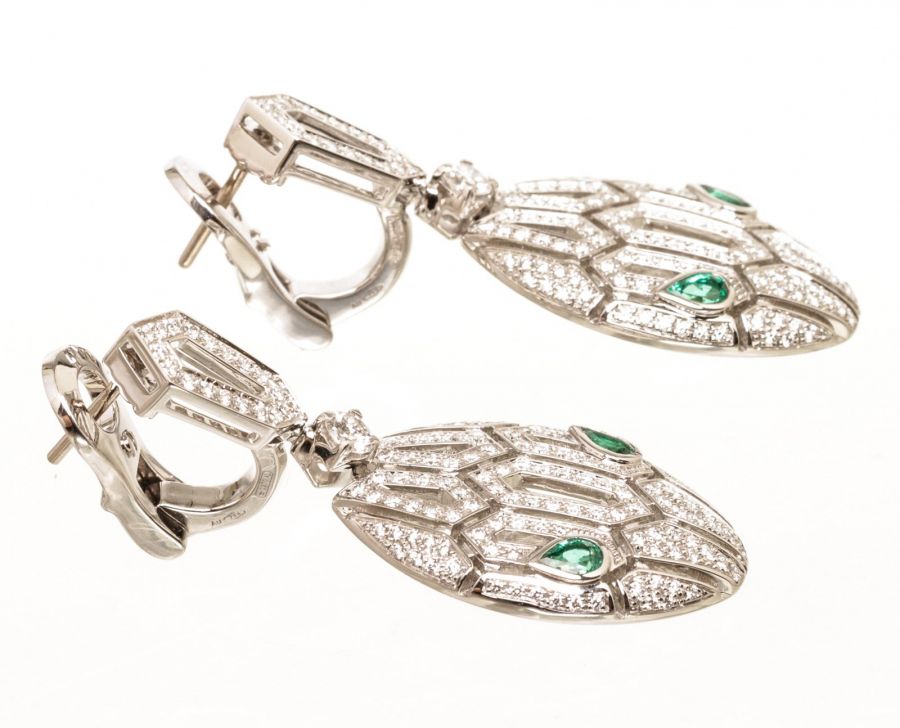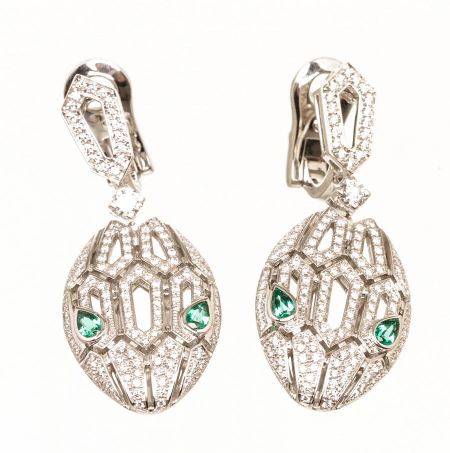 Bvlgari Earrings. Serpenti series. Metal Type: White Gold. These Bvlgari Serpenti earrings are crafted in 18k Whitegold with Emerald stone Eyes and pave diamonds shaped into a snake head design. Made in Italy.