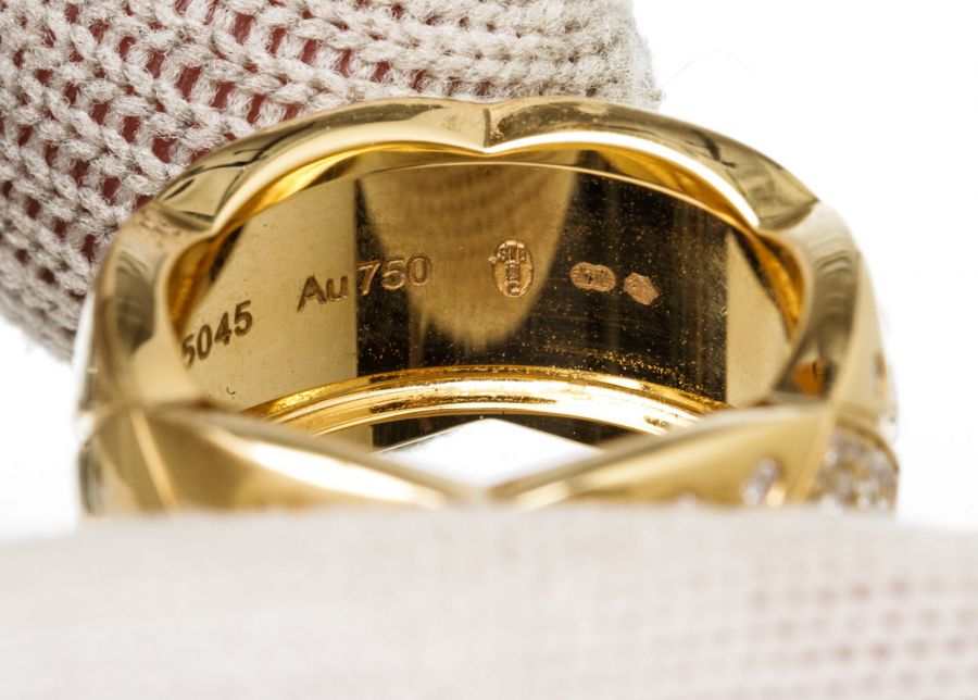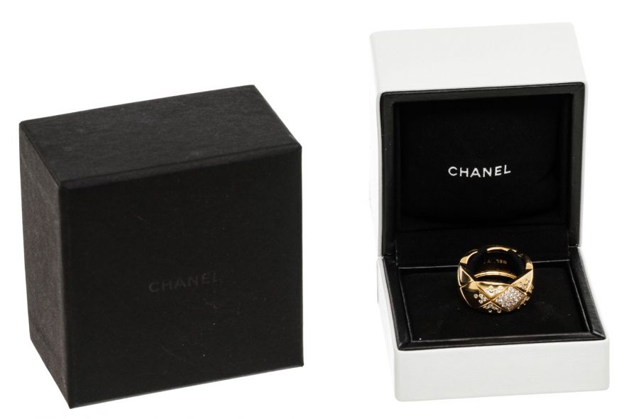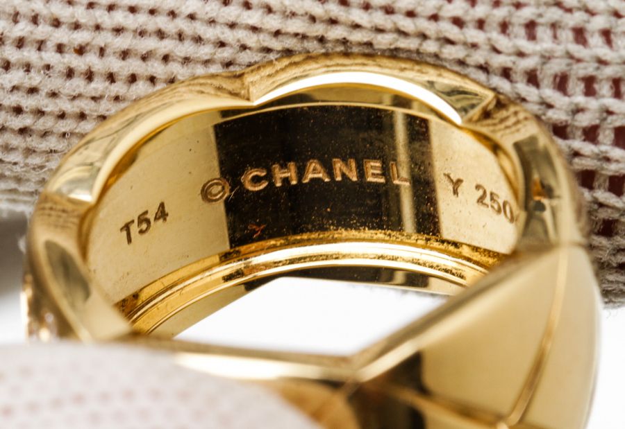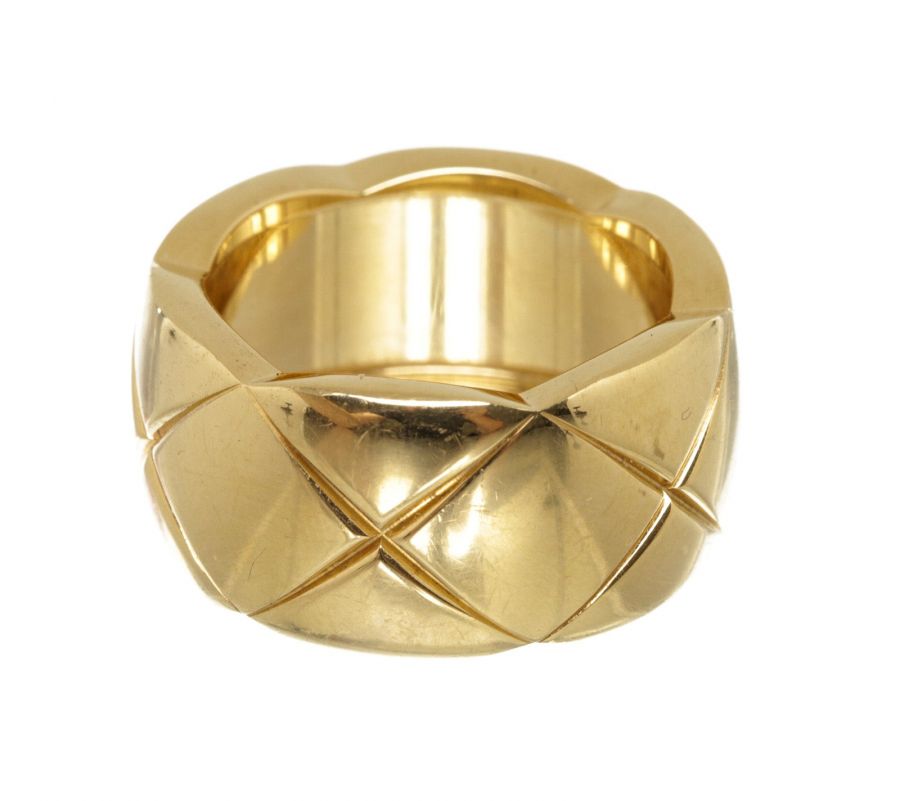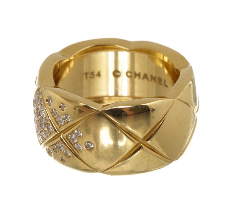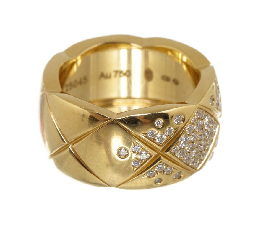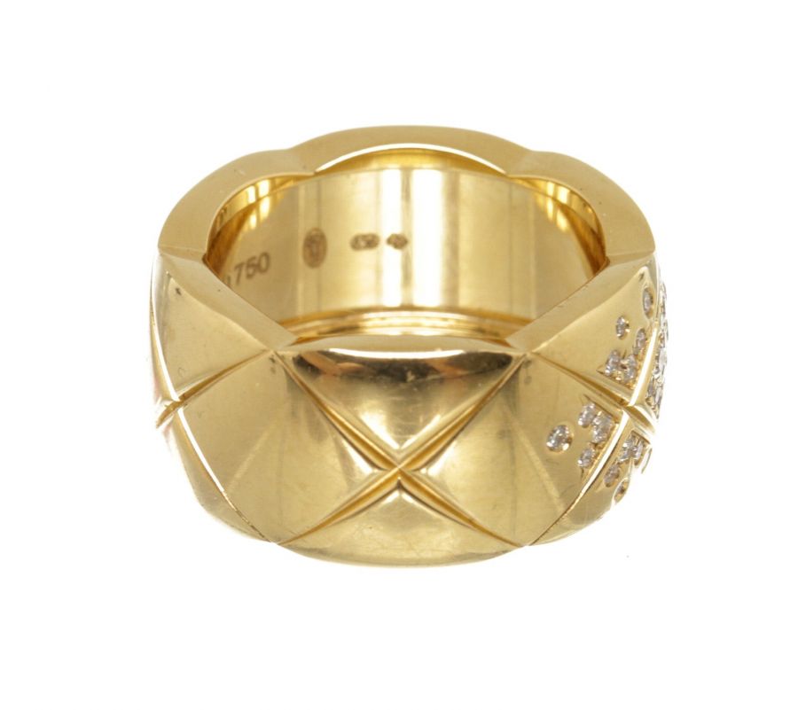 From Chanel's fine jewelry collections, the Coco Crush Collection, combines alternating incisions of a quilted pattern—the emblematic motif of the House since 1955. This Coco Crush ring, large version is designed in 18K yellow gold with diamonds. This gorgeous ring with the timeless style only from Chanel!