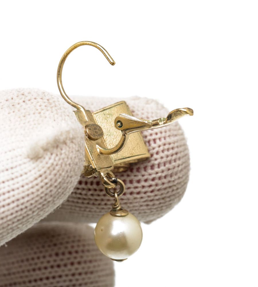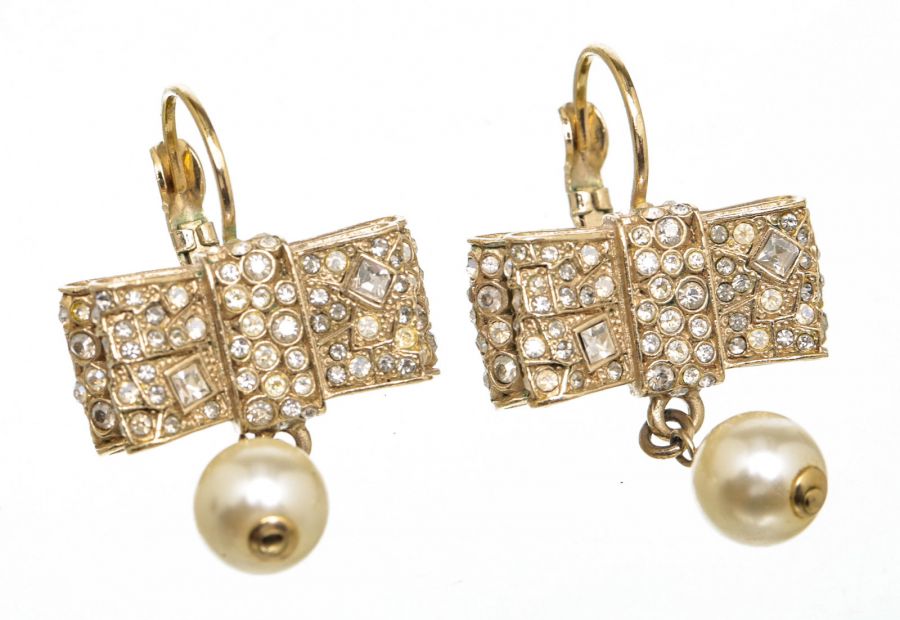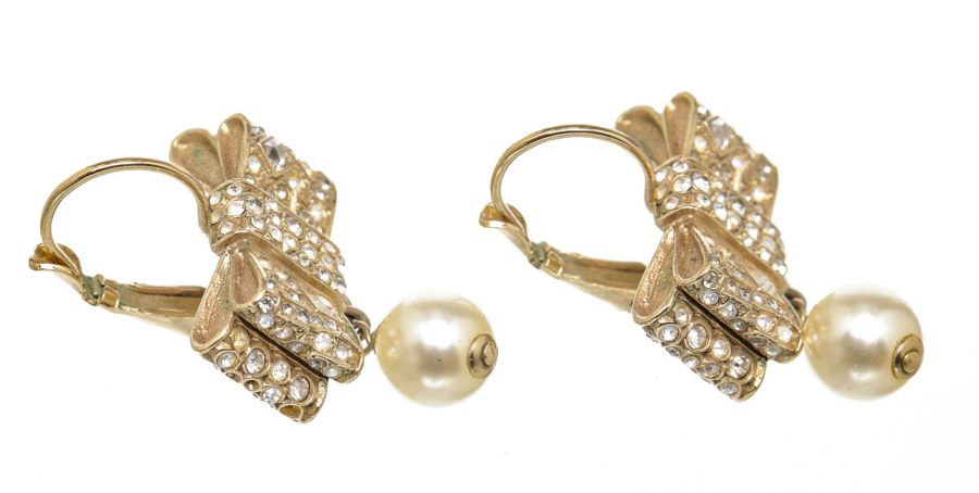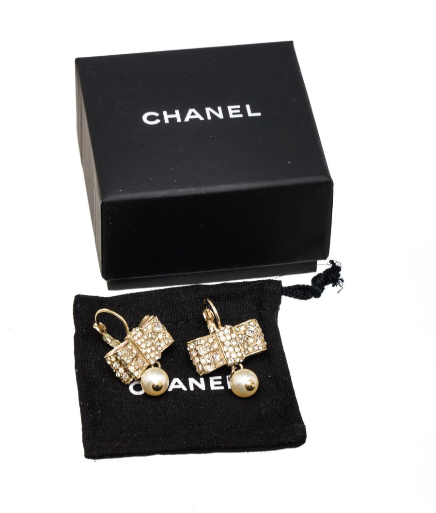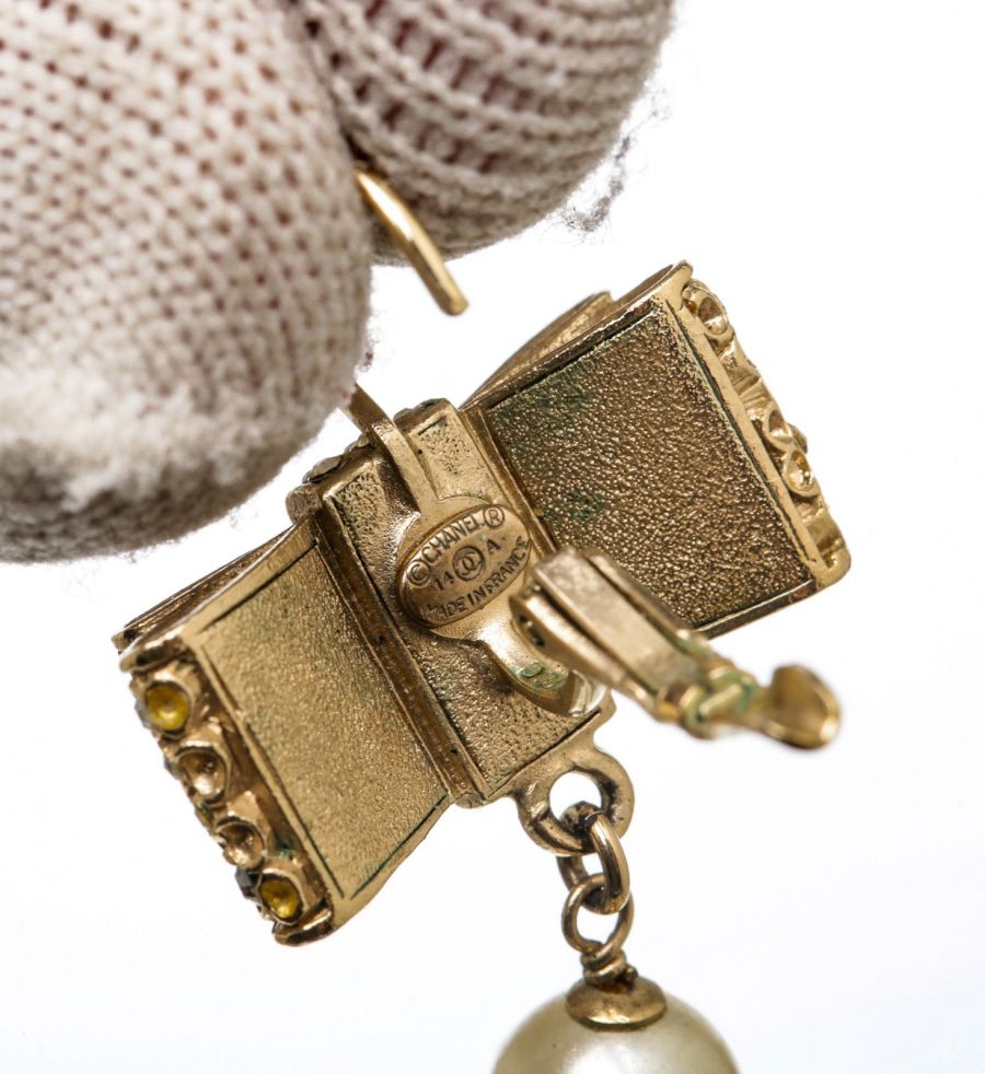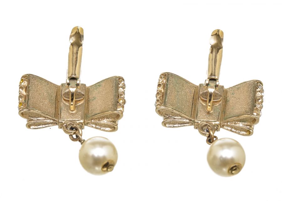 A must for any Chanel jewelry collector! These pretty and whimsical earrings are gold plated and feature a crystallized bow and have a dangling pearl drop.