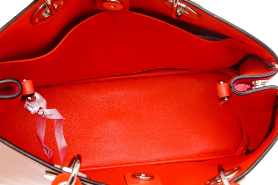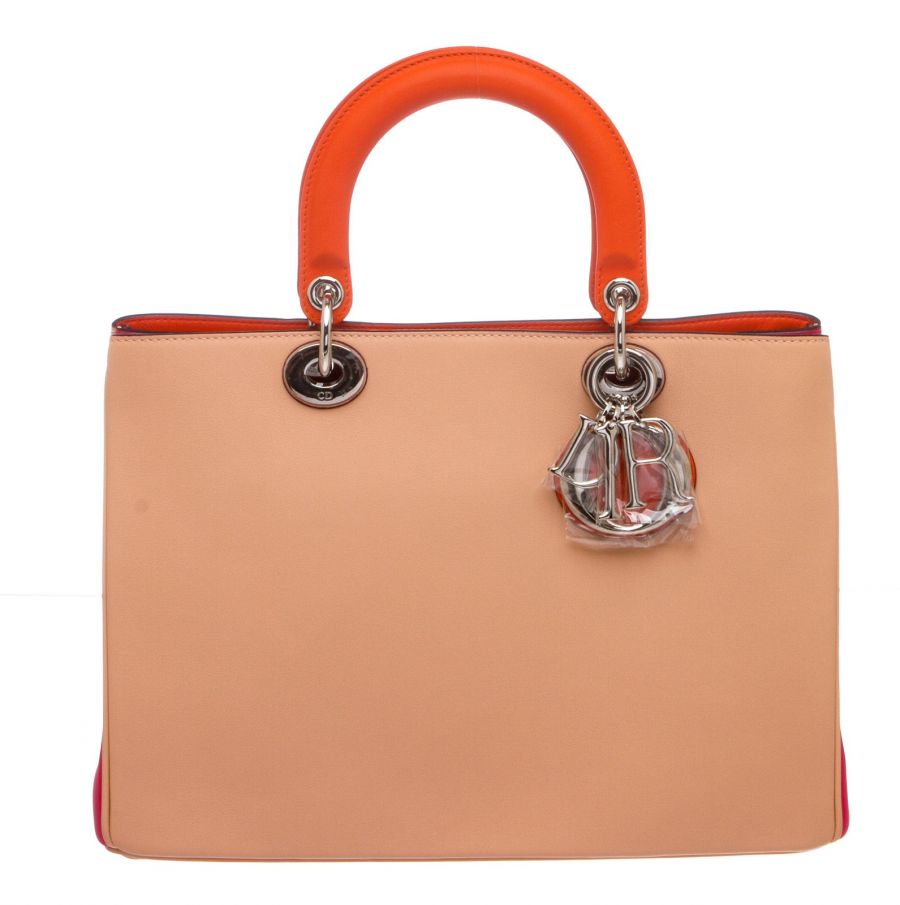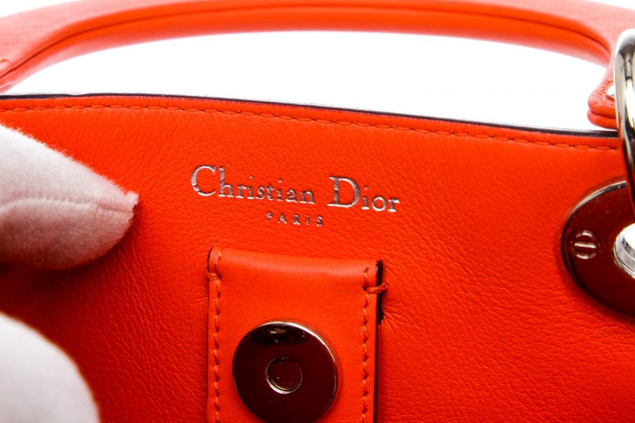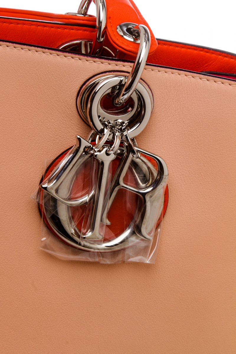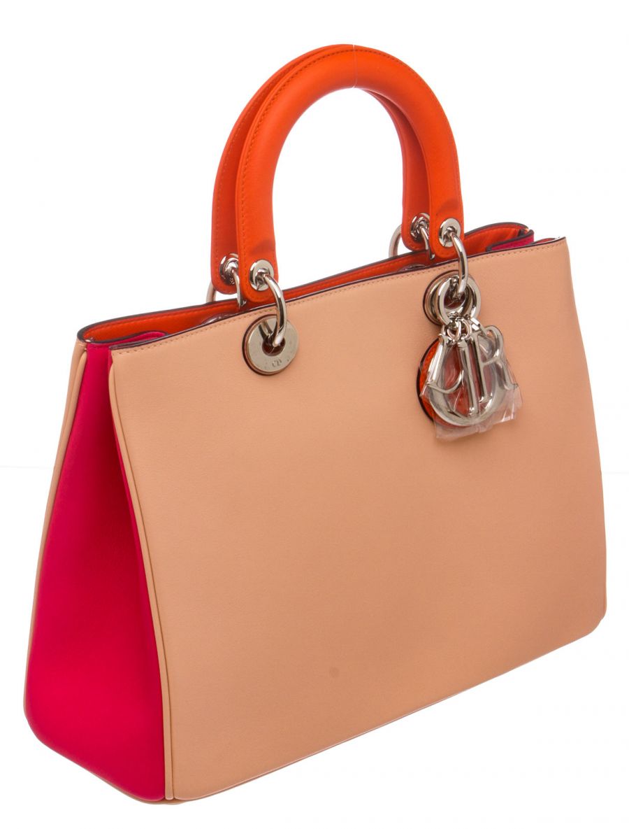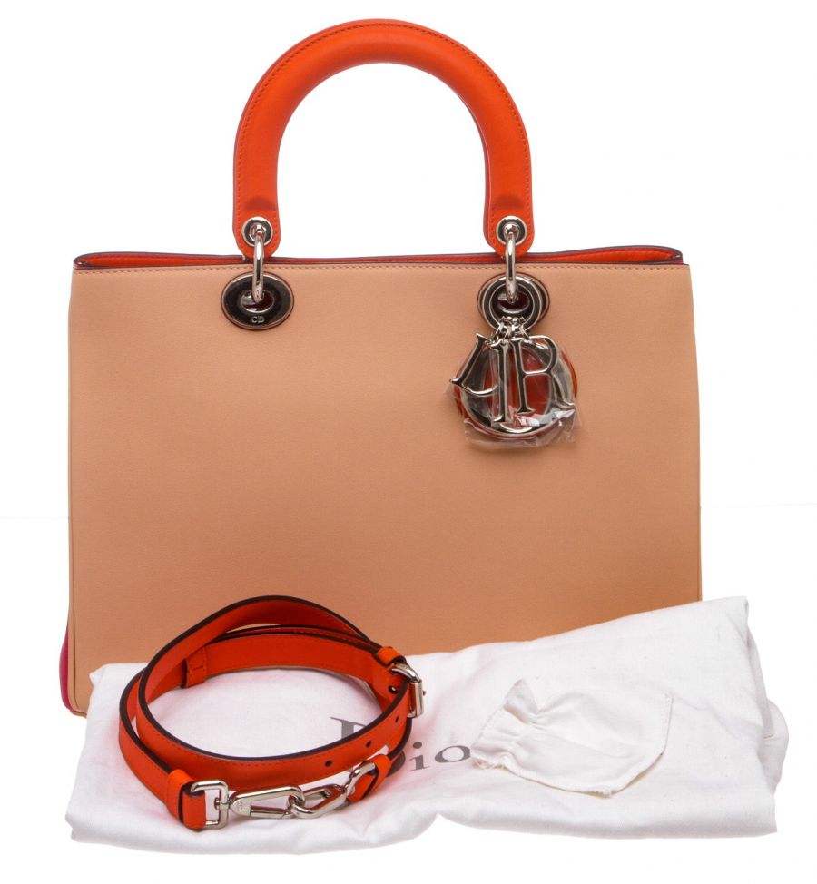 Christian Dior "Diorissimo" bag in soft calfskin that features silver-tone hardware, peach front, back and bottom panels, hot pink side panels, bright orange strap and handles and interior. Inside is entirely lined in calf leather and comes with a zippered pouch. Included: Dustbag, Shoulder Strap SC 494282 MP 10.15.19