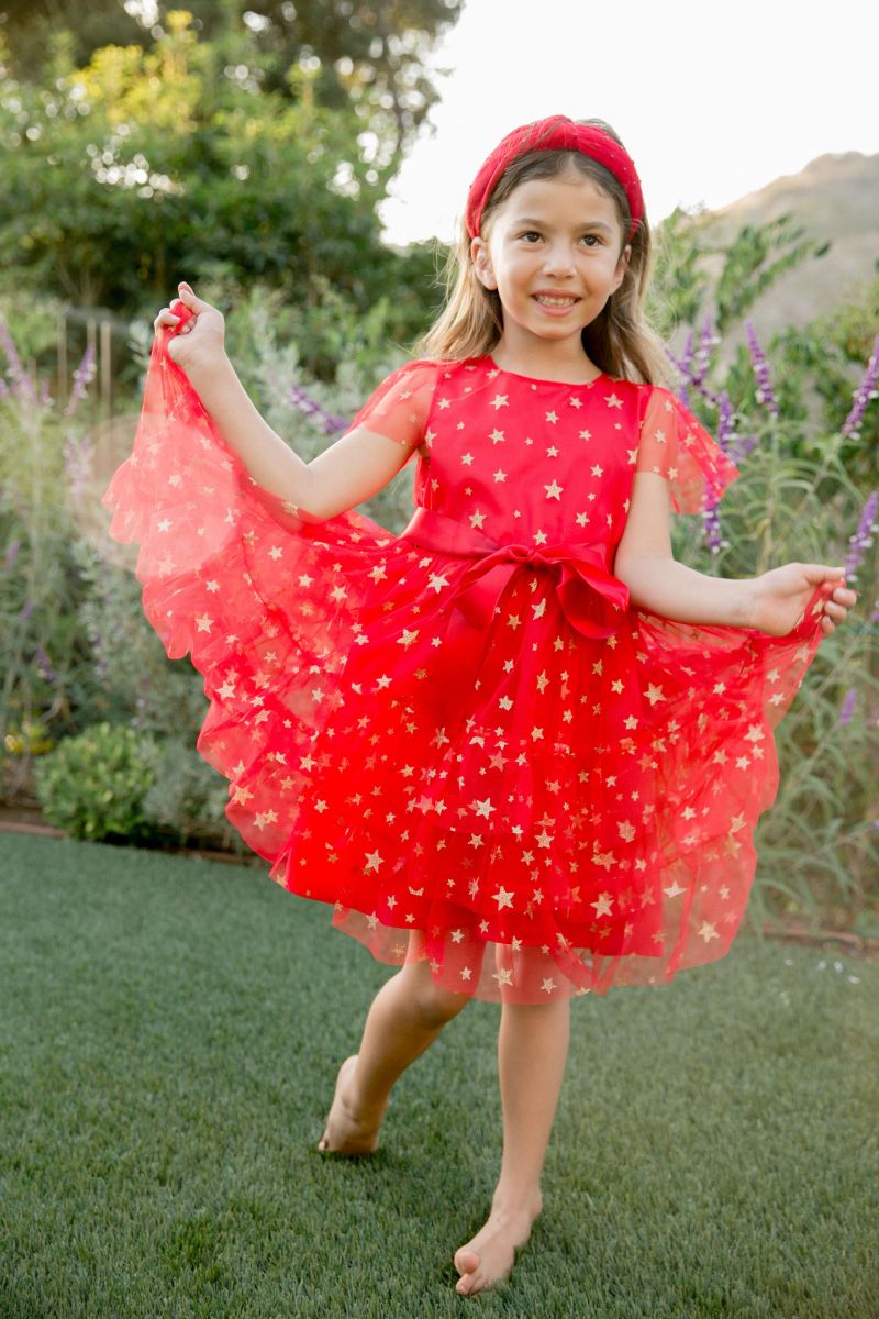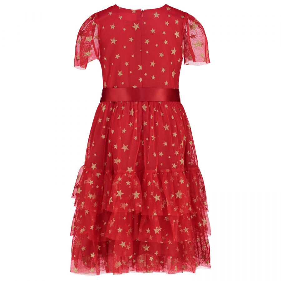 • Girls party dress in beautiful red tulle with twinkling gold stars and frill ruffles on the skirt make this every girls favourite party dress for the Christmas holiday and festive season.