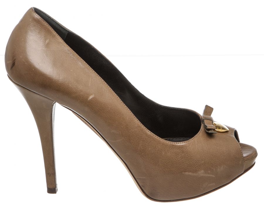 Taupe leather peep-toe pump that feature a hidden front platform, bow and gold-tone heart charm detail at the vamp, covered heel and leather sole. Included: Box RC 492656 MP 10.10.19