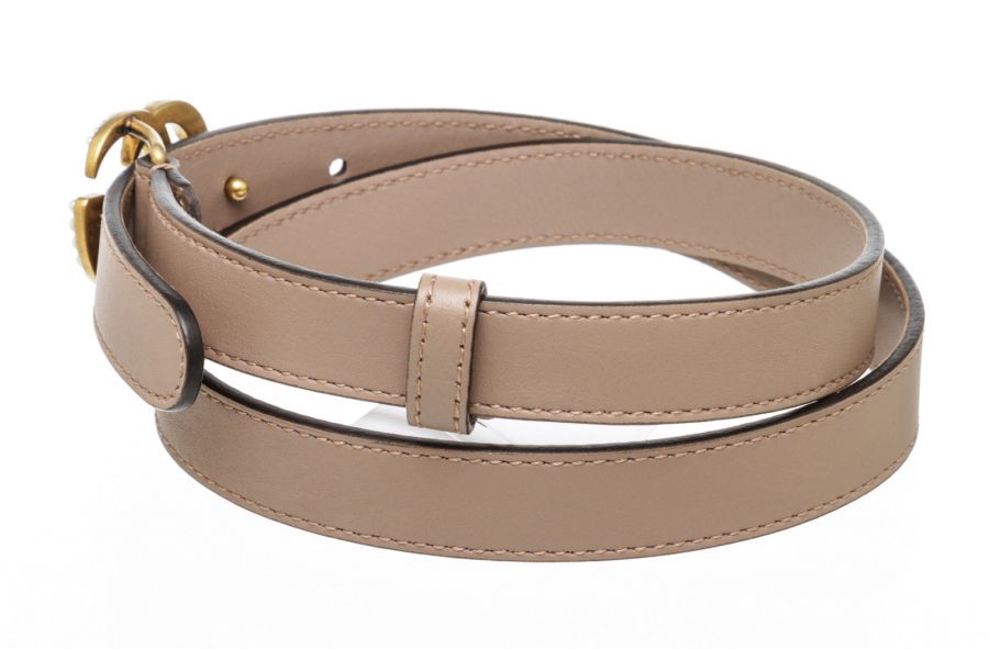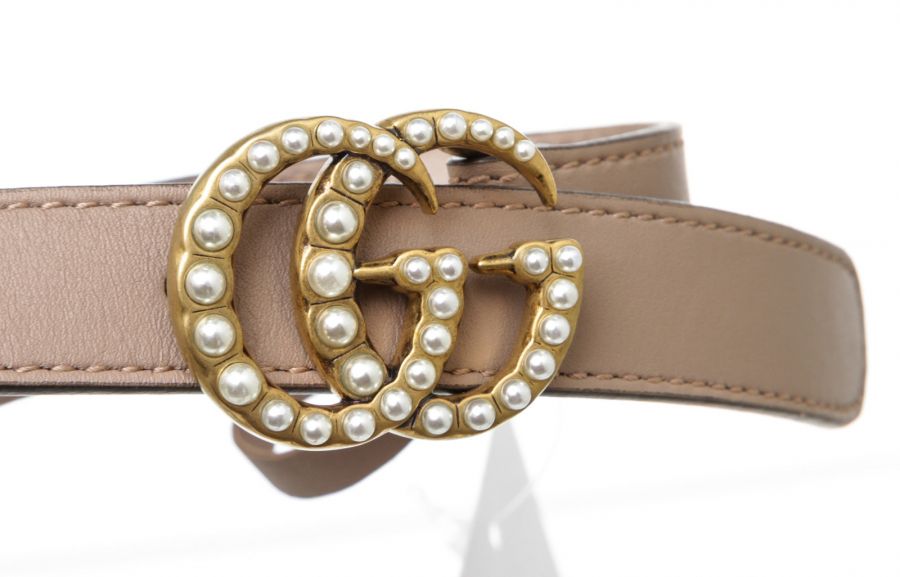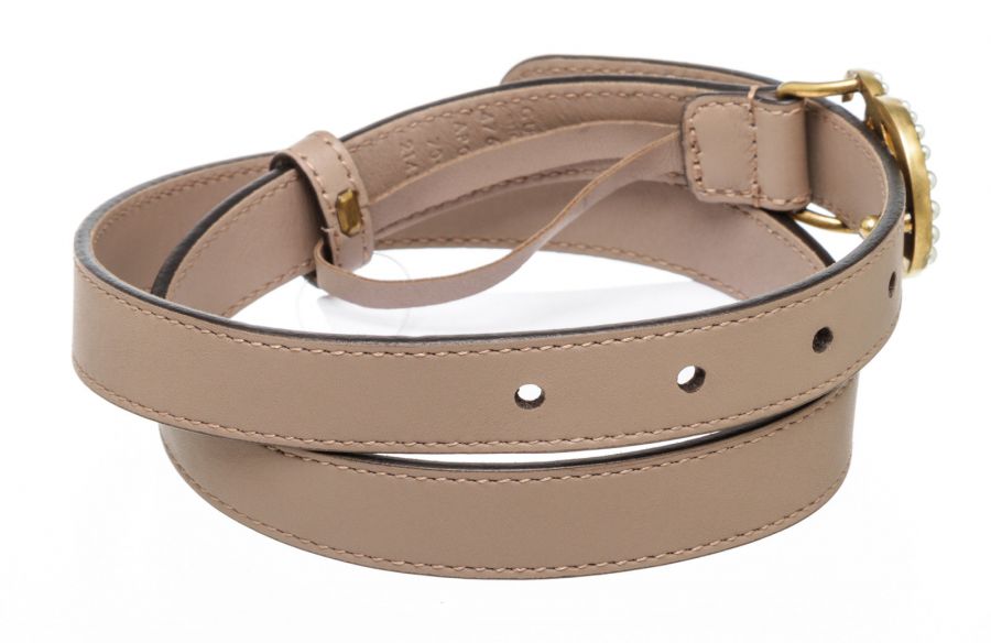 100% Authentic This stylish Gucci belt is crafted in Italy from light pink calfskin leather. The buckle features the trendy interlocking GG in polished brass hardware, further enhanced with pearl effect studs. This belt can be worn at the hips or the waist for an effortless everyday look. RC 499526 J.R. 7.26.20 Measurements: Buckle: 1.5" x 1.25" Belt Width: 0.8" Condition: Pre-owned in Excellent Condition