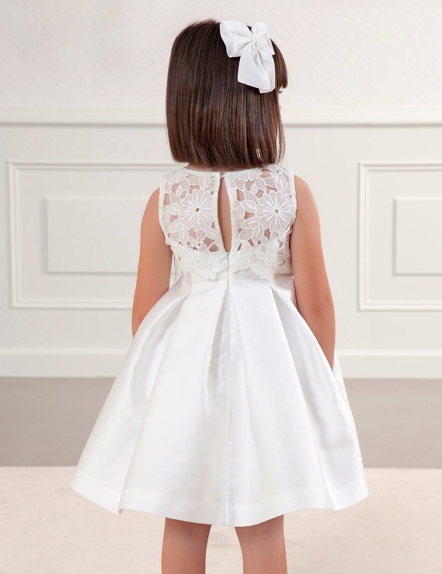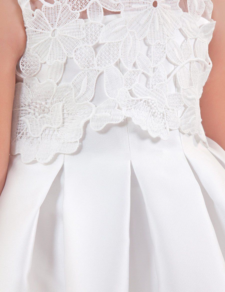 Delicate and exquisite dress made with an elegant body in guipure, skirt made with mikado with lining and semi-cancan tulle to give more body to the skirt. Cut to the waist with interns. Zip closure on the back. Skirt with creases made at the waist.