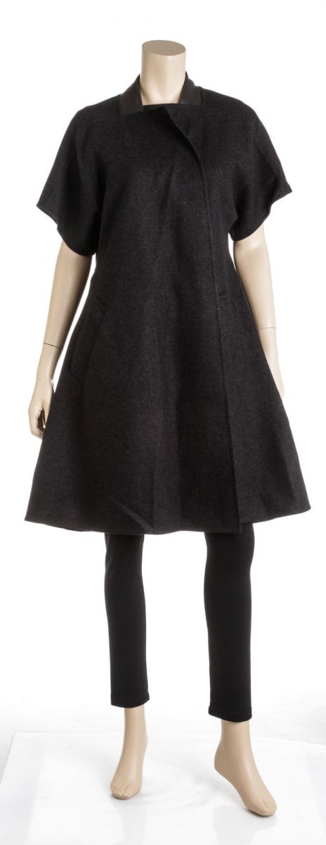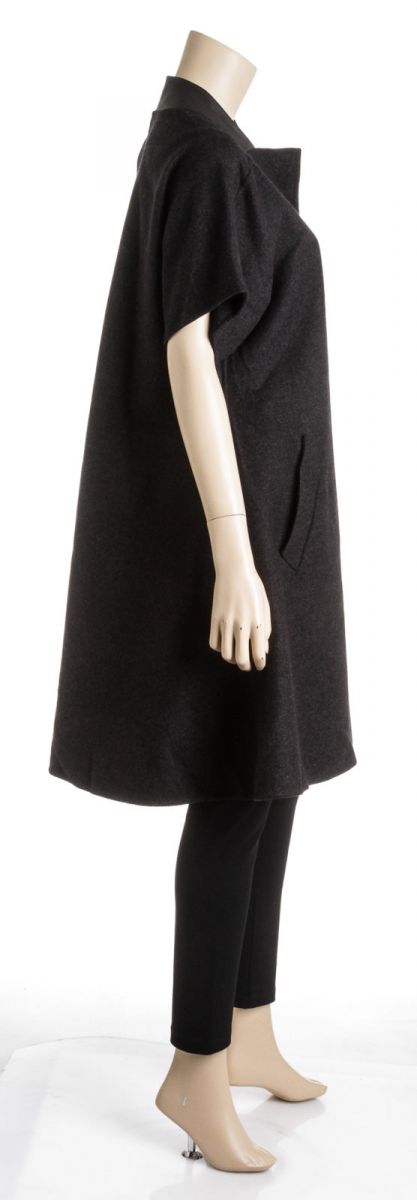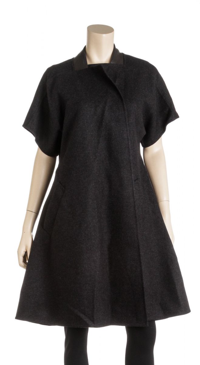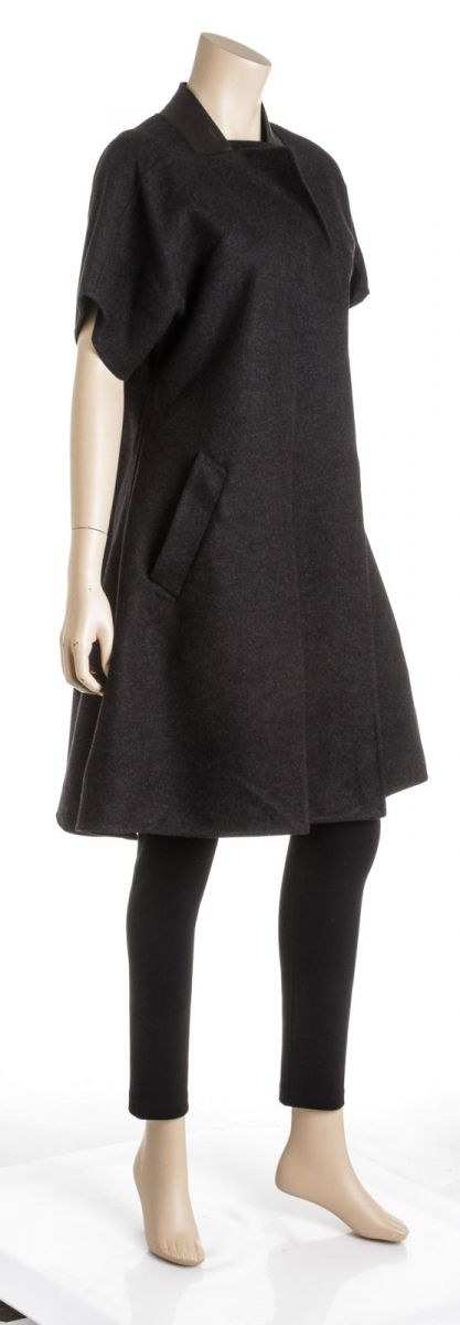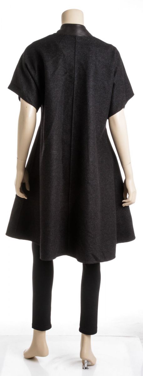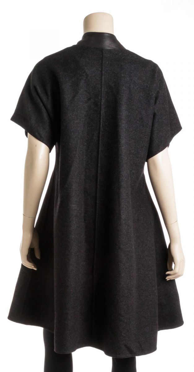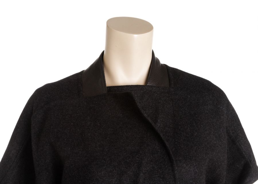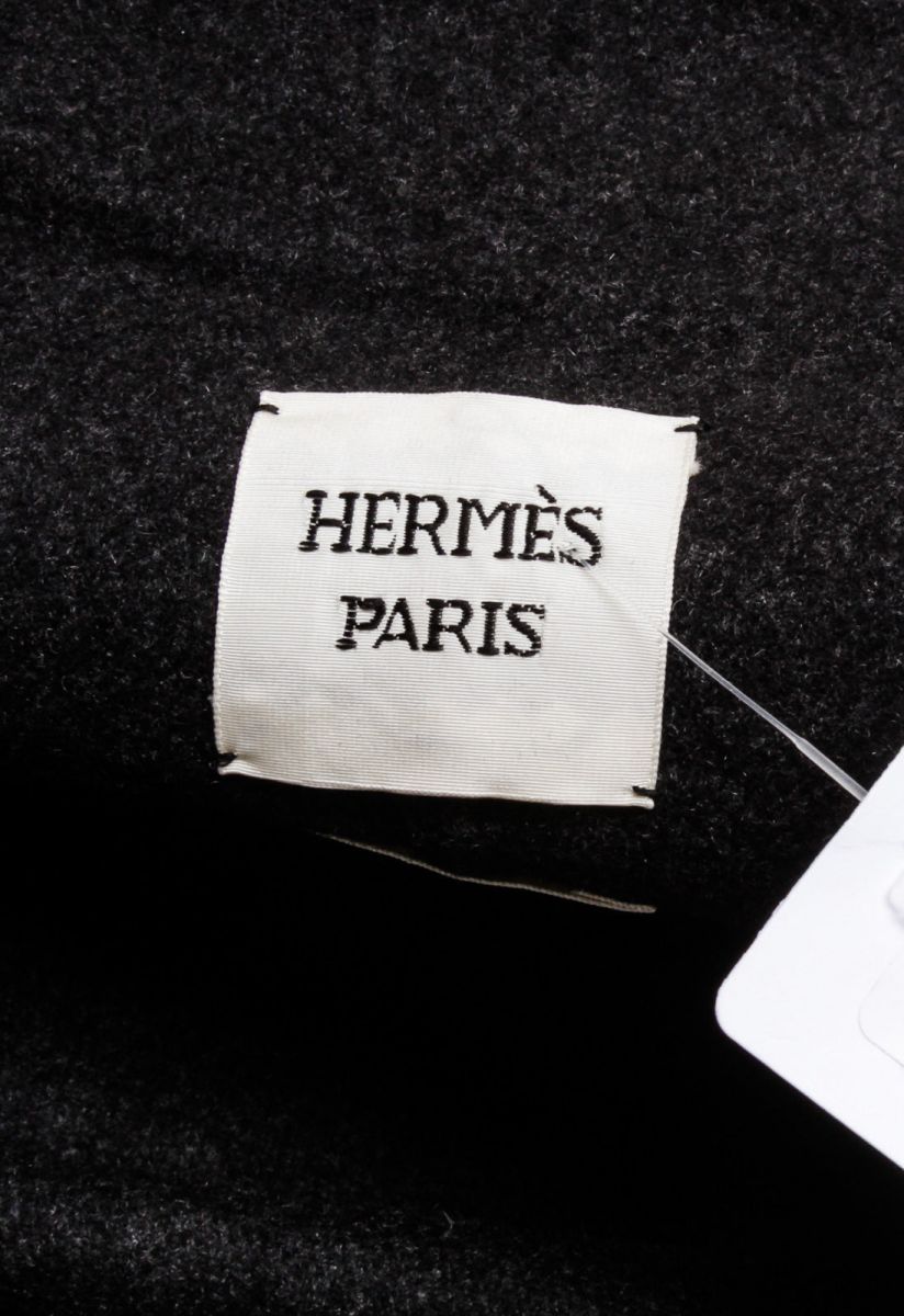 An oversize dark gray Hermes open front jacket with a fit and flare silhouette, tonal leather collar accent, waist pockets and a straight hem.