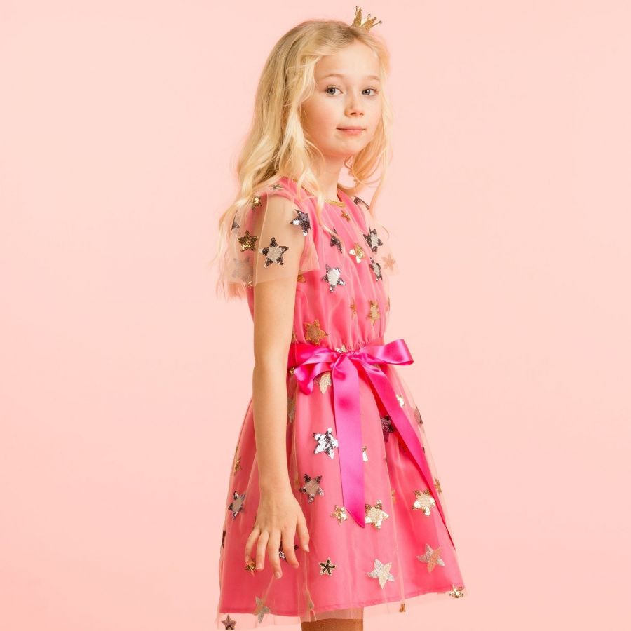 Beautiful girls bright pink dress with twinkling stars made of embroidered sequins in gold and silver on a fine fluid tulle, lined with a bright pink silky fabric.