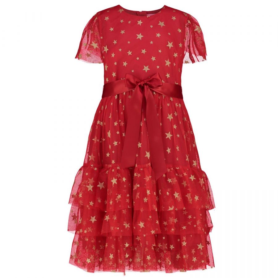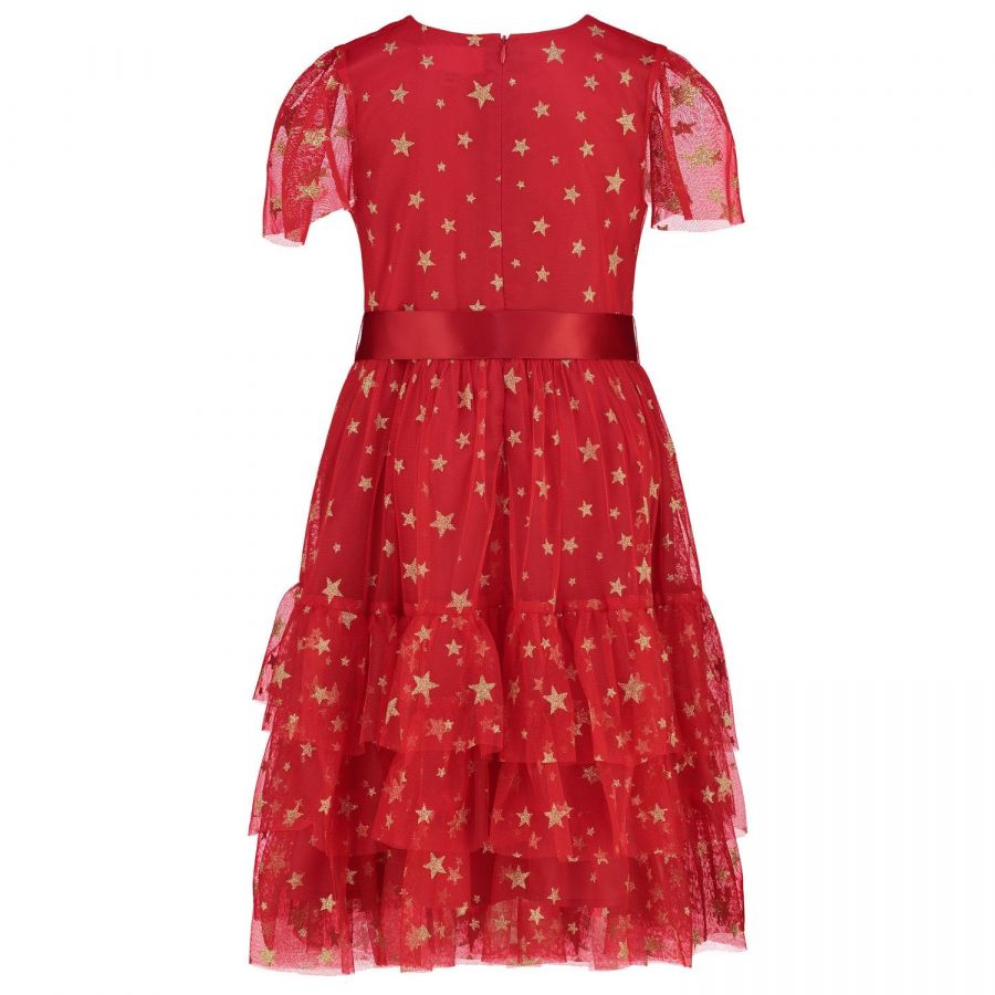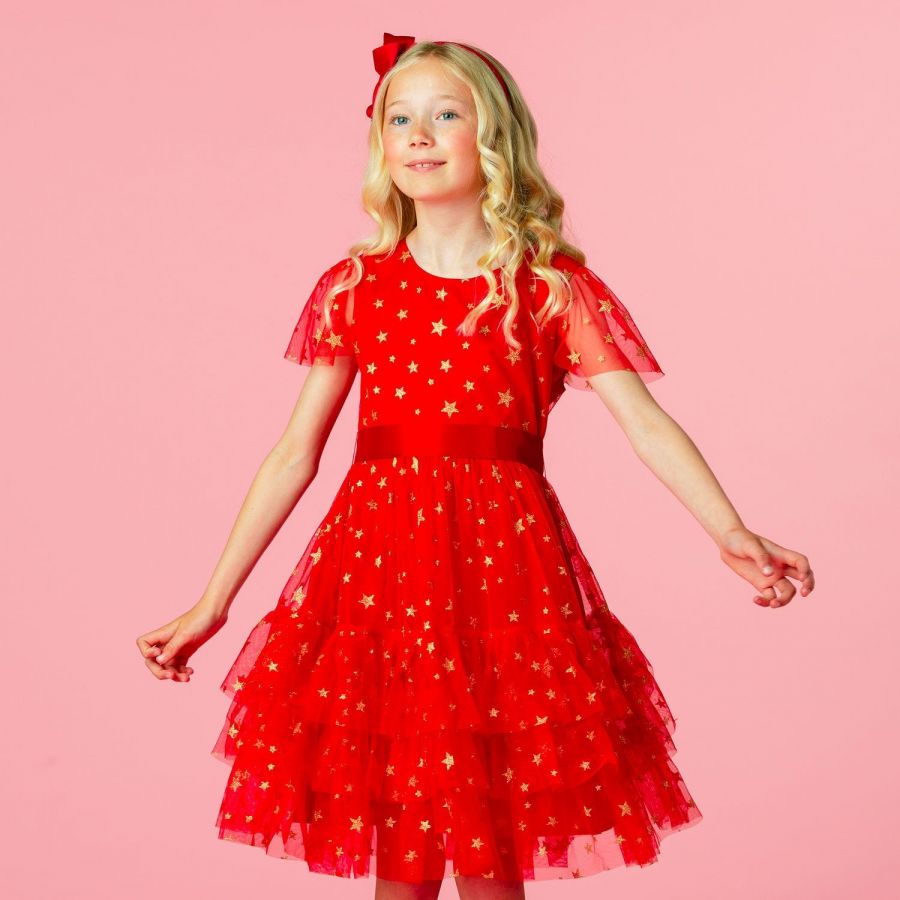 Girls beautiful bright red party dress with twinkling stars made of embroidered sequins in gold and silver on a fine fluid tulle, lined with a bright red silky fabric. Perfect for the Christmas holiday season!