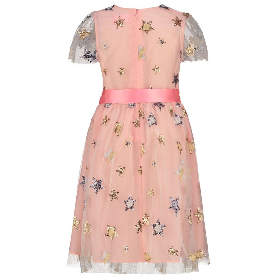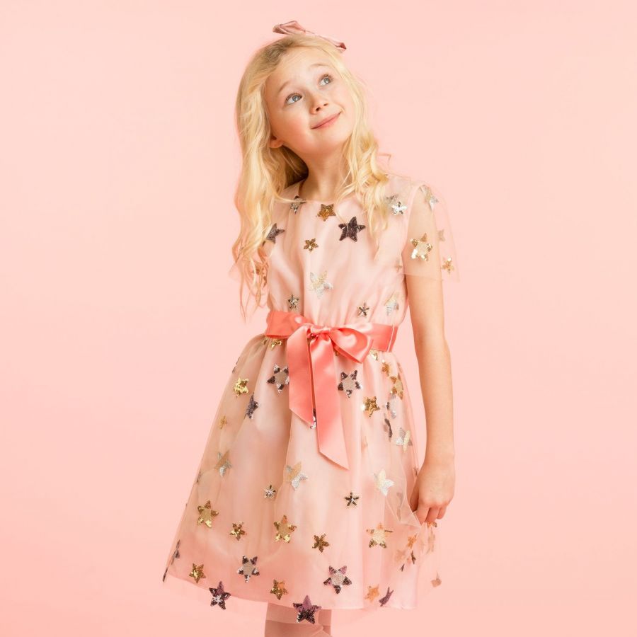 • Girls party dress in an adorable pale pink with twinkling stars of embroidered sequins in gold and silver on a fine fluid tulle, lined with a pale pink silky fabric. The perfect party dress for every occasion!