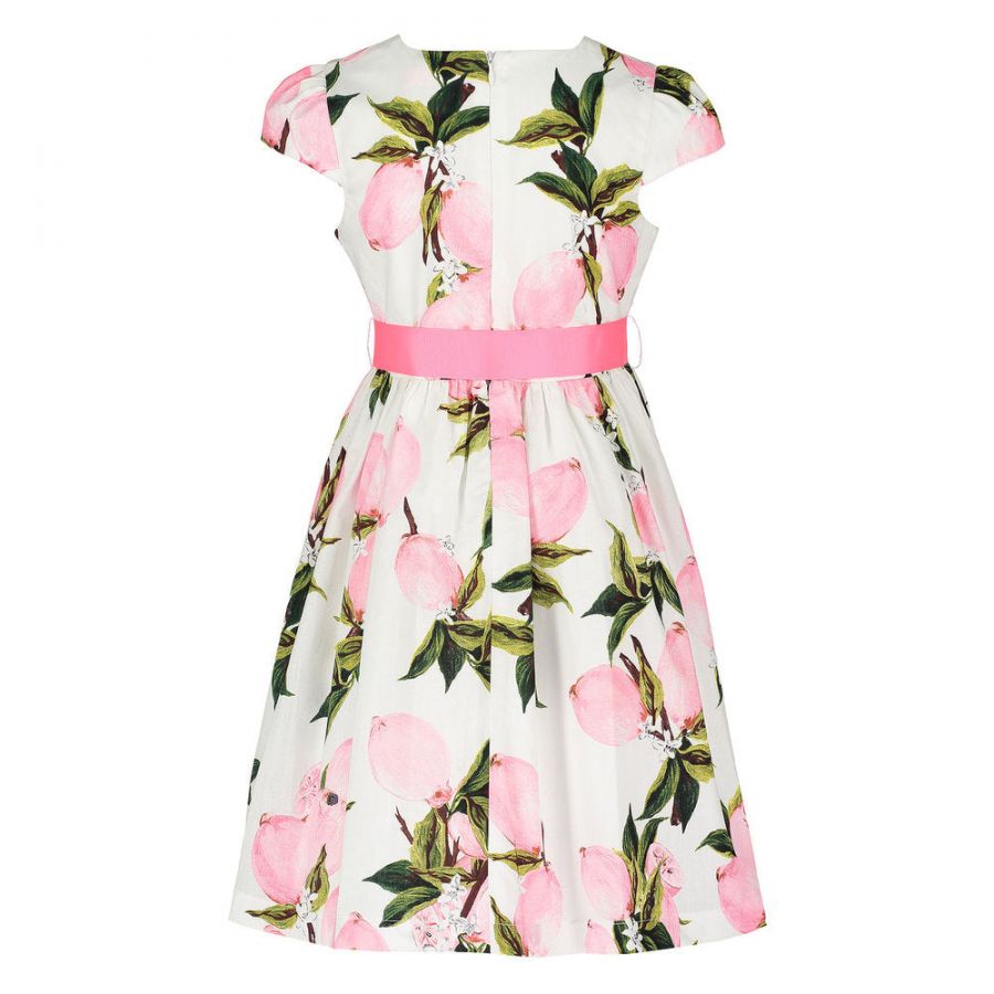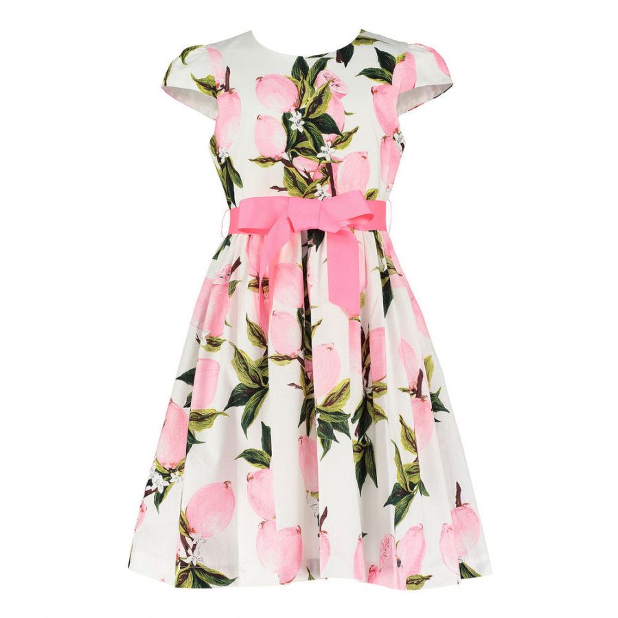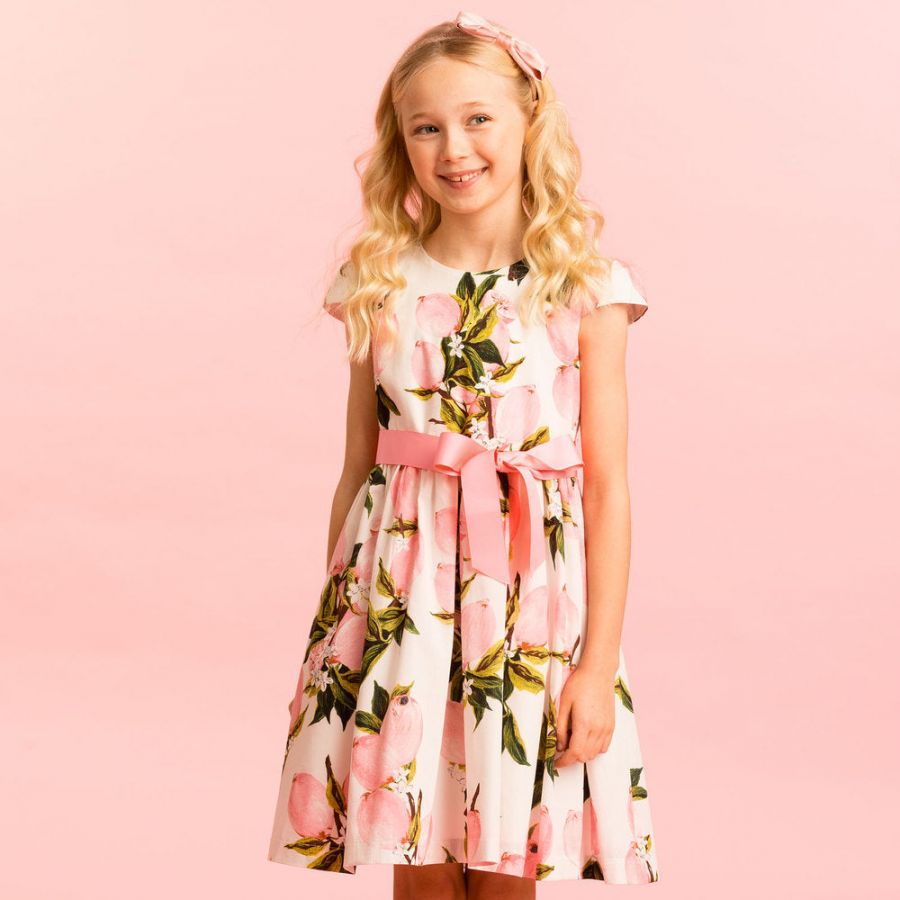 • Girls fresh white cotton pink fruit print party dress with a pink grosgrain bow belt. The dress is short sleeved with a semi fitted bodice, gathered skirt at the waist. The dress is knee length, fully lined in a cotton lining with an invisible zip back fastening. Perfect for daywear, holiday, parties, birthdays, special occasions, Mother's day, Easter, Eid and weddings. Details White cotton pink fruit print Fully lined in soft cotton fabric Tie grosgrain ribbon bow belt Short sleeved Knee length Invisible back zip Fabric: 100% Cotton Lining: 100% Cotton Designed in Great Britain Machine washable