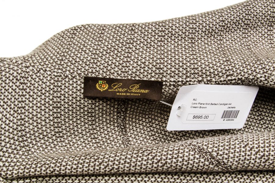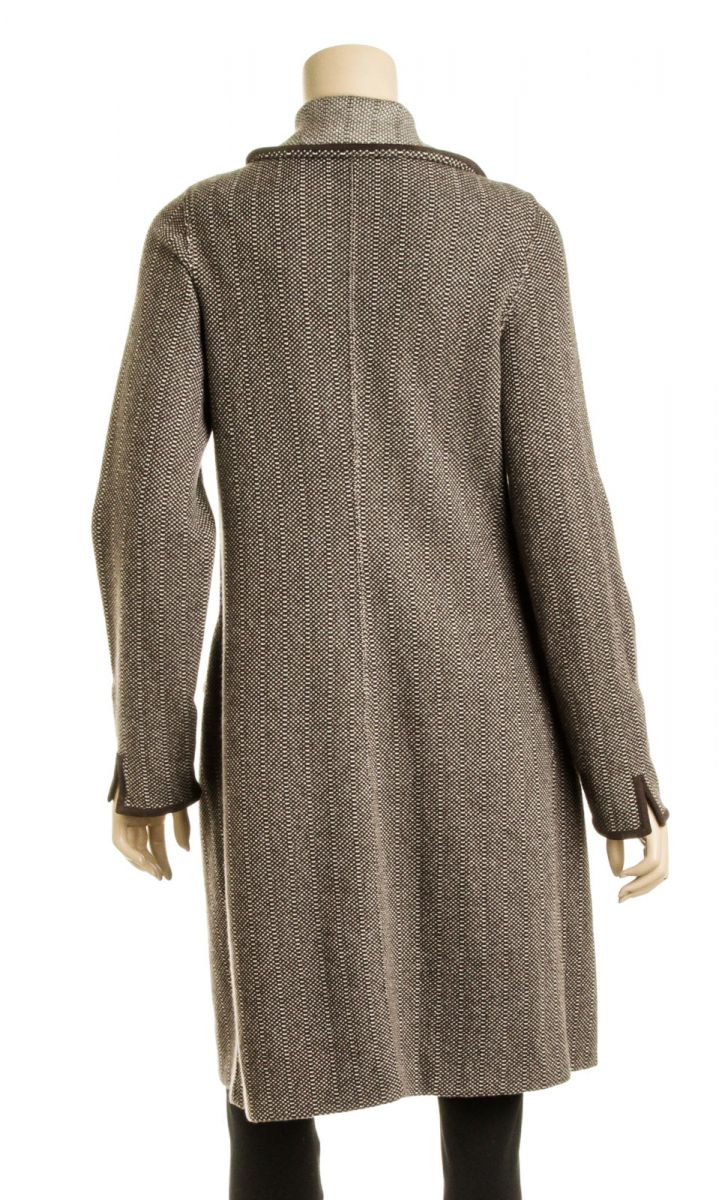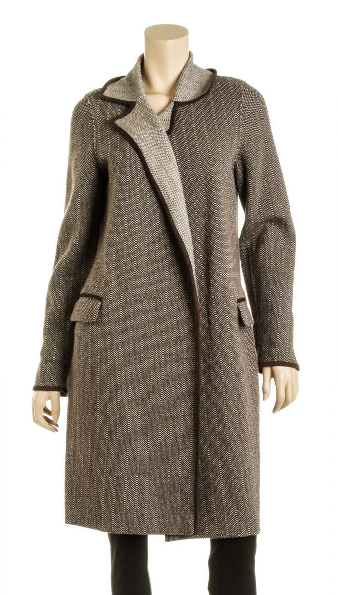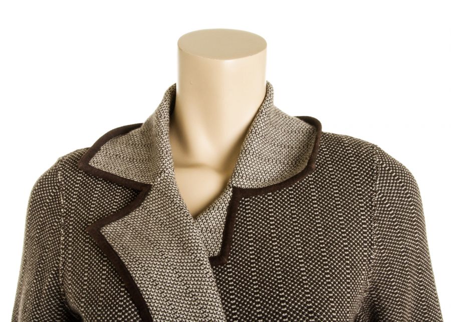 Get wrapped up in this modest brown and beige cashmere knit print wrap style coat by Loro Piana! This coat features dark brown suede trim and two straight flap pockets.