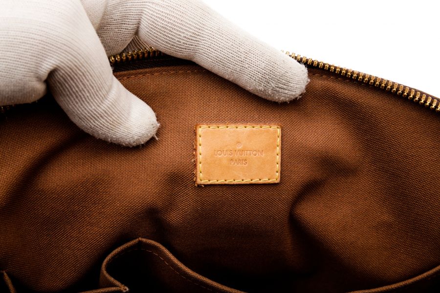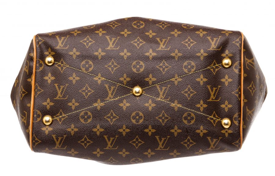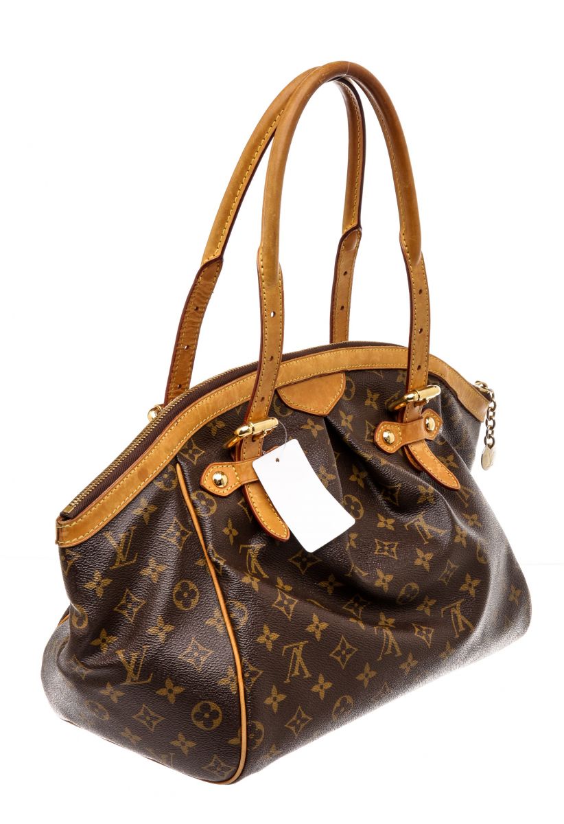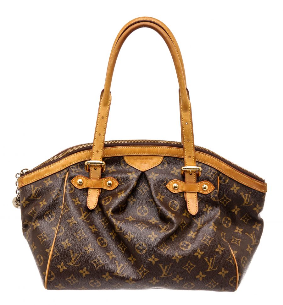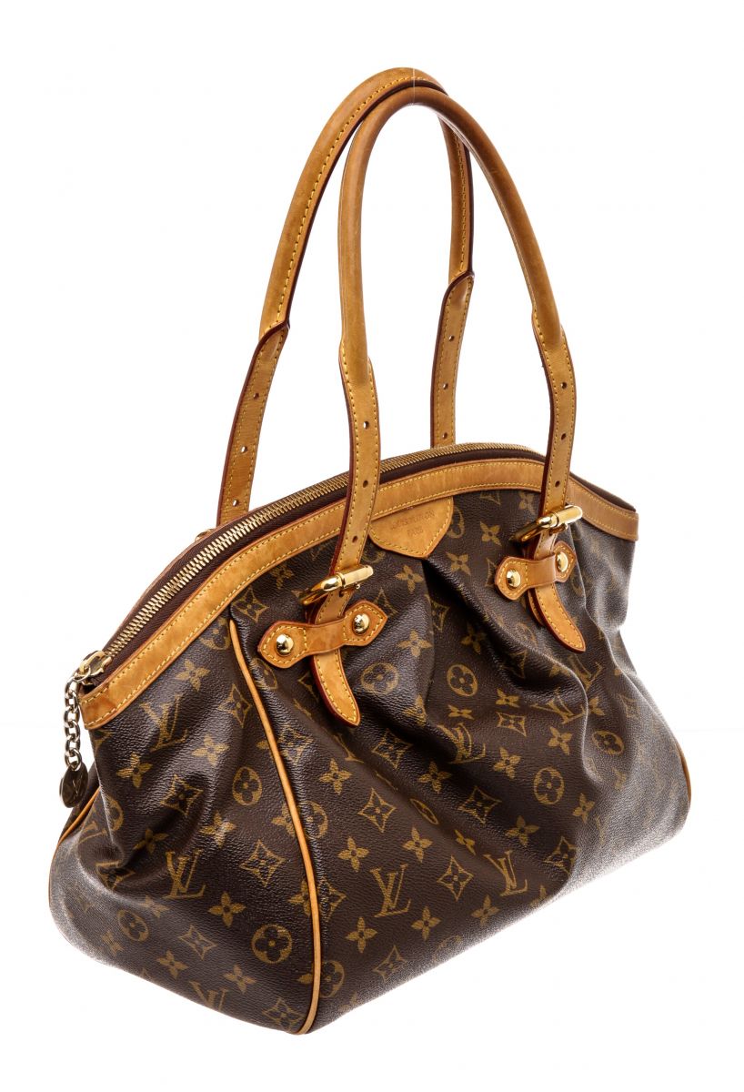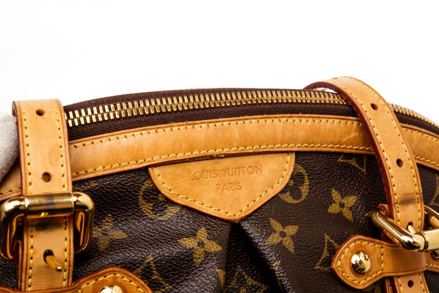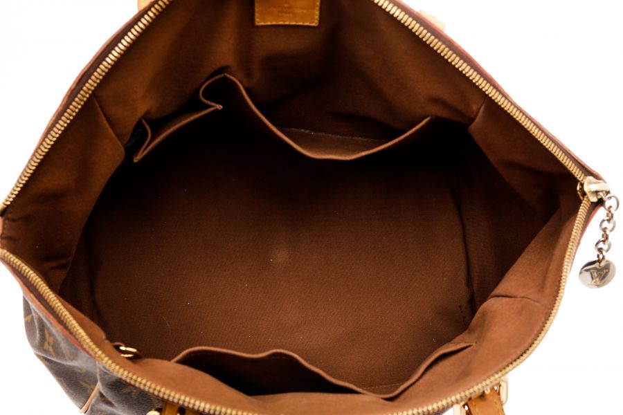This stylish tote is finely crafted of pleated Louis Vuitton monogram on toile canvas. The shoulder bag features signature natural vachetta leather trim, adjustable rolled handles and polished brass hardware. The top zipper opens to a cocoa brown fabric interior with patch pockets and a D-ring.