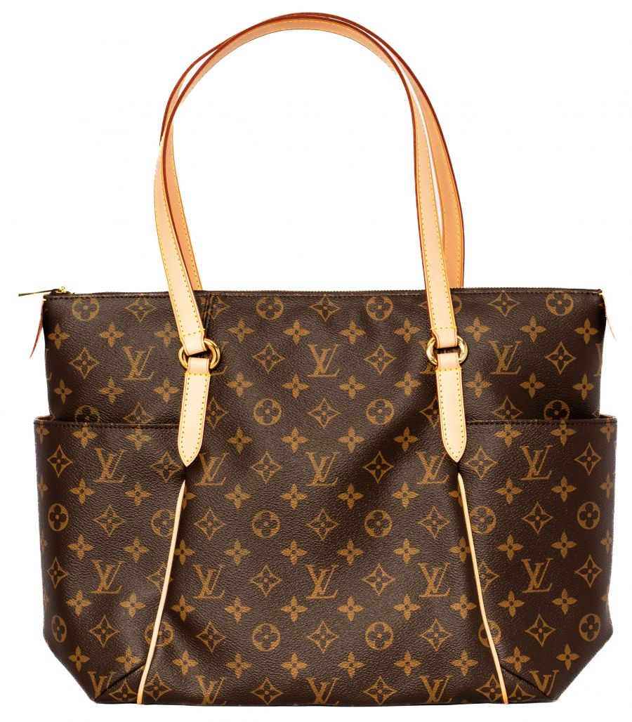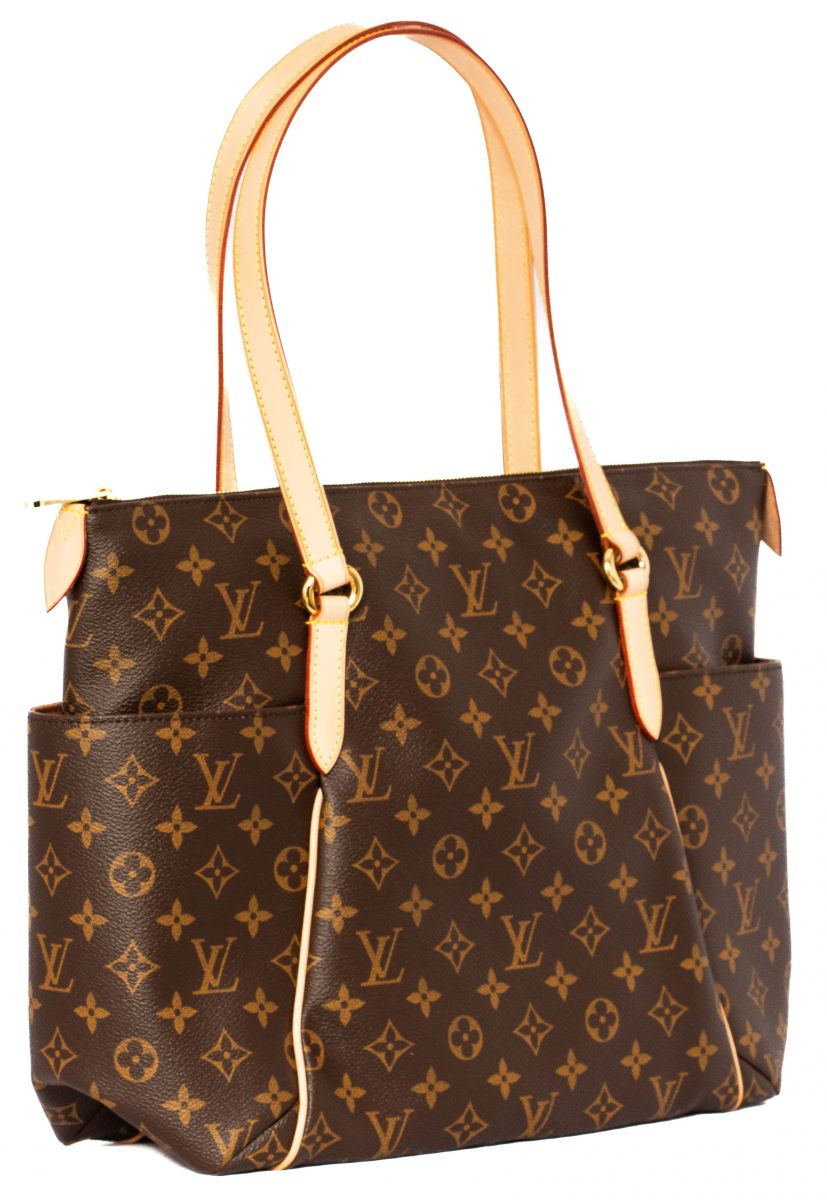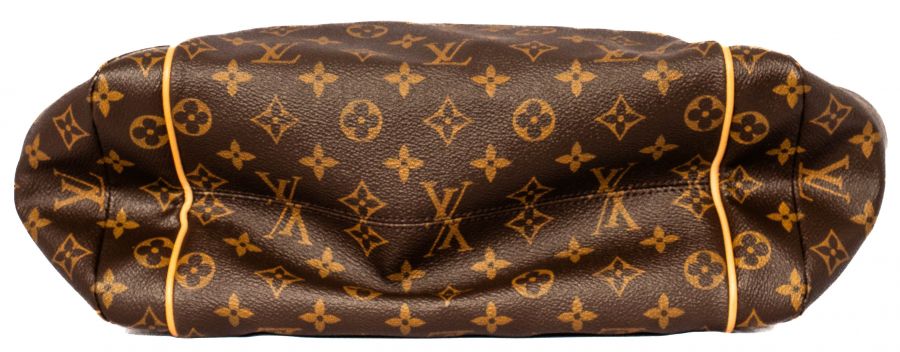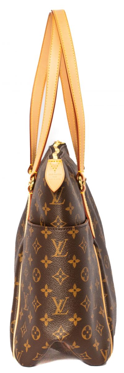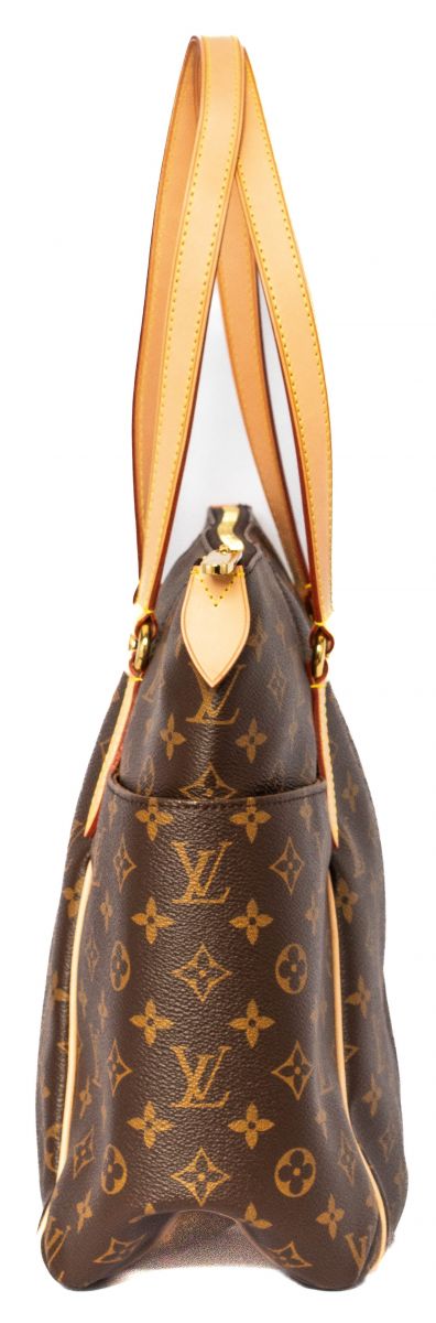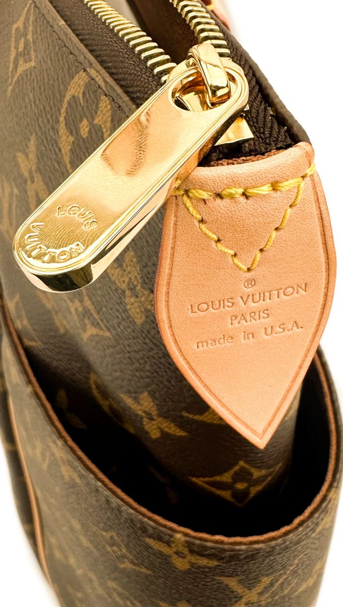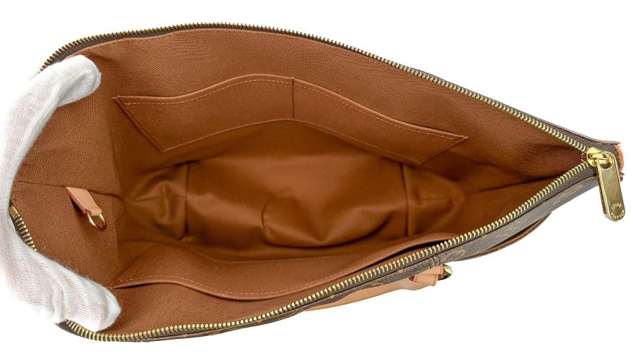 This tote is crafted of classic Louis Vuitton monogram coated canvas. The bag features bucket pockets on either side, vachetta cowhide leather trim, and matching shoulder straps, with brass hardware. The top zipper opens the bag to a cocoa brown fabric interior with patch pockets.