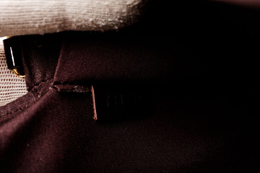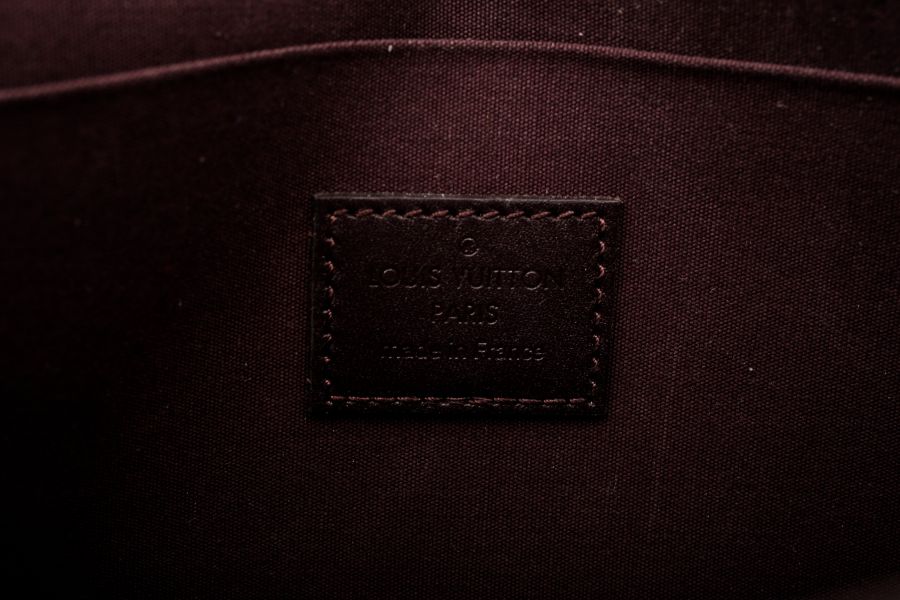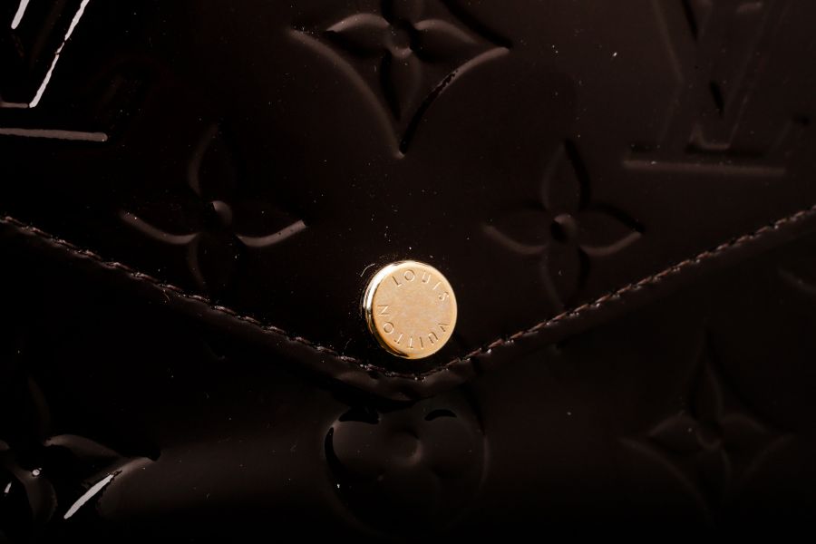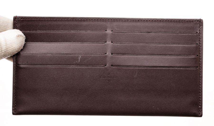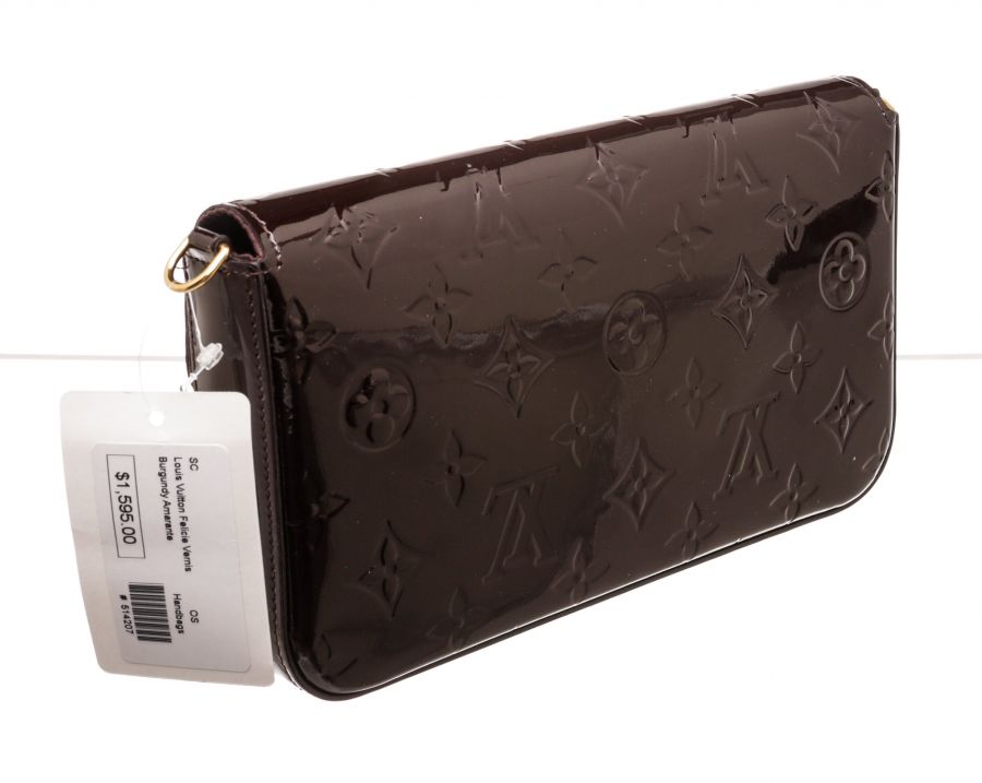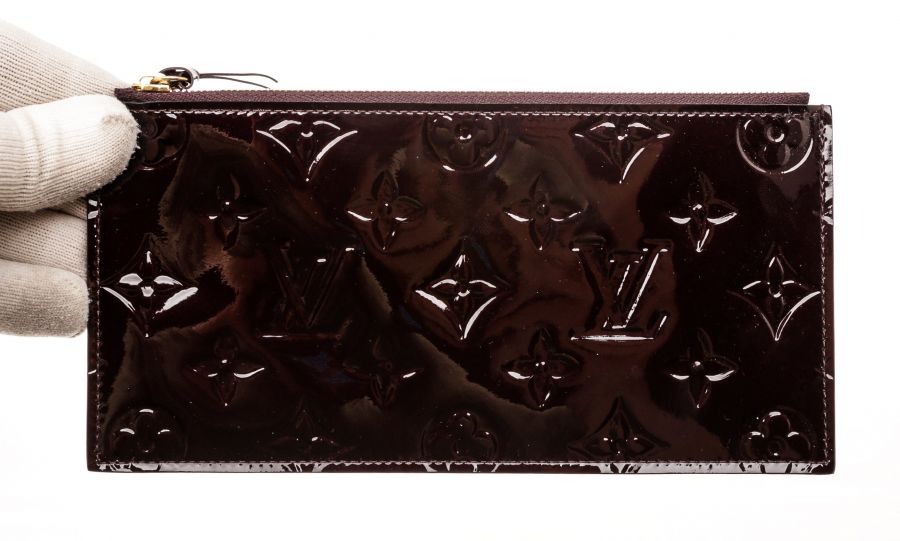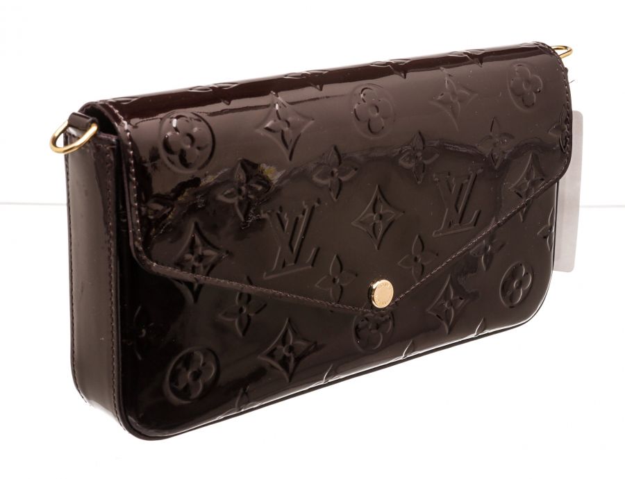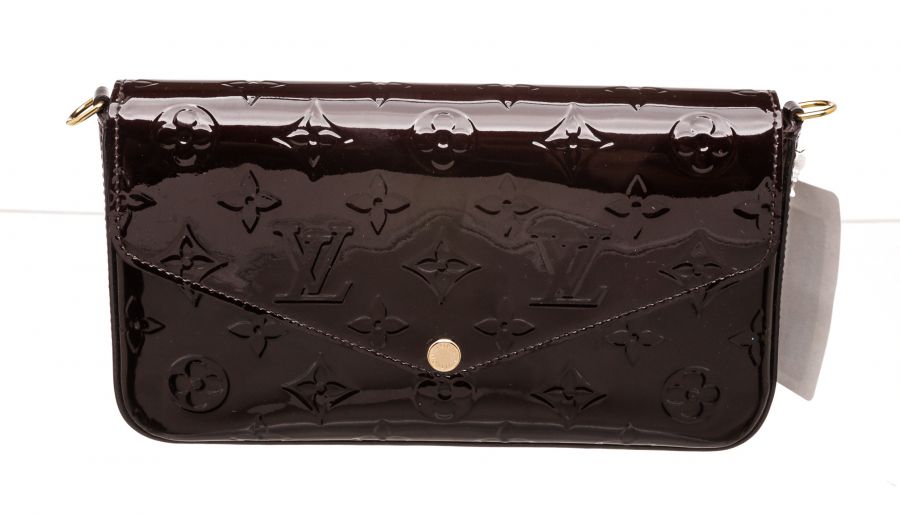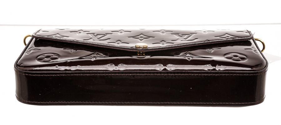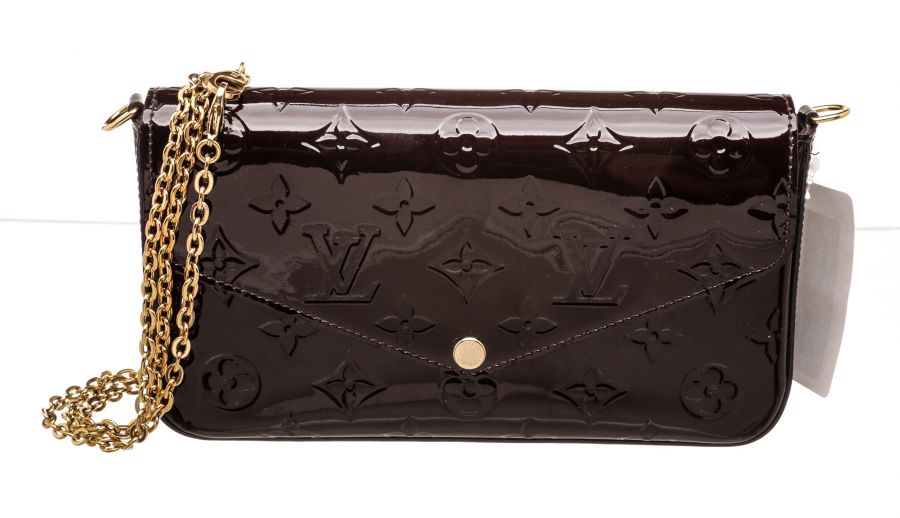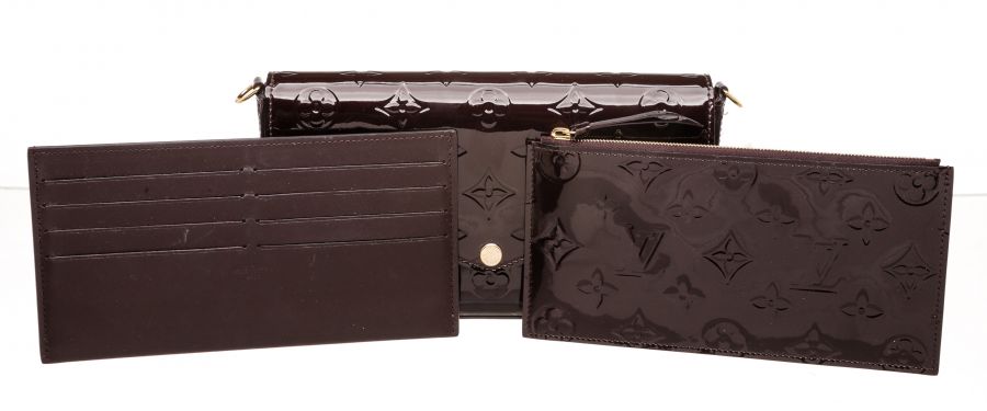 This stylish wallet is crafted of smooth Louis Vuitton monogram-embossed patent leather in deep burgundy. The bag features an optional polished brass chain-link shoulder strap and a matching snap on the envelope-style crossover flap. The wallet opens to a dark brown fabric interior with a patch pocket, and two removable inserts.