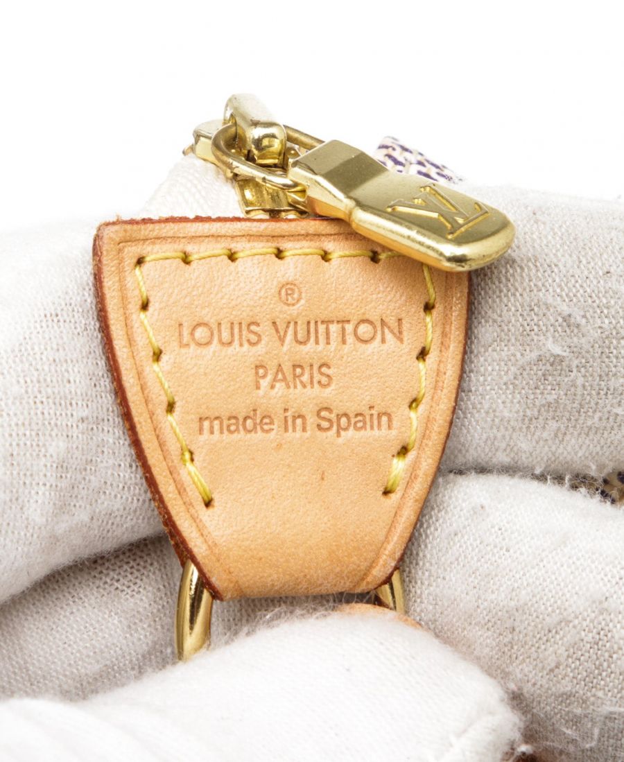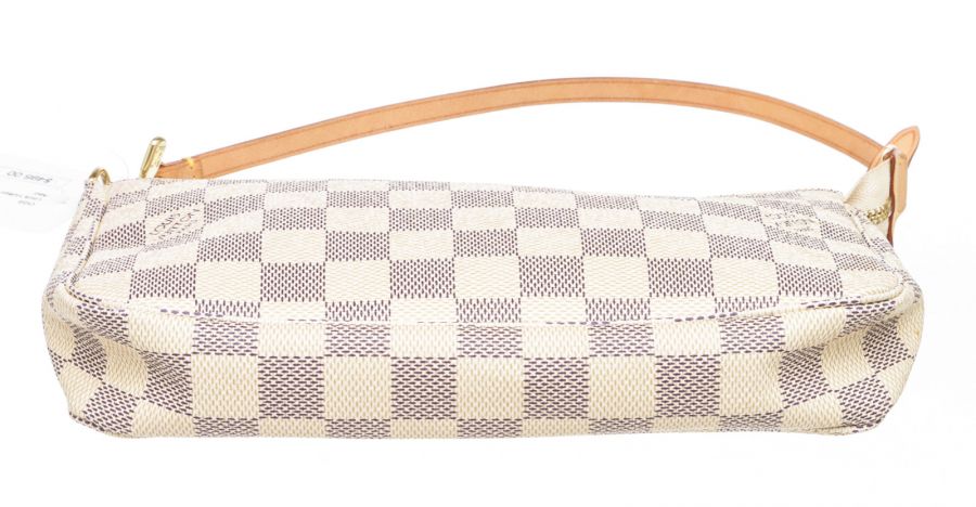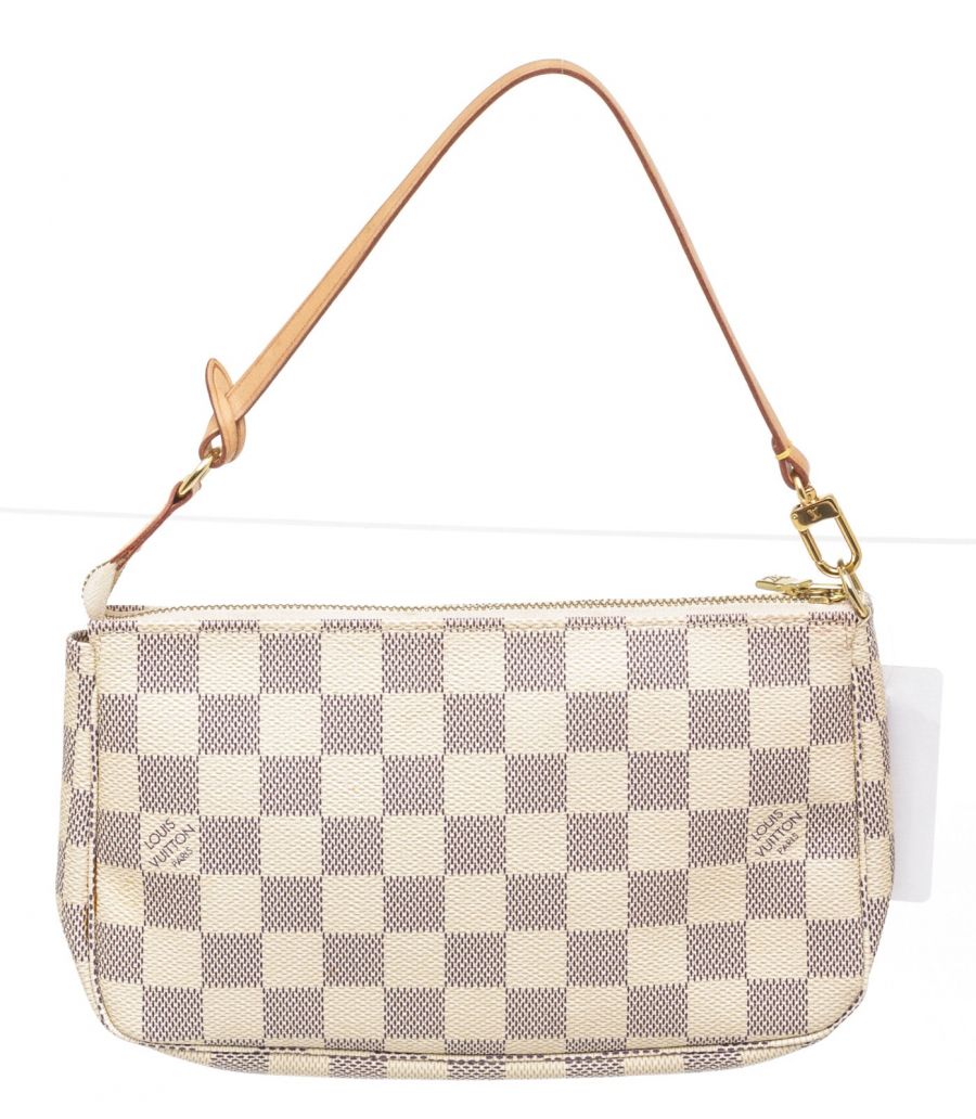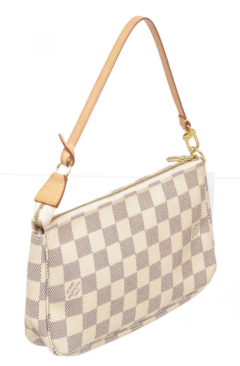 This Louis Vuitton Pochette is crafted from damier azur coated canvas and features a single loop shoulder vachette leather strap, gold-tone hardware and zip top closure. OQS 494408 MP 10.19.19