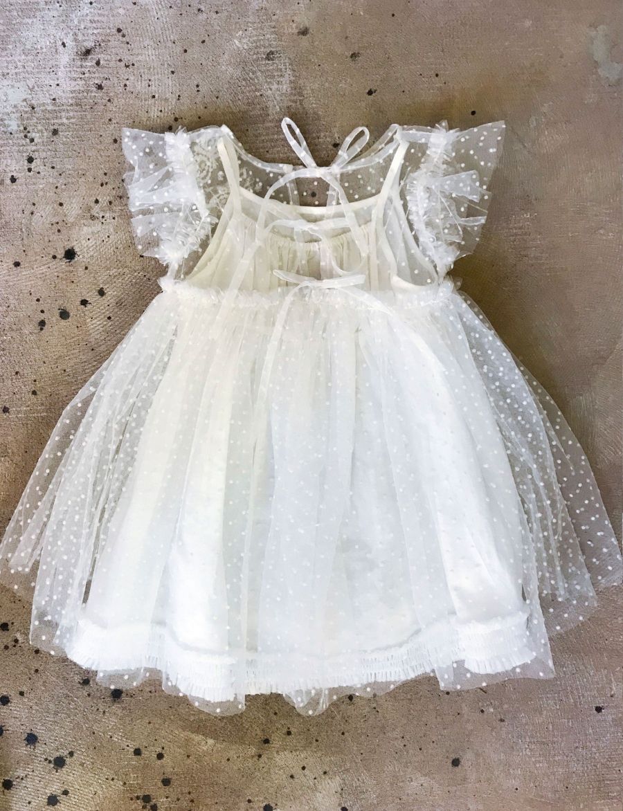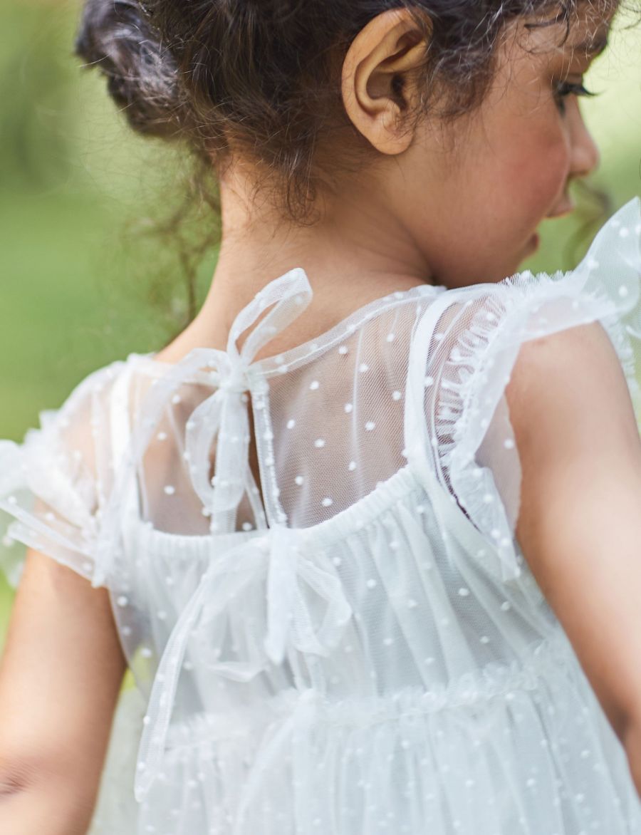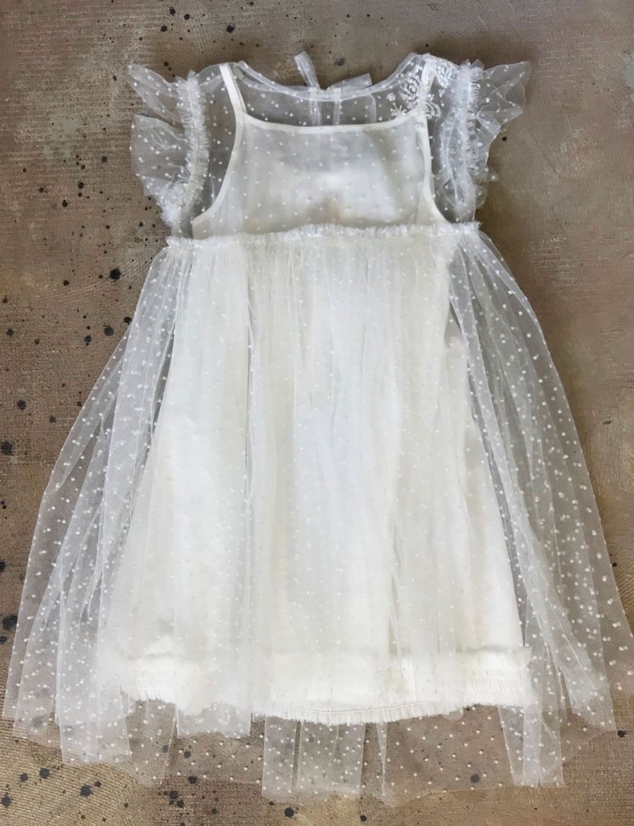 This cutesy dress features baby swiss dot shells, adding a cute pop to your little one's wardrobe. The adjustable tie back detail gives a hint of luxury, while the fine cotton slip dress ensures her comfort. Thehand beaded butterfly detail in the front adds a lasting touch of magic! Please hand wash to maintain the durability of this dress.