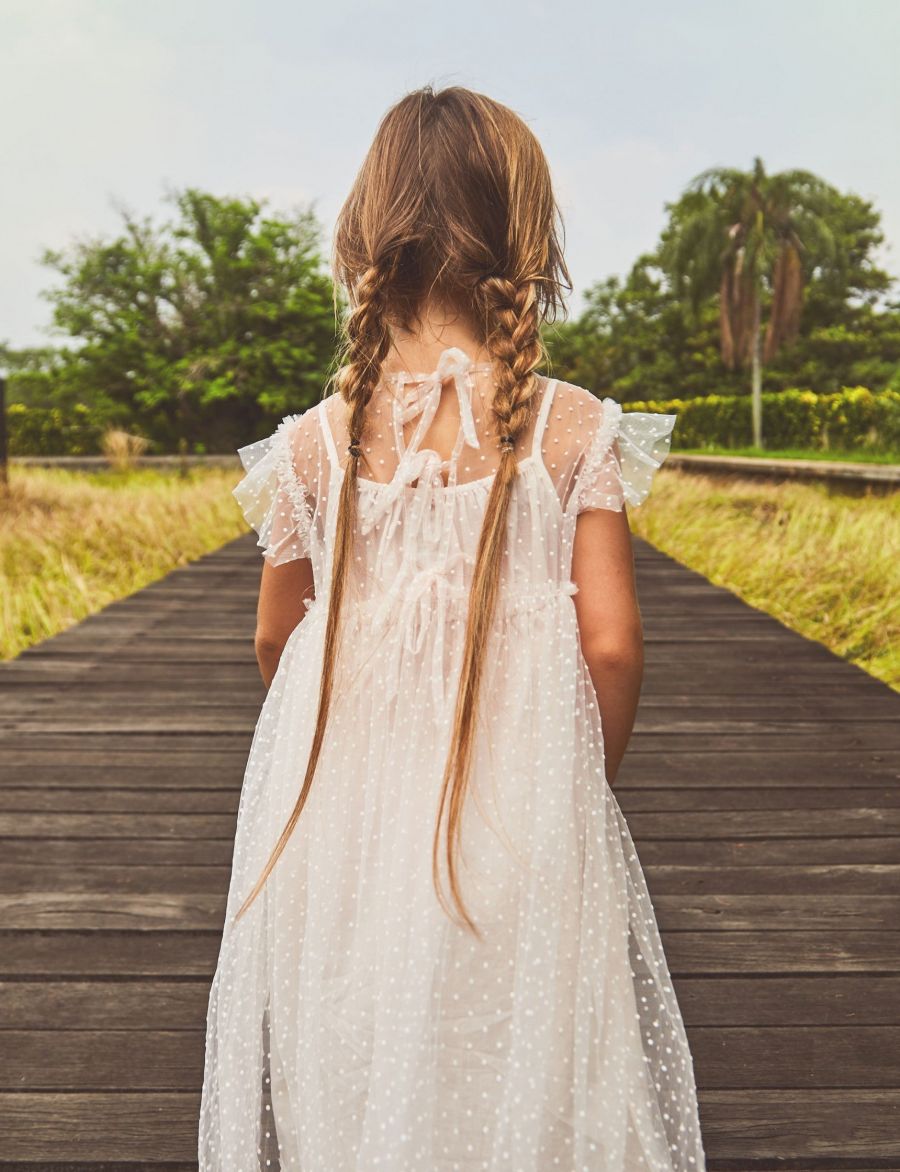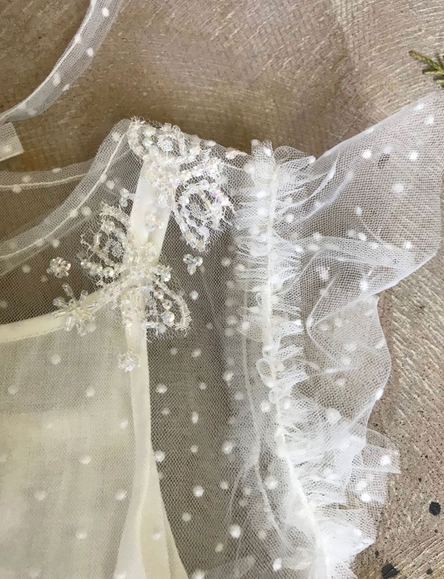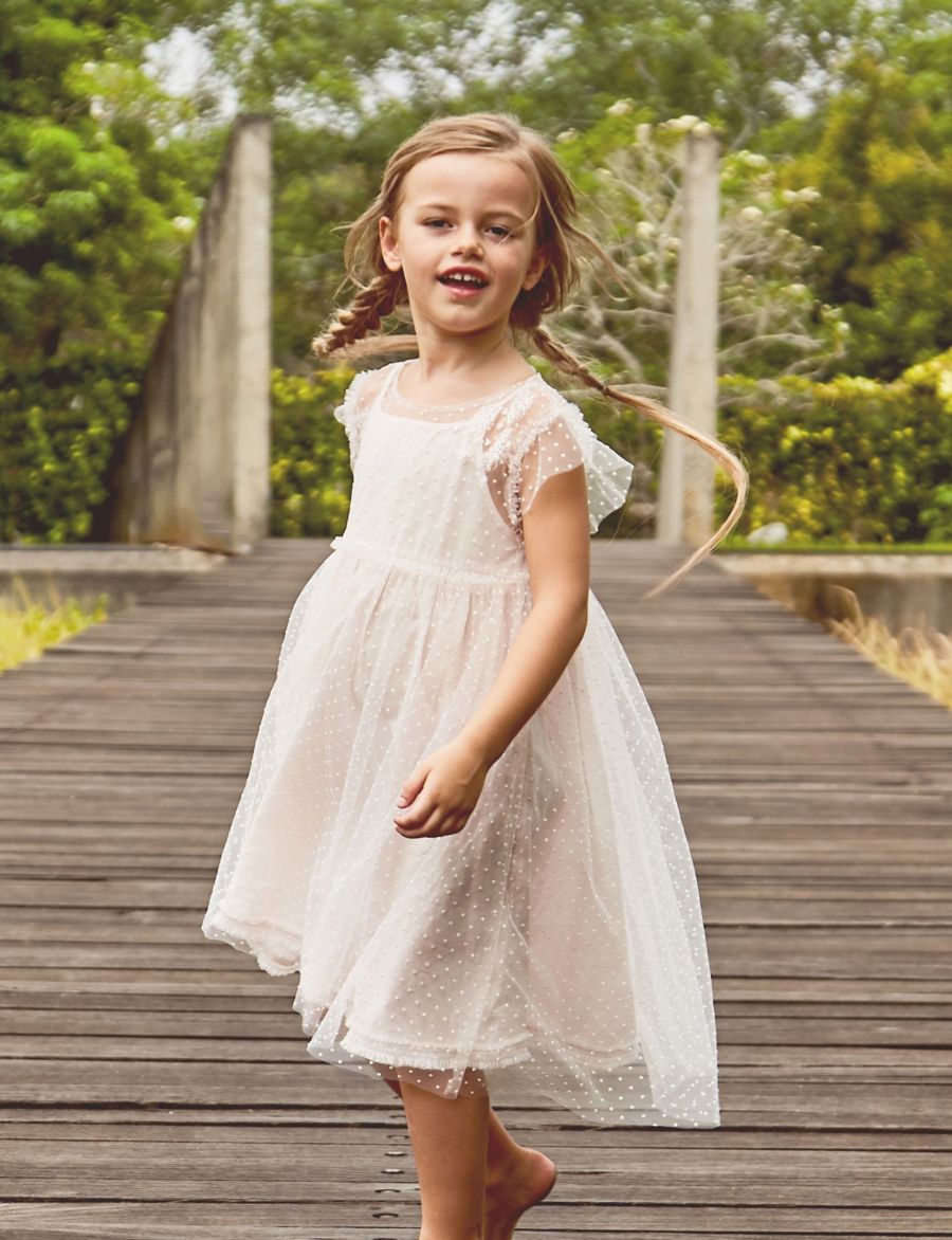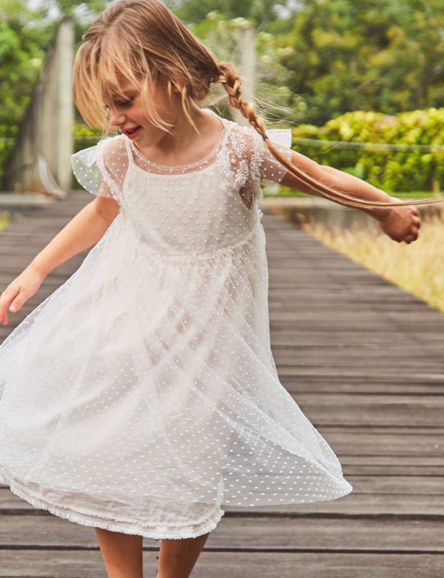 This cutesy dress features baby swiss dot shells, adding a cute pop to your little one's wardrobe. The adjustable tie back detail gives a hint of luxury, while the fine cotton slip dress ensures her comfort. Thehand beaded butterfly detail in the front adds a lasting touch of magic! Please hand wash to maintain the durability of this dress.