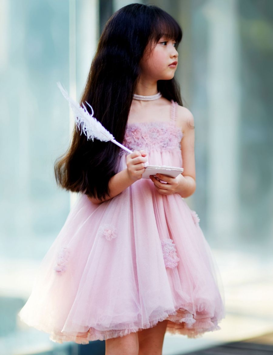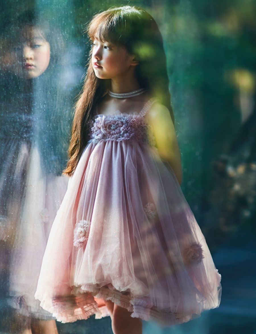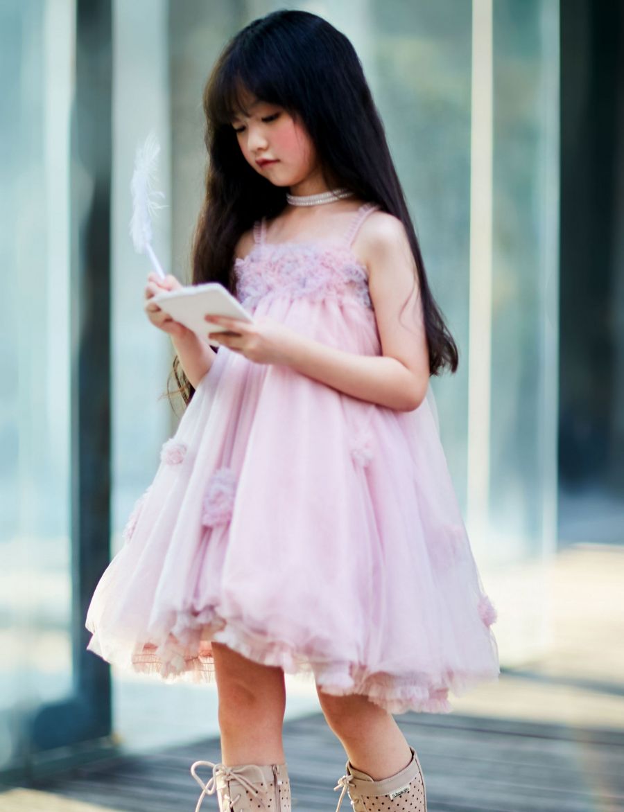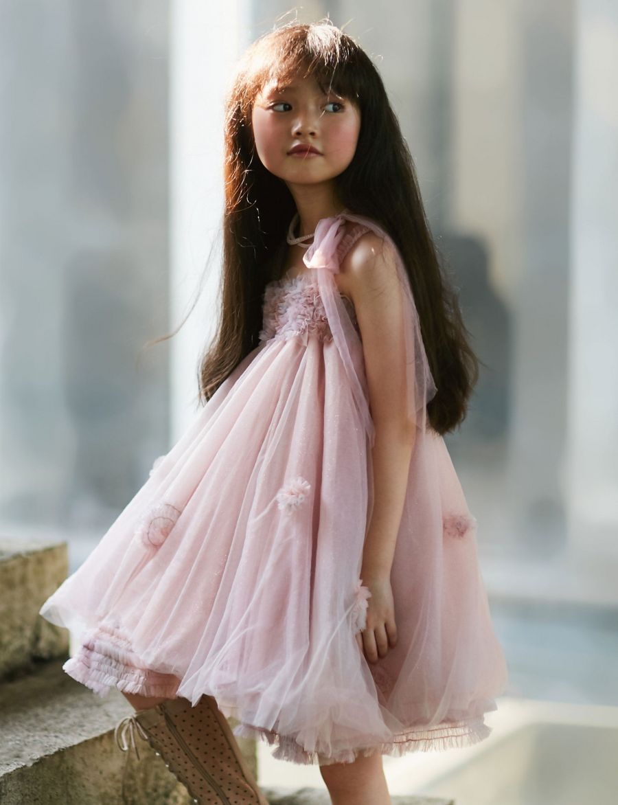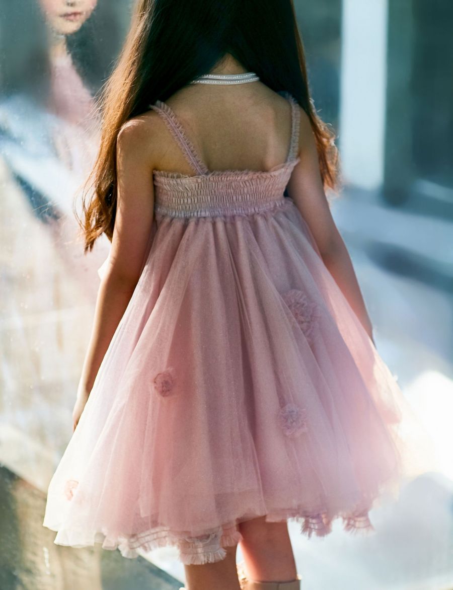 This beautifuldress features arainbow ombré tulle, soft mesh, and shiny tulle layers. It also has a stretch smocked chest and mesh rosettes appliqués. It has a comfy fine cotton lining and is the perfect dress for your little princess. Please hand washand lay flat dry to maintain the durability of this dress.Order yours today!