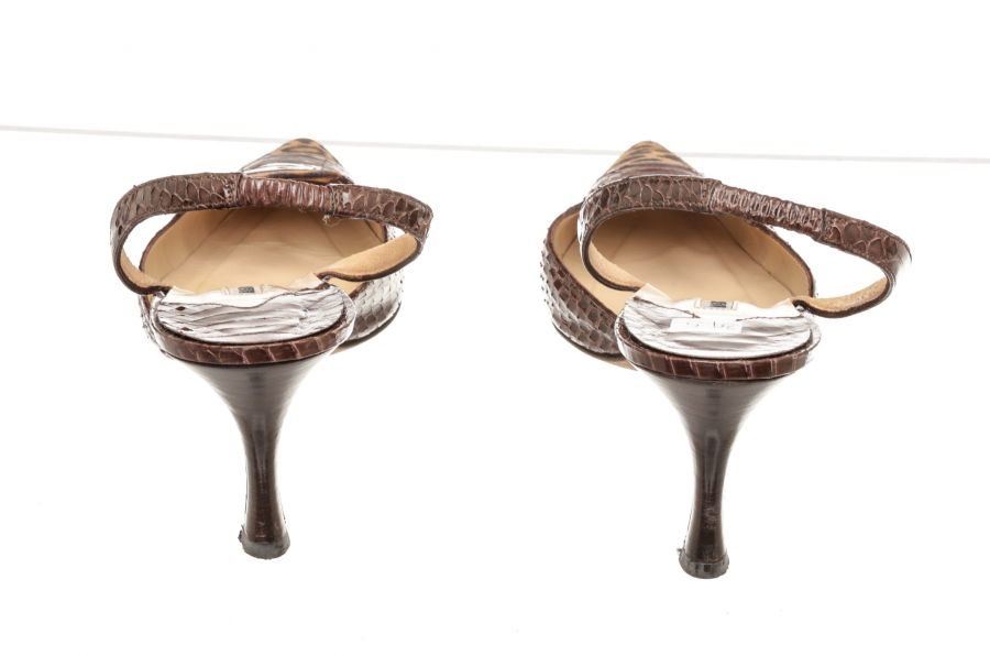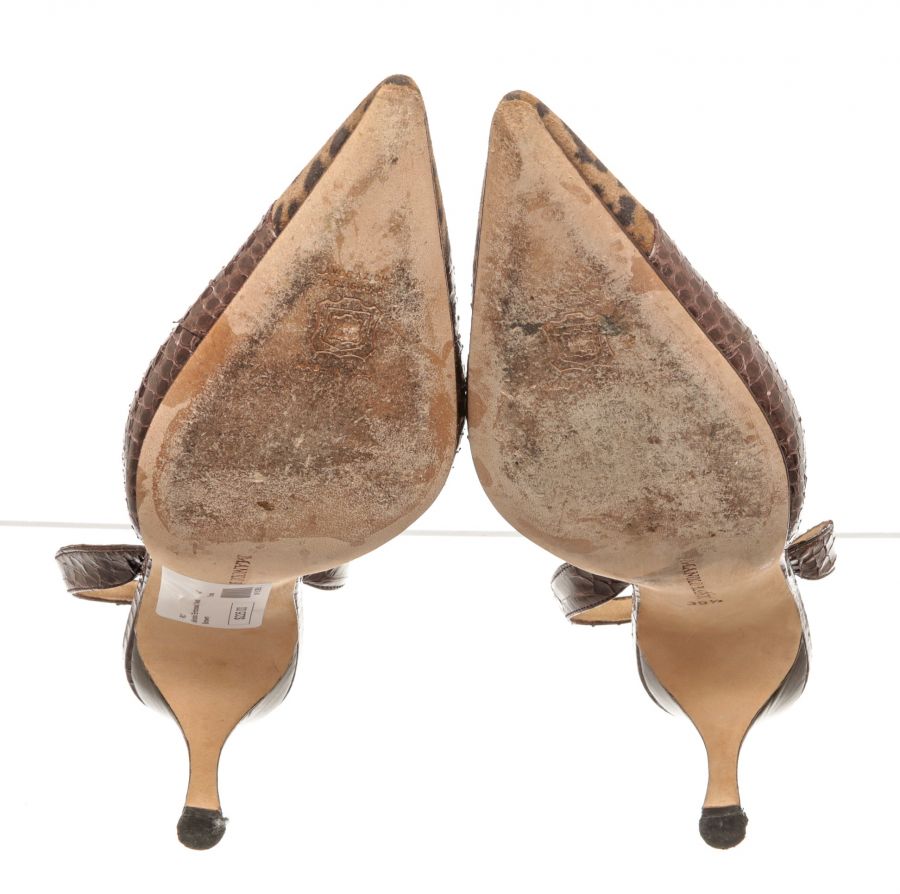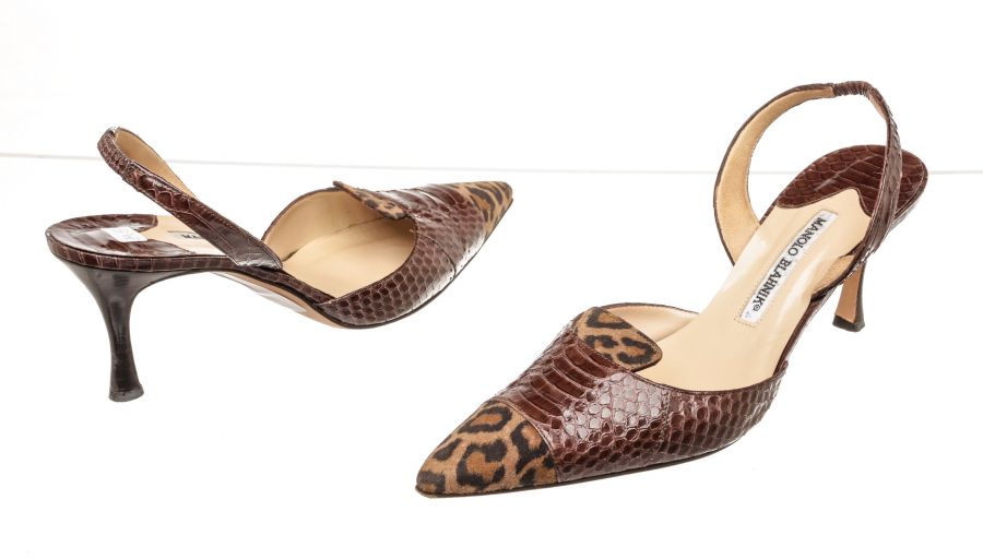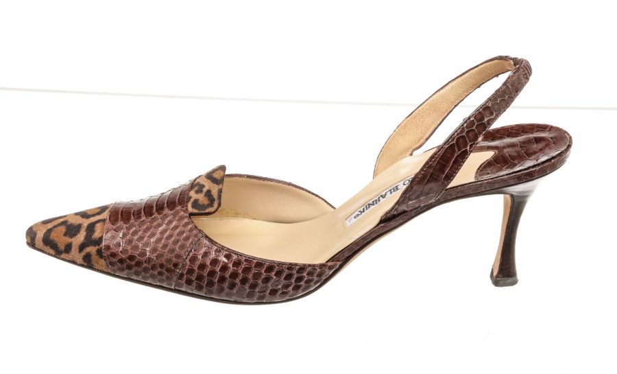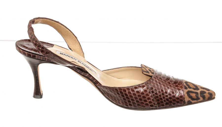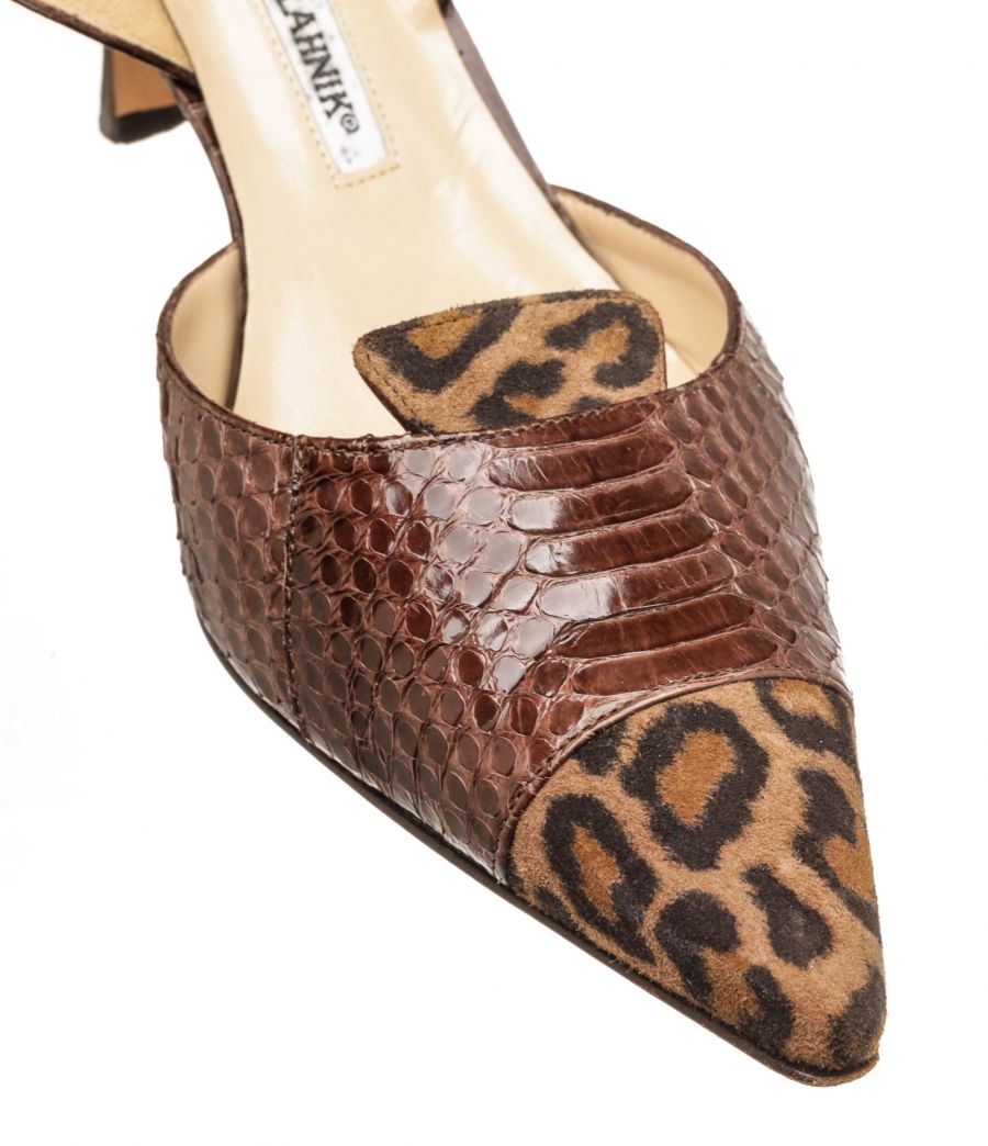 Manolo Blahnik brown slingback sandals with cheetah pattern suede, embossed leather, and 3" high heels.