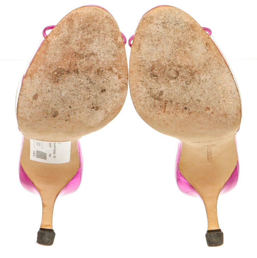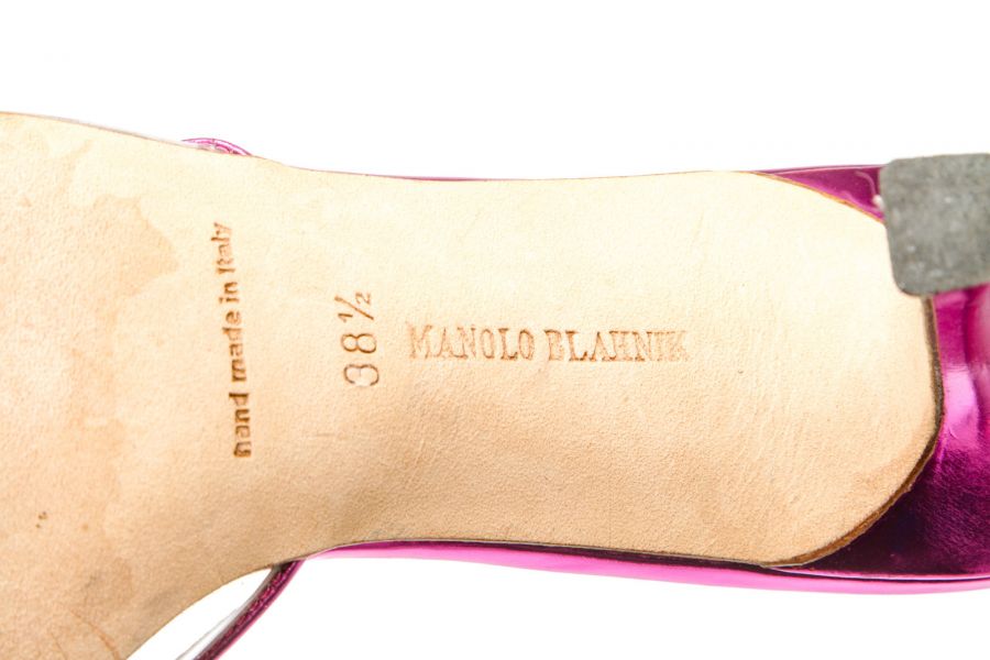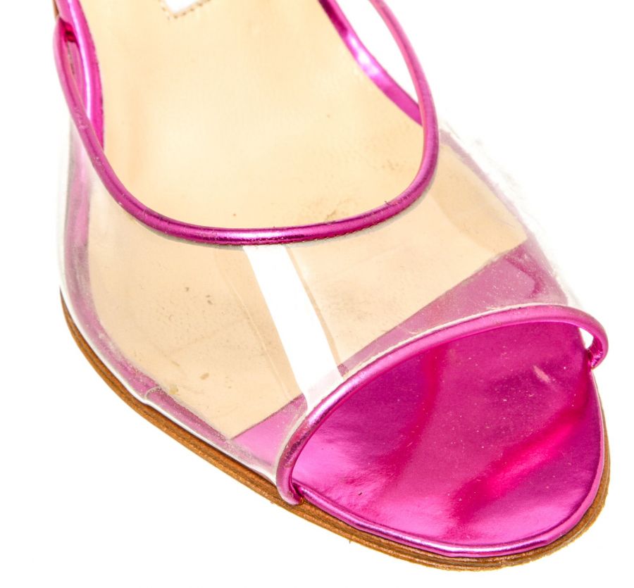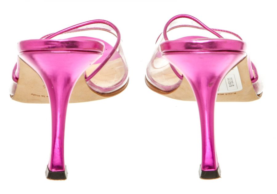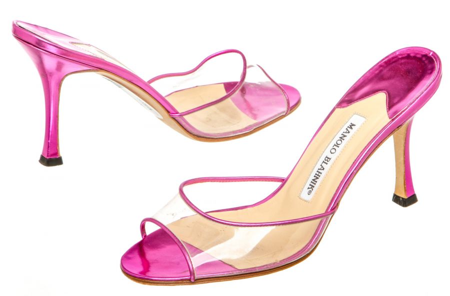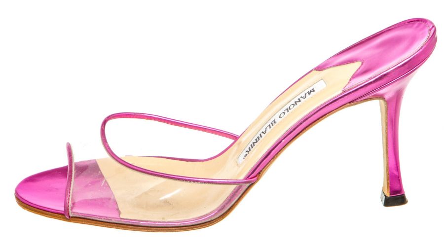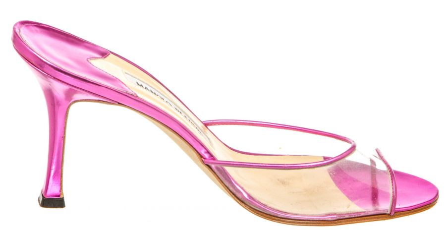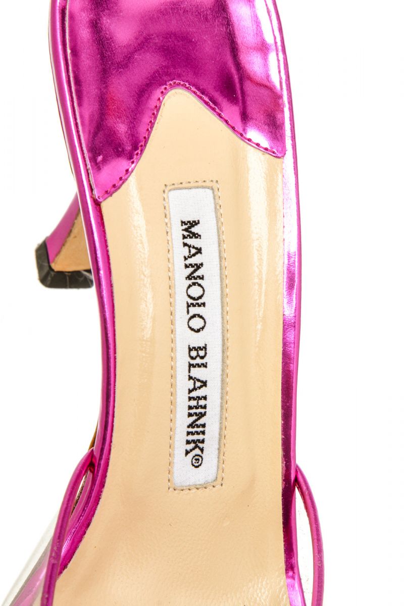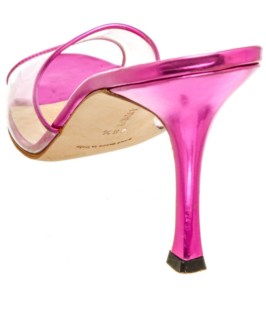 Metallic pink leather Manolo Blahnik sandals with a PVC single band atop a covered stiletto...