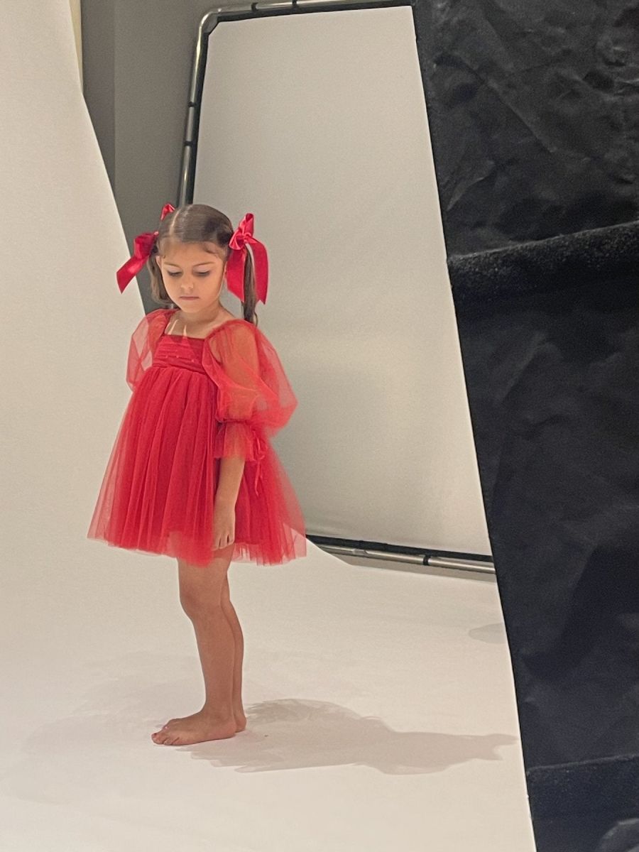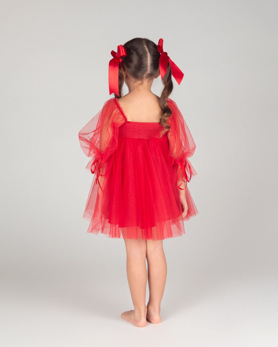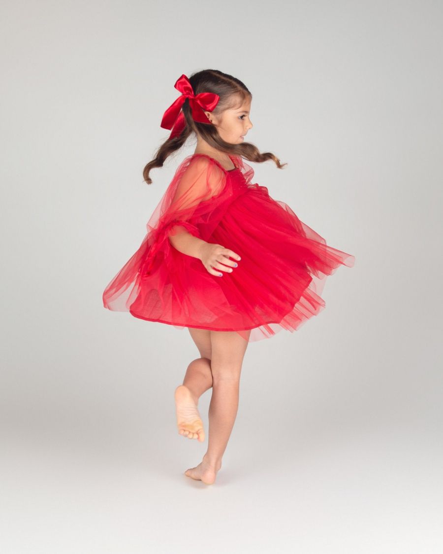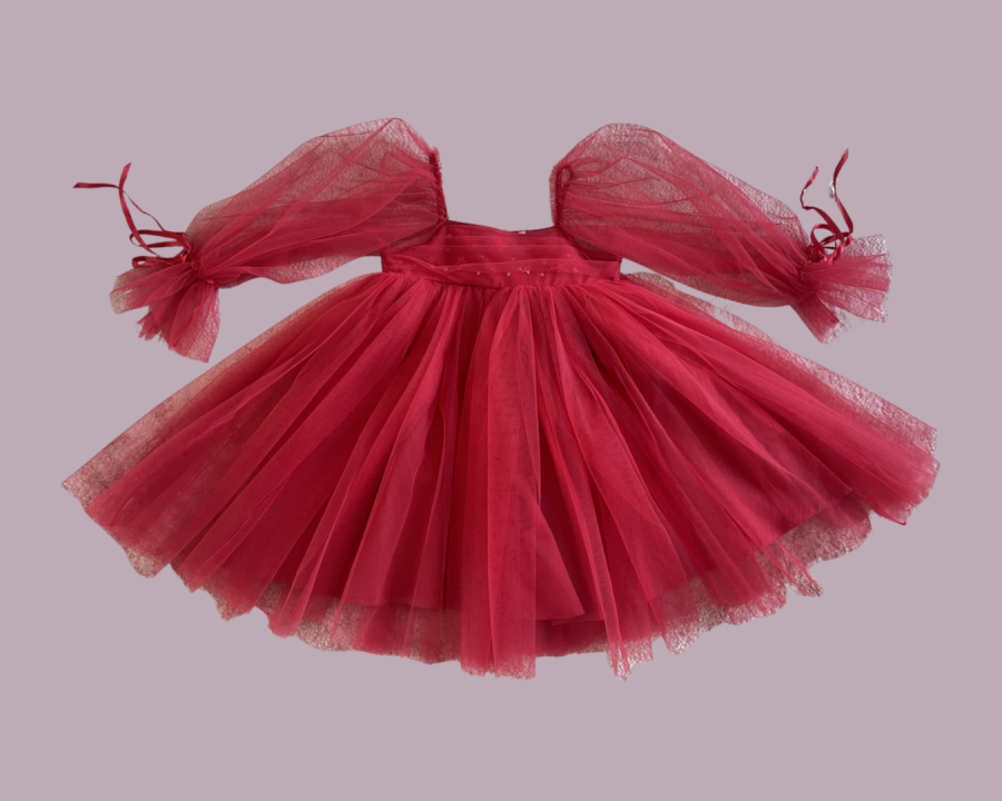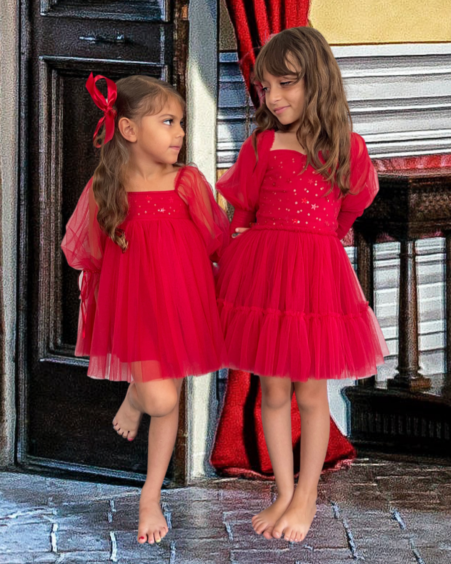 An adorable vintage inspired babydoll dress. Dreamy tulle sleeves tied with satin bows at the ends, can be worn puffed up or straight down. Babydoll silhouette with pleated tulle on the top with our signature star and sequin beading underneath. Length from front neckline of dress to hem: 0-3mo is 12.5”, 3-6 is 13”, 6-12 is 13.75”, 12-18” is 14”, 18-24 is 14” but sleeve is 1” longer, 2/3 is 17”. Dress has stretch in back for room to grow! Comes with a diaper cover. The color is a rich, true red as shown in the photos with the studio lighting