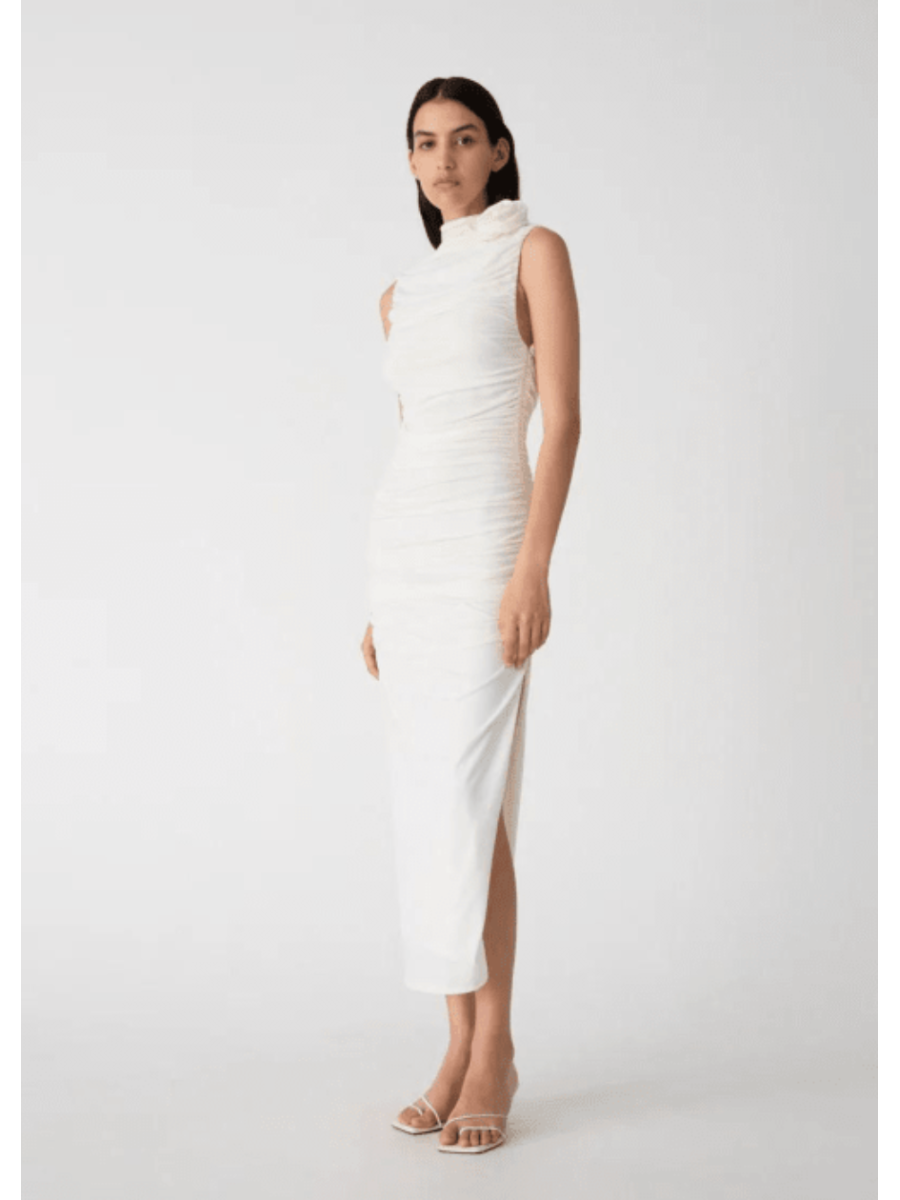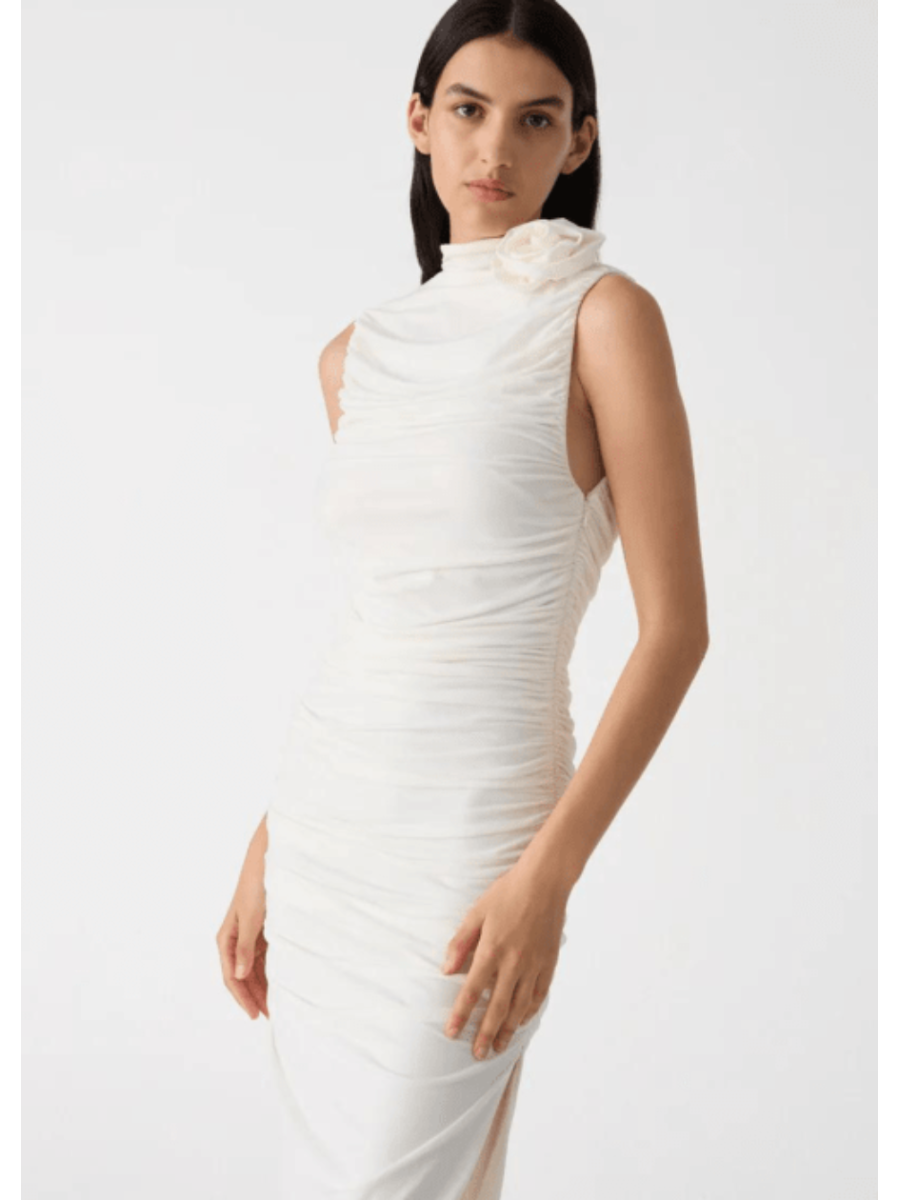 The Frankie dress is an elongating midi style which exudes a sleek and fitted silhouette. The tank-style design features roching at the midline for a flattering look and comfortable feel with a rosette at the neck to elevate the look.