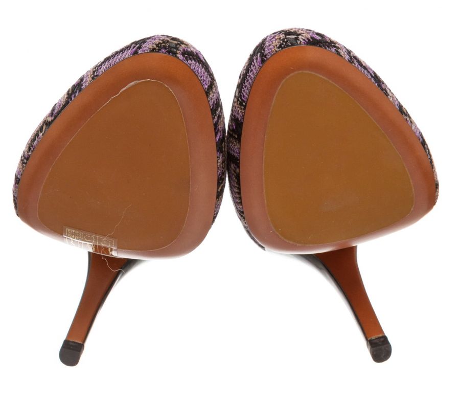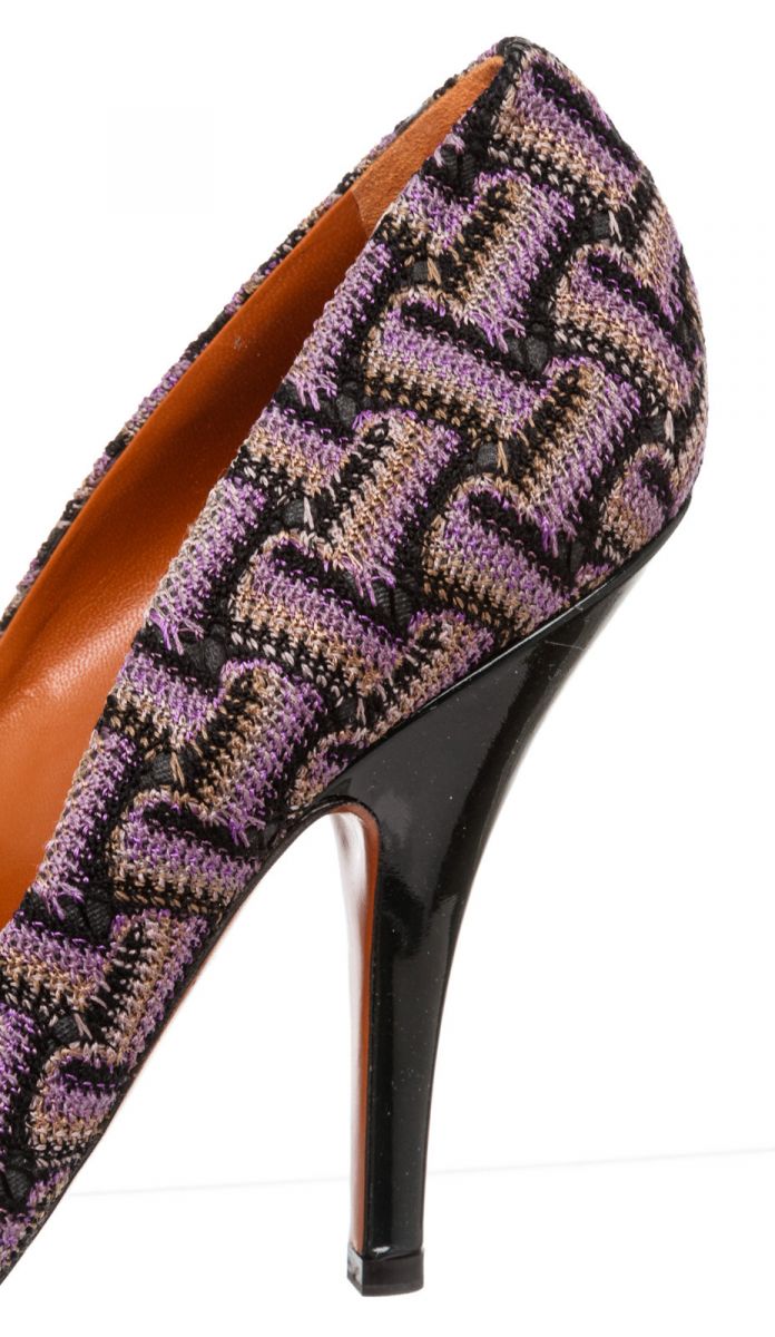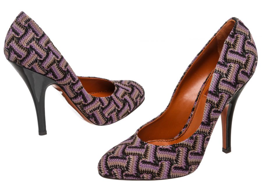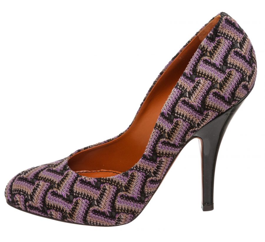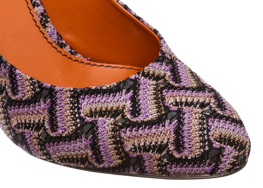 Purple multicolor knit Missoni chevron motif pumps that feature a round almond toe, covered heel and leather sole. RC 489442 MP 5.12.19