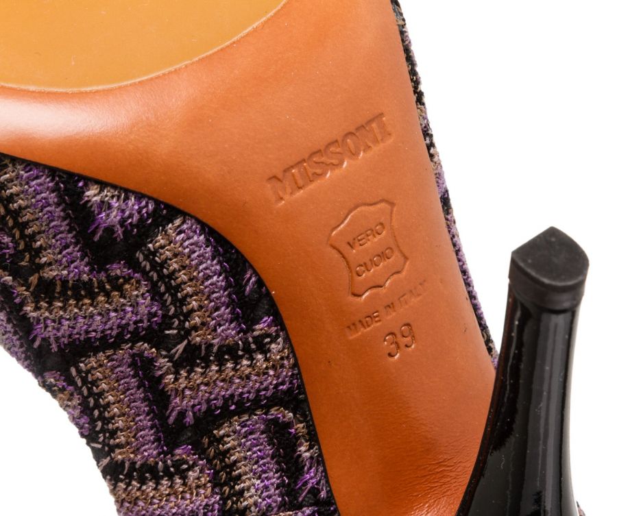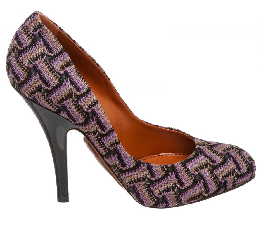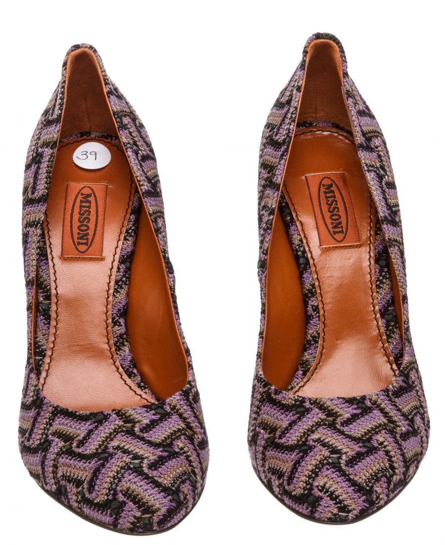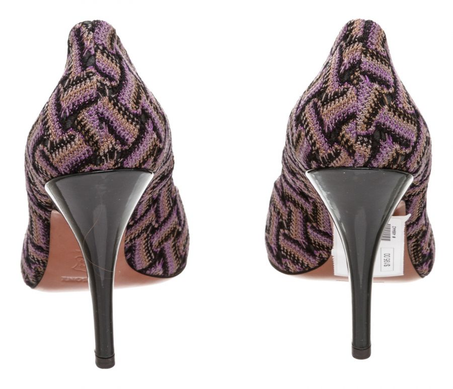 Purple multicolor knit Missoni chevron motif pumps that feature a round almond toe, covered heel and leather sole. RC 489442 MP 5.12.19