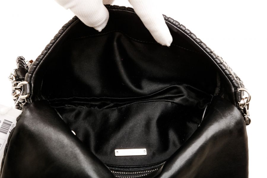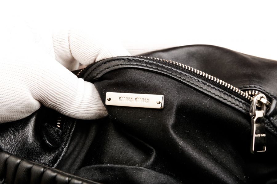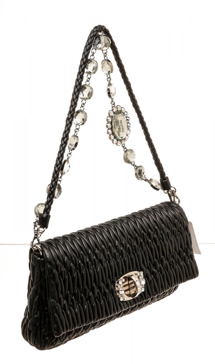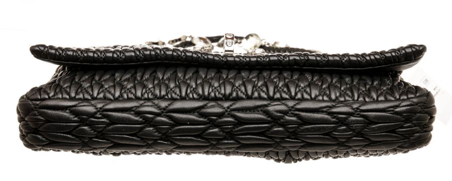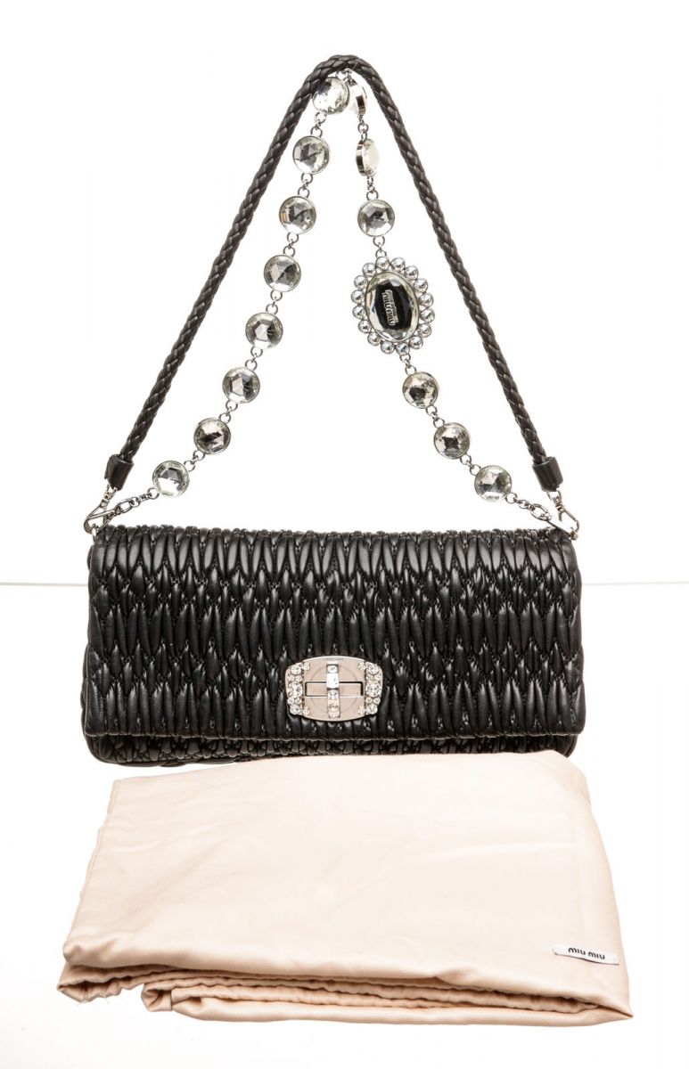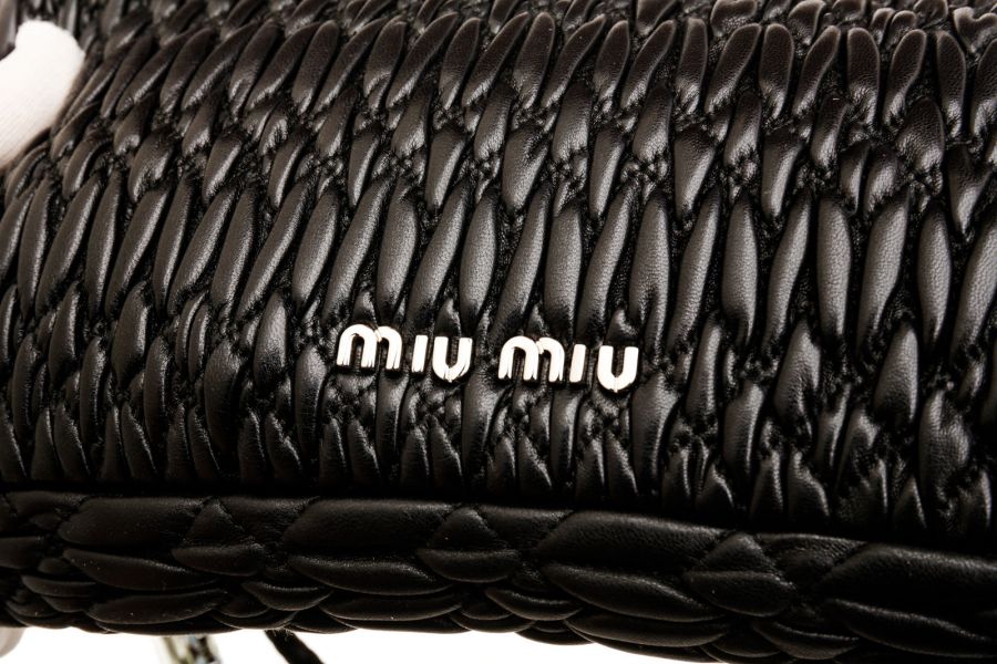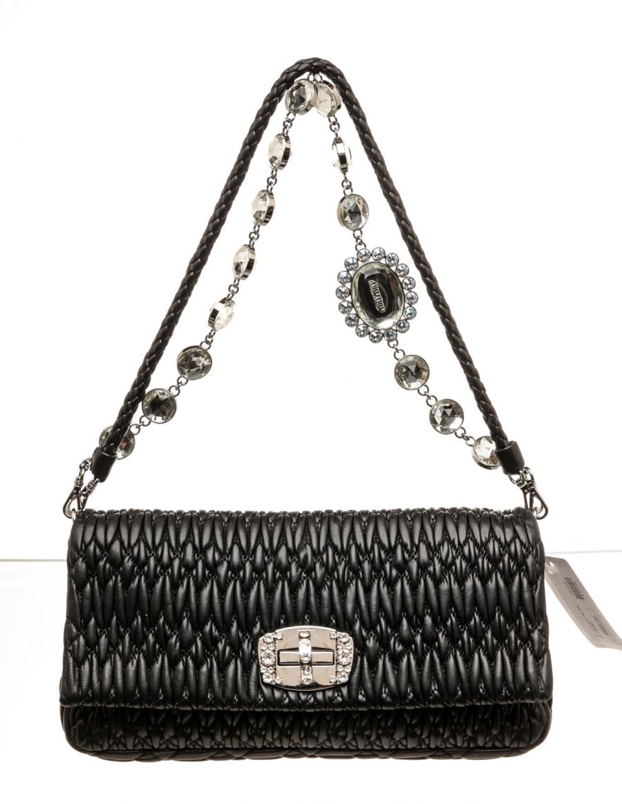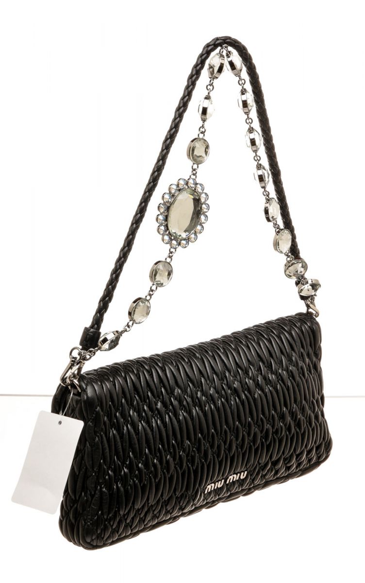 This black shoulder bag has been exquisitely crafted from Nappa leather using the metelasse technique and equipped with a well-sized interior. On the front, there is a crystal-embellished silver-tone lock detailing, along with a beaded chain-link, and a single top handle is provided for you to swing the bag. In every stride, swing, and twirl your audience will gasp in admiration at the beautiful sight of this Miu Miu creation.