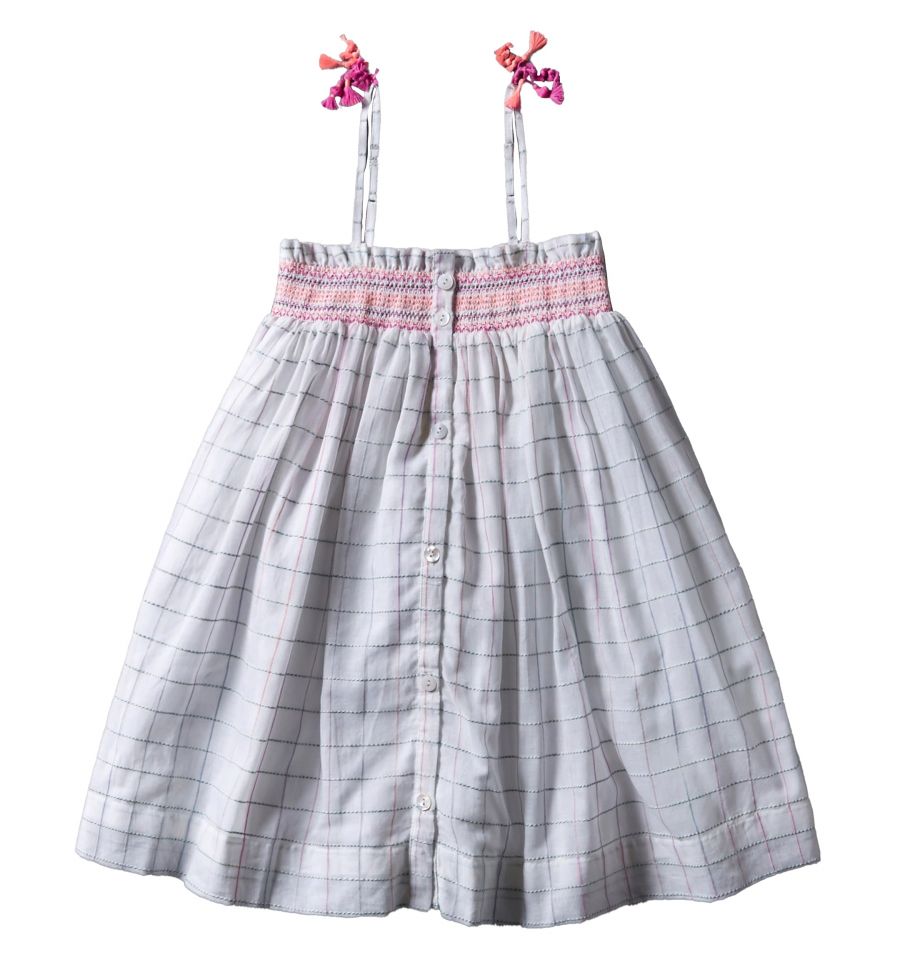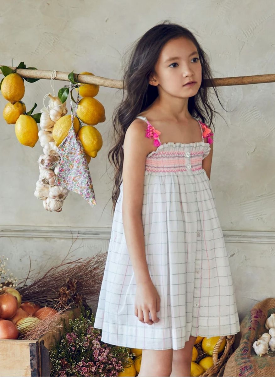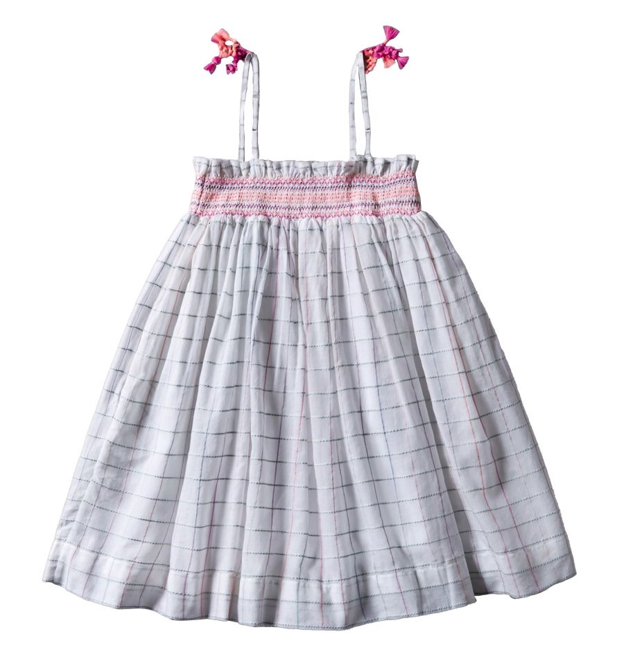 Delightfully pretty sun dress made in 100% fine cotton. There are adjustable shoulder straps and layered pom pom, with an elasticated smocked bodice.