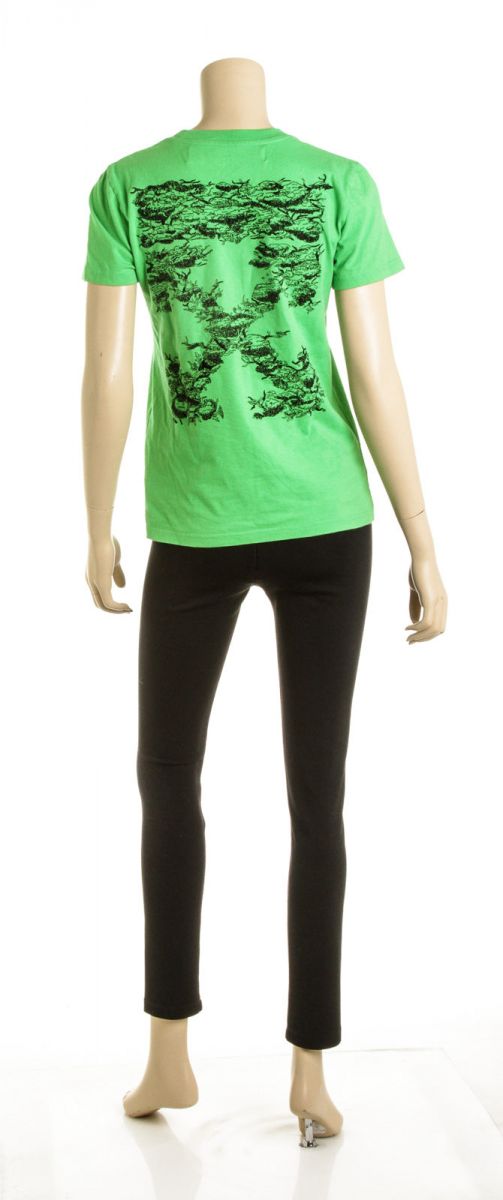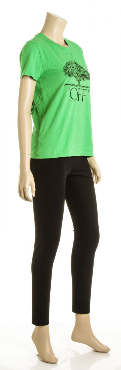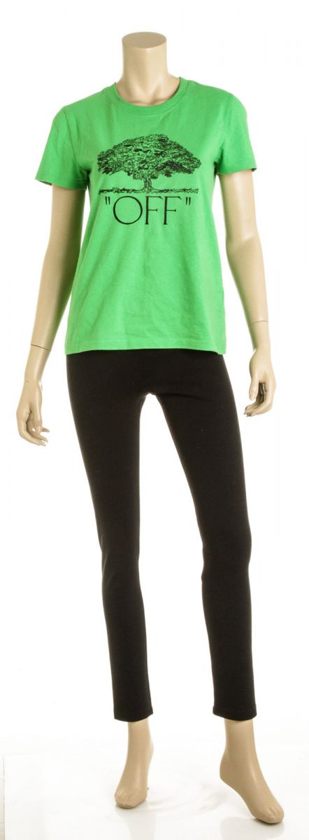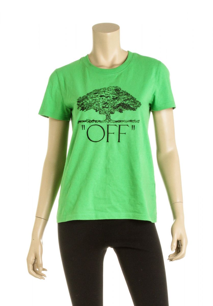 You can never have too many Tees, so add this lively bright green Off-White print tee to your wardrobe! Made of 100% cotton this tee features a black embroidered tree design and quote, "OFF".