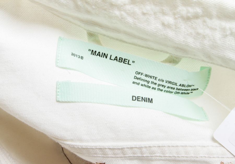 Off-White: "Defining The Grey Area Between Black and White as the Color Off-White(tm). Off-white distressed denim jean jacket featuring beautiful floral design on the back in white and brown embroidery with metallic beading. OQS 493083 CR 9.24.19