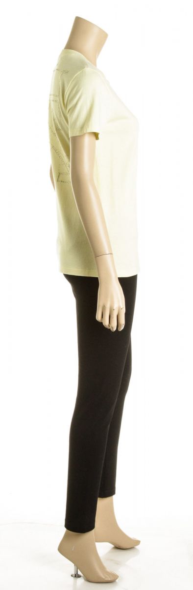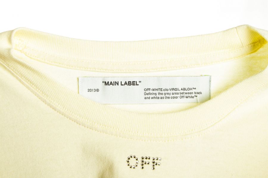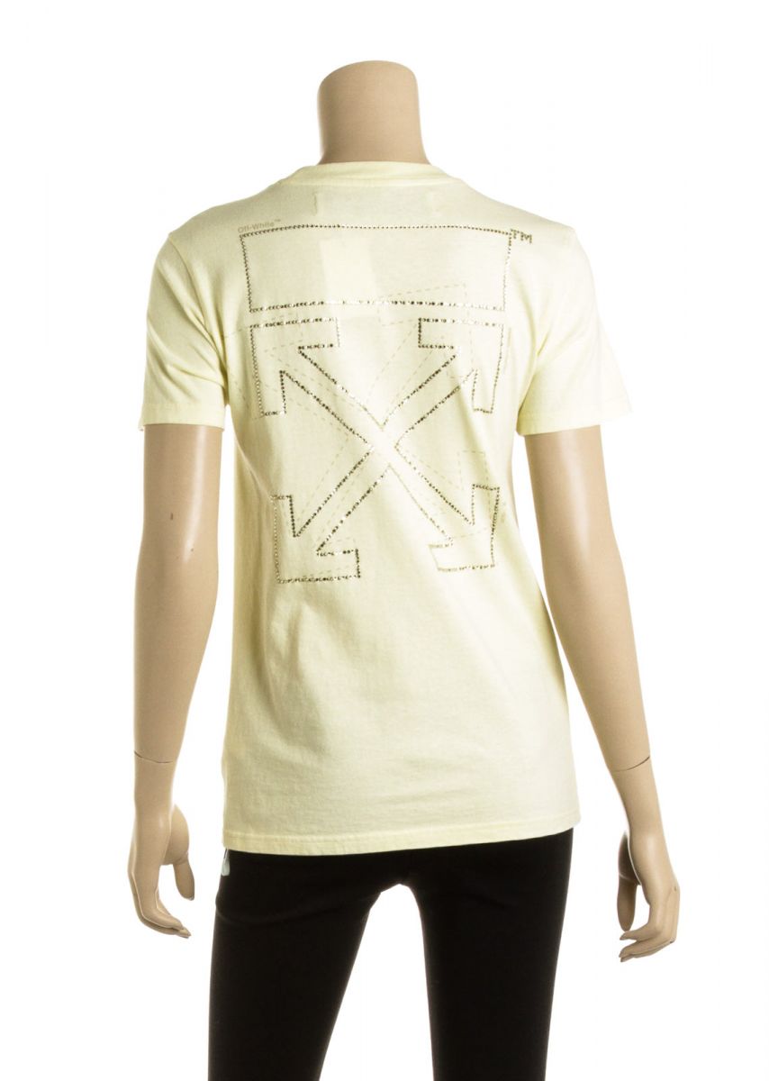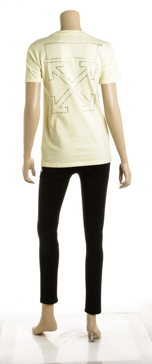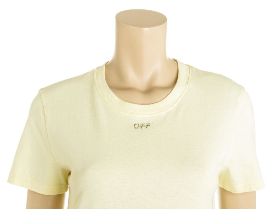 You can never have too many Tees, so add this simply sweet pale yellow Off-White tee to your wardrobe! Made of 100% cotton this tee features a yellow rhinestone decal right below the collar.