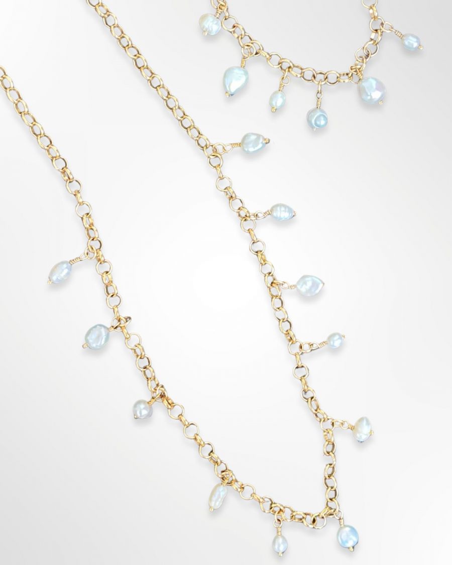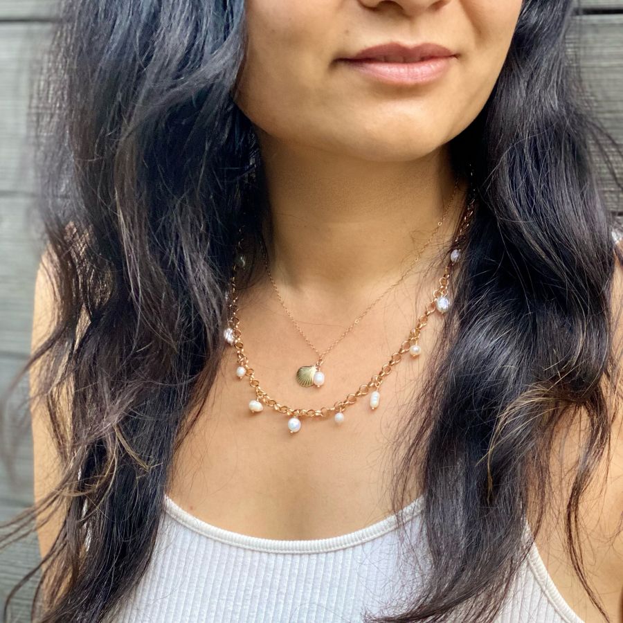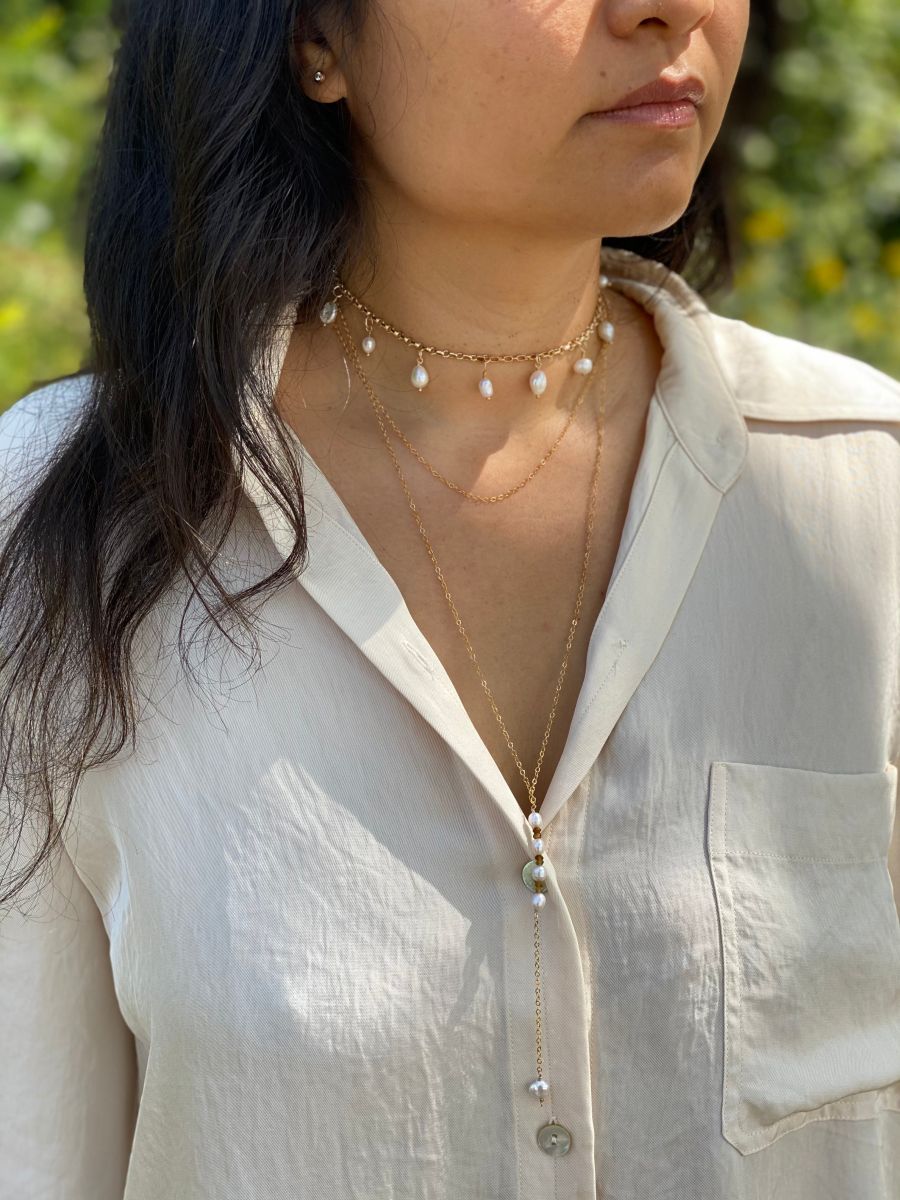 Our Pearl drop necklace is made to order and features a stunning freshwater pearl delicately suspended on a delicate chain, making it a perfect accessory for both formal and casual occasions. The subtle and elegant design allows the pearl to shine as the centerpiece, reflecting light and radiating its spiritual energy.
