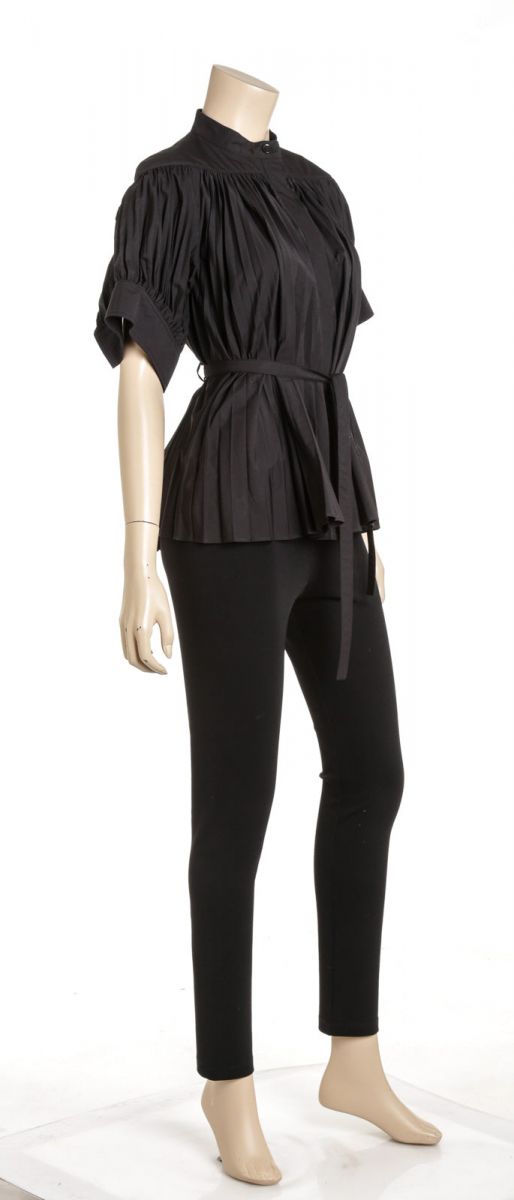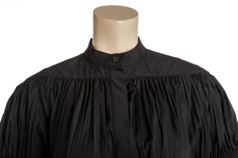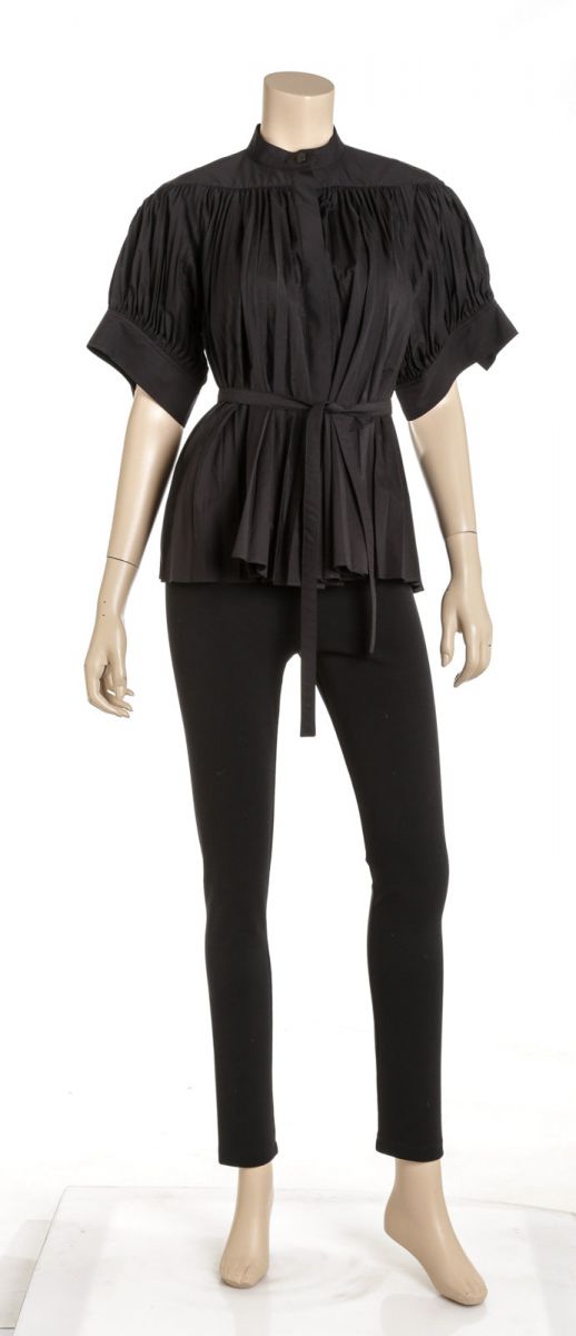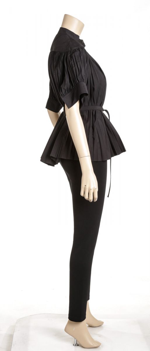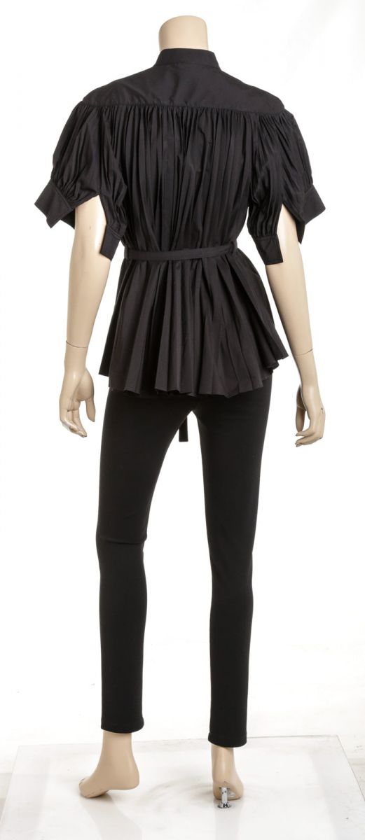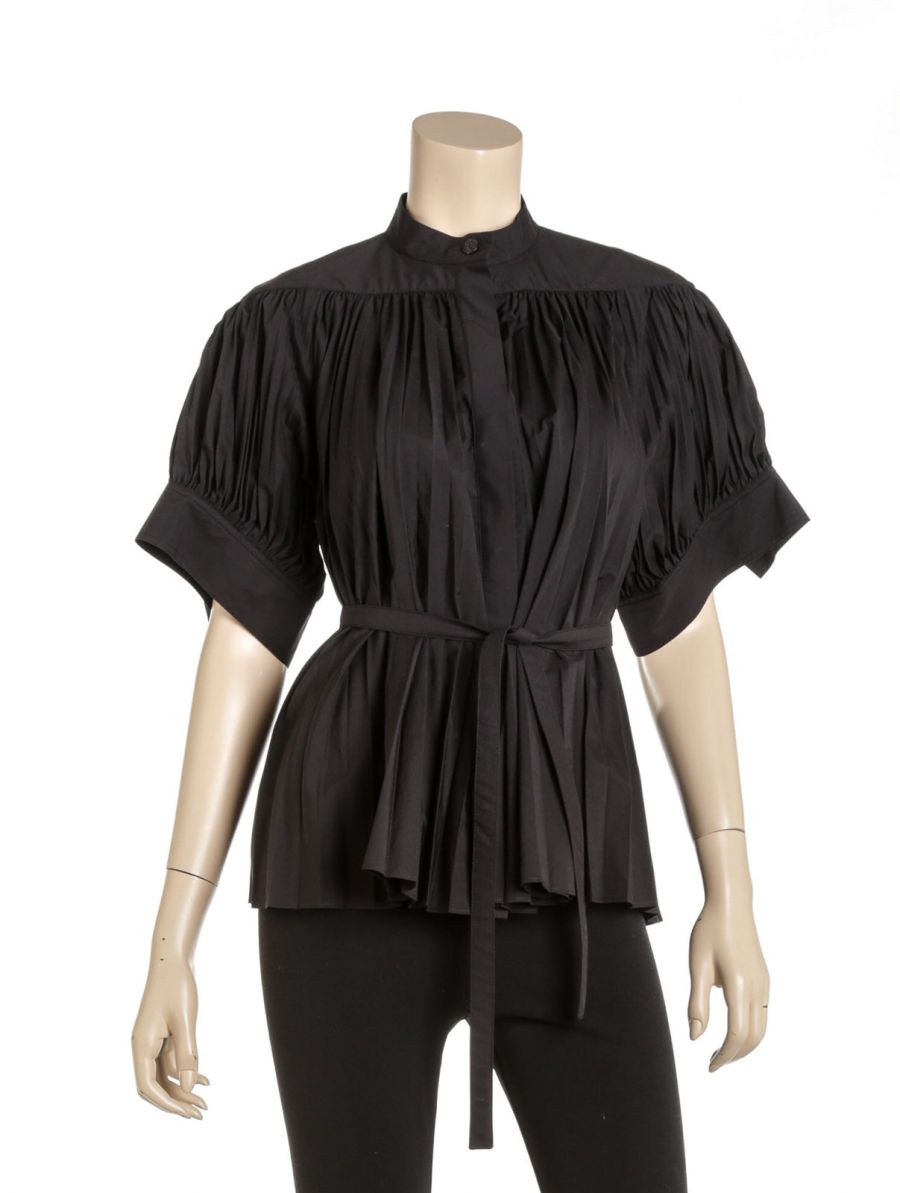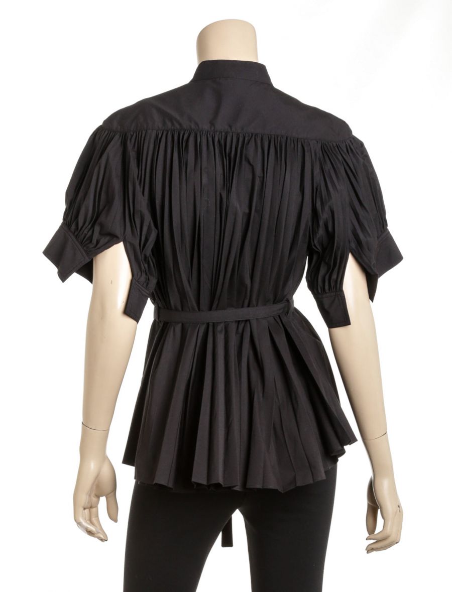 Proenza Schouler pleated poplin blouse, features a mock neckline, concealed button front, short sleeves, relaxed oversized fit with long black belt and made in Poland.