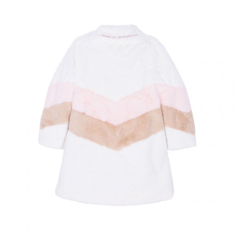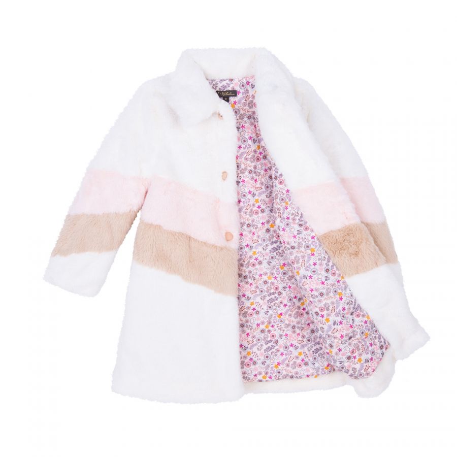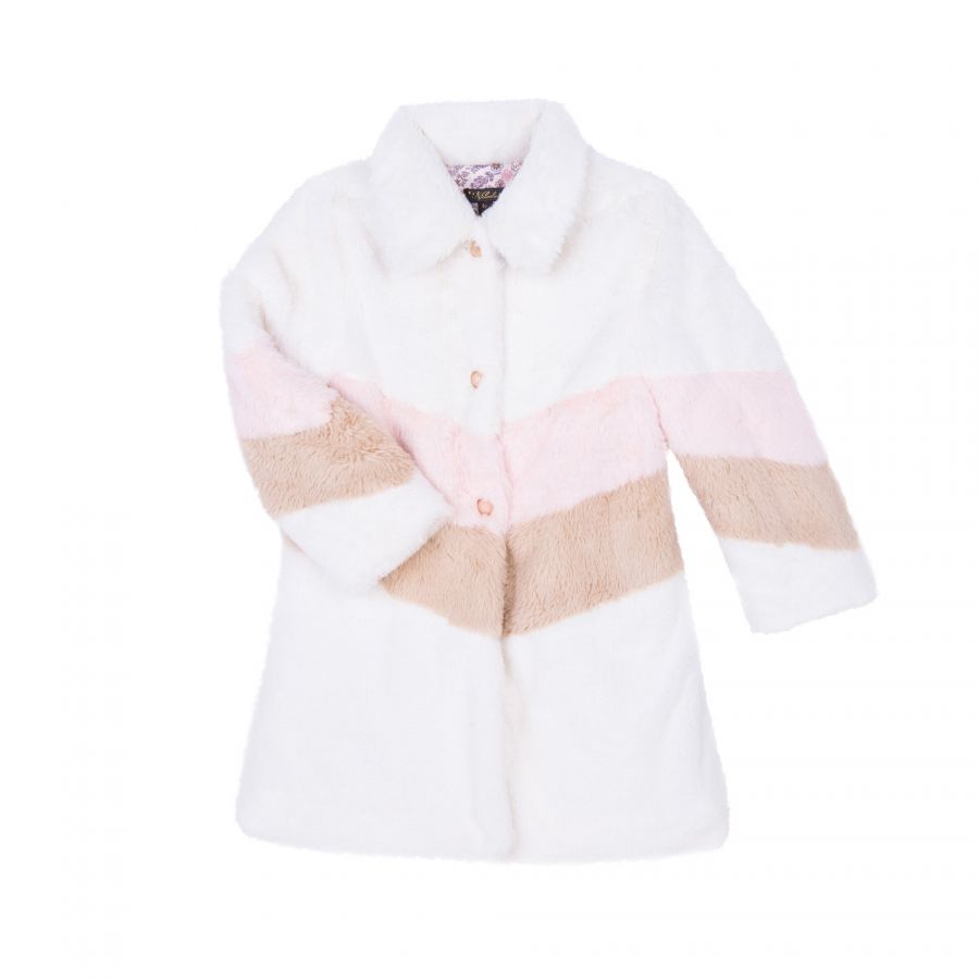 • Ourbeautifulfaux fur Sabine coat makes warm weather dressing fun and fashionable. This update on our classic oversized coat features printed lining and oversized gold buttons and makes an excellent addition toher new season collection.Pair this classic over a pretty party dress or jeans and boots for a casual look.