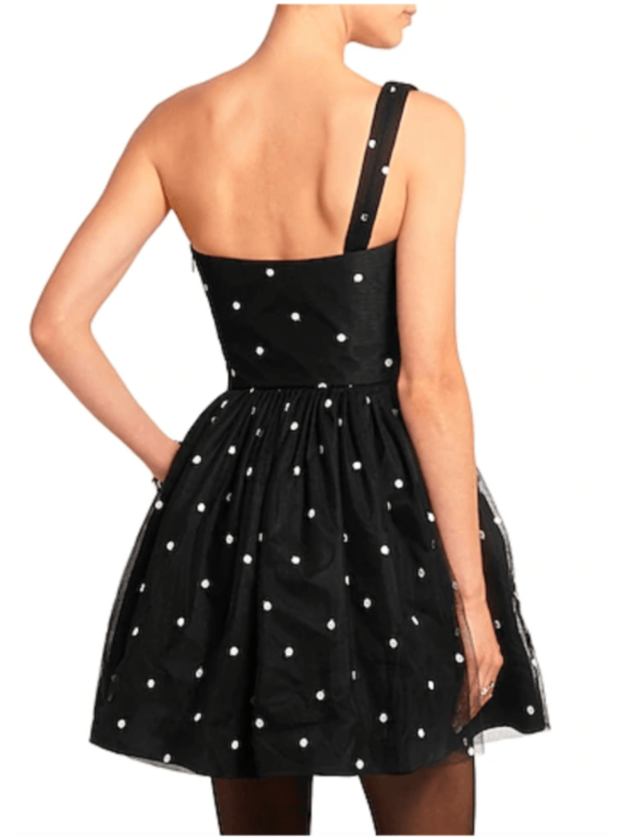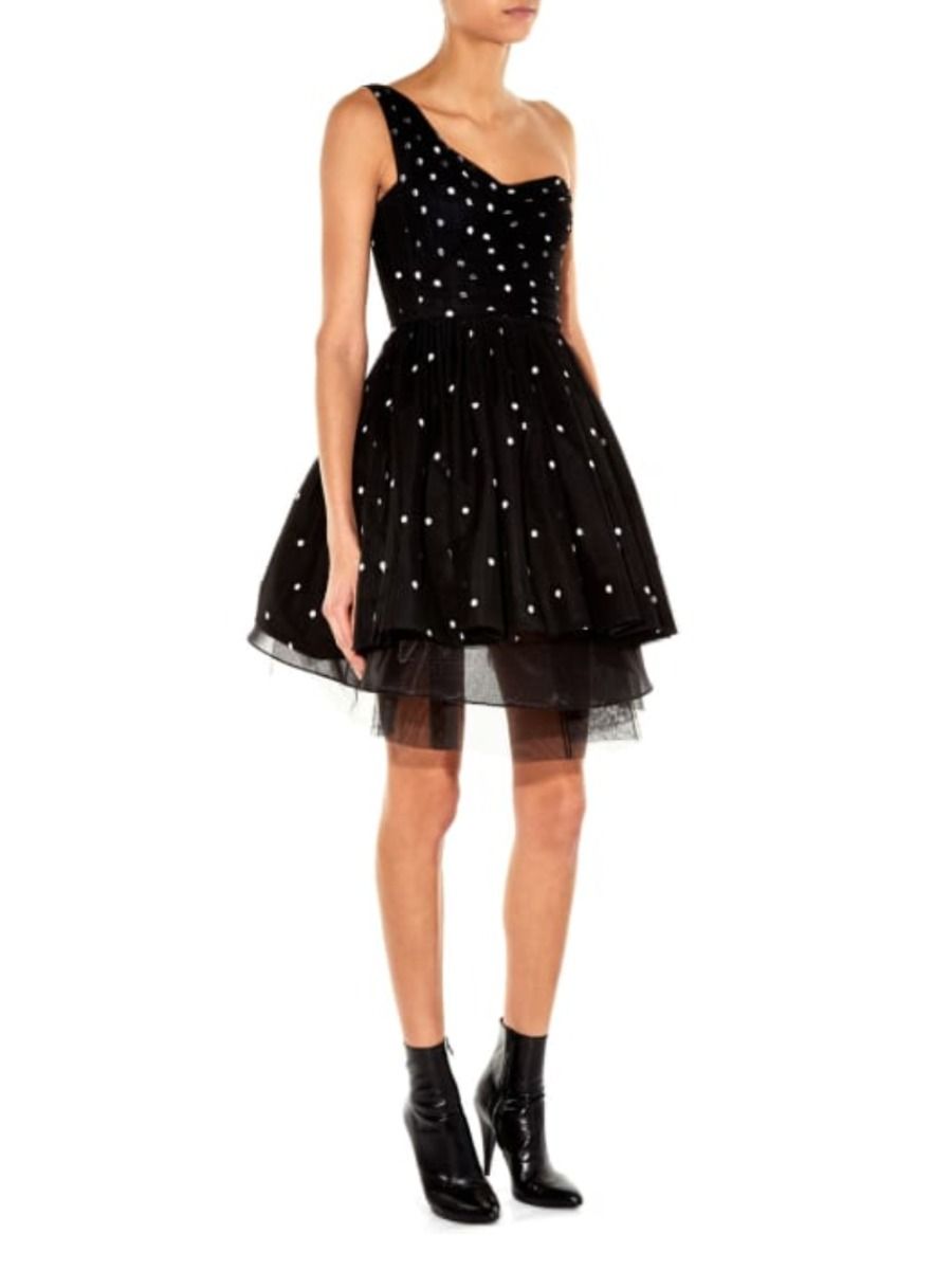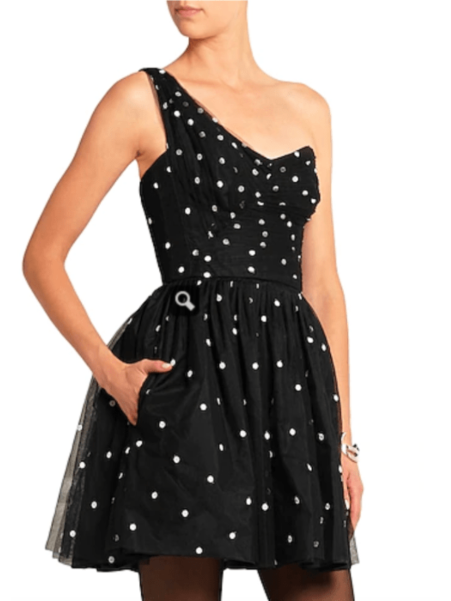 Size 6 Crafted of tulle, this pleated one-shoulder dress is scattered with polka dots and has a one-shoulder style. Features discreet side pockets, a seamed waist and corset style boning on the inside. Side zip closure, fully lined.