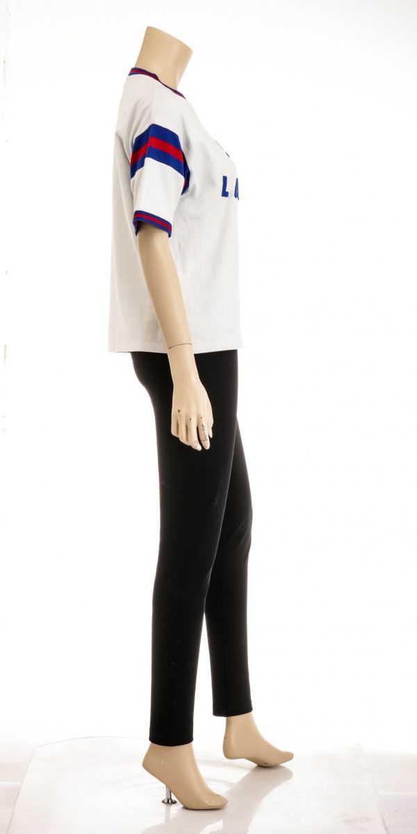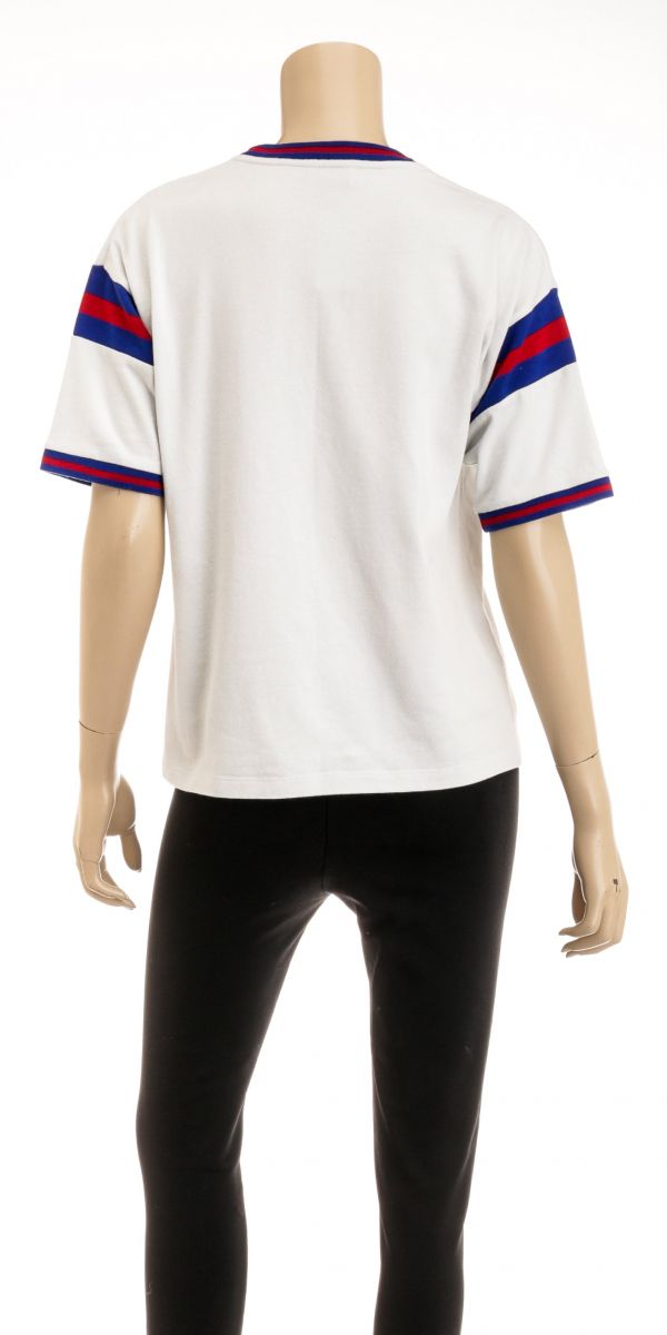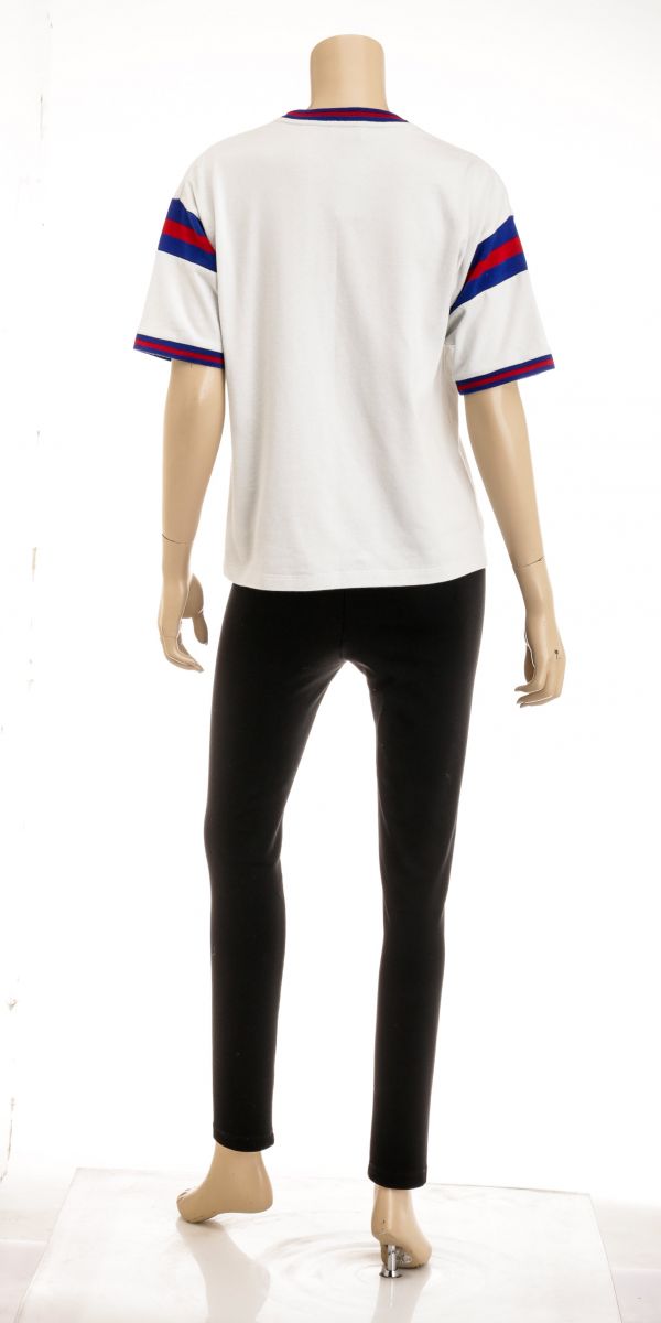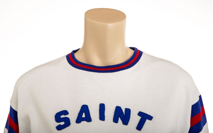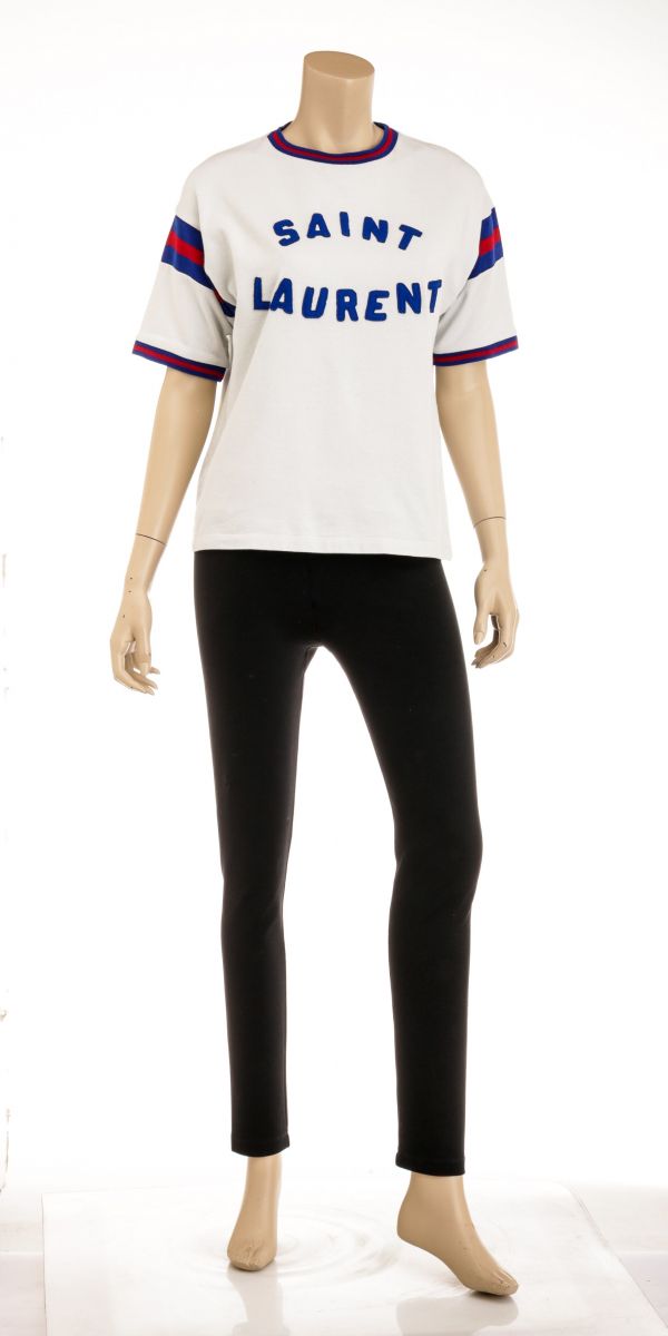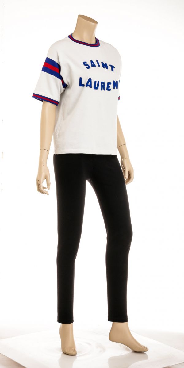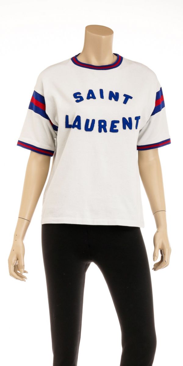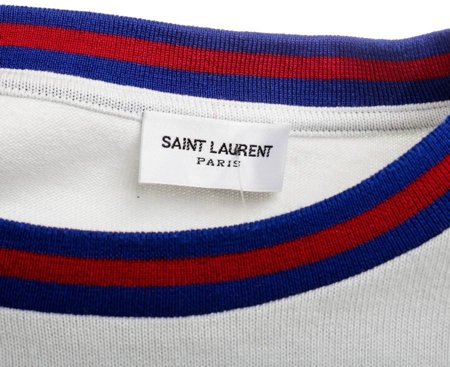 ROUND-NECK T-SHIRT WITH RIBBED TRIMS, FEATURING "SAINT LAURENT" FELT LETTERING ON THE CHEST AND STRIPED SLEEVES.