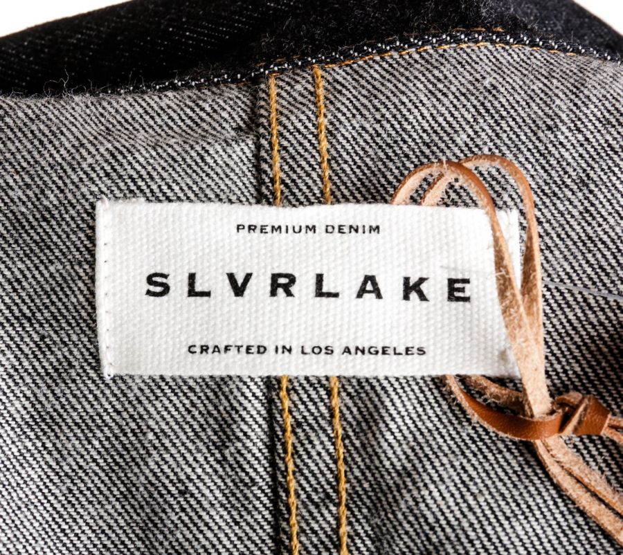 Night flight blue cotton cropped denim jacket from SLVRLAKE featuring dark wash, contrast stitching, classic collar, front button fastening, chest patch pocket, short sleeves and cropped.