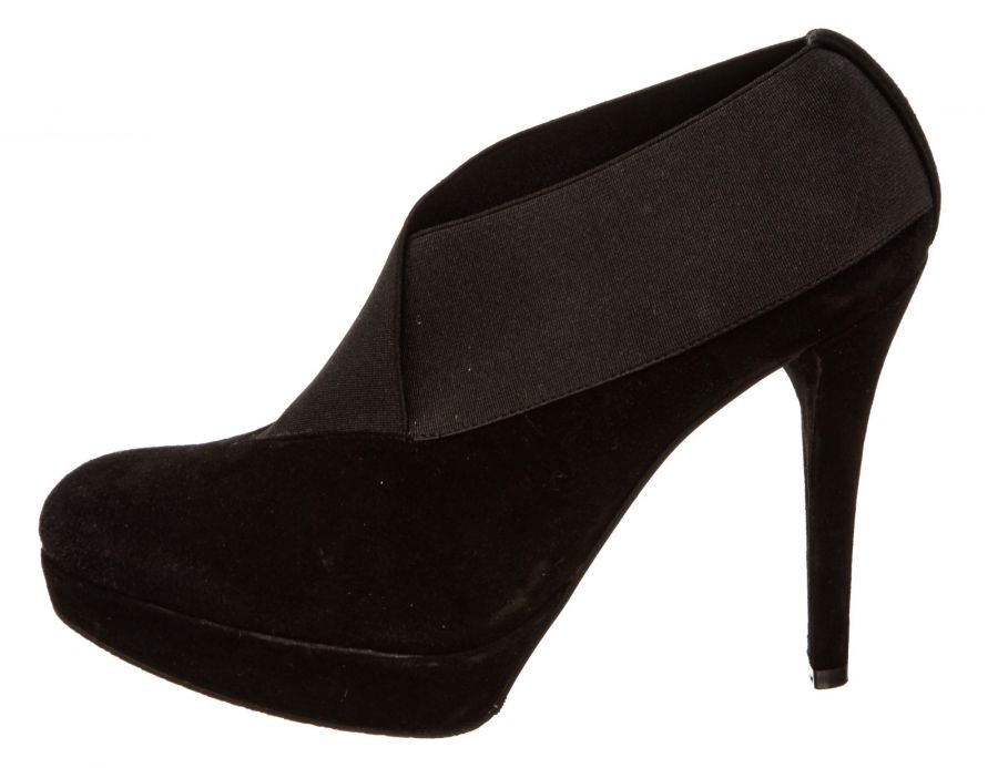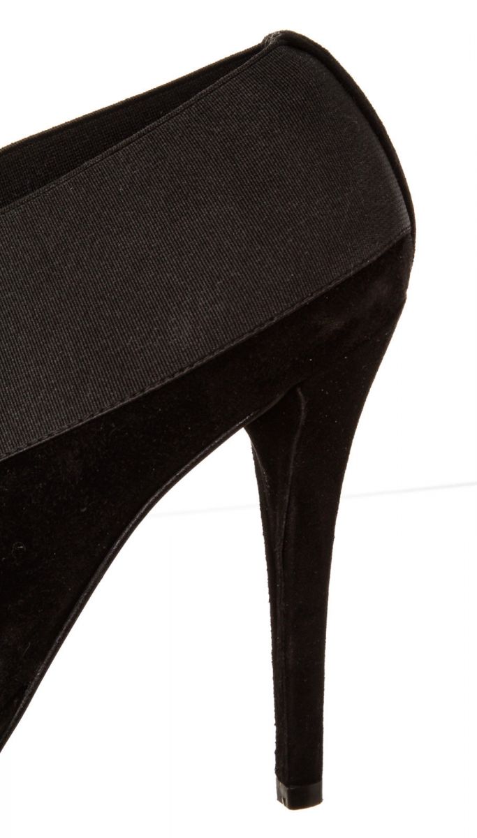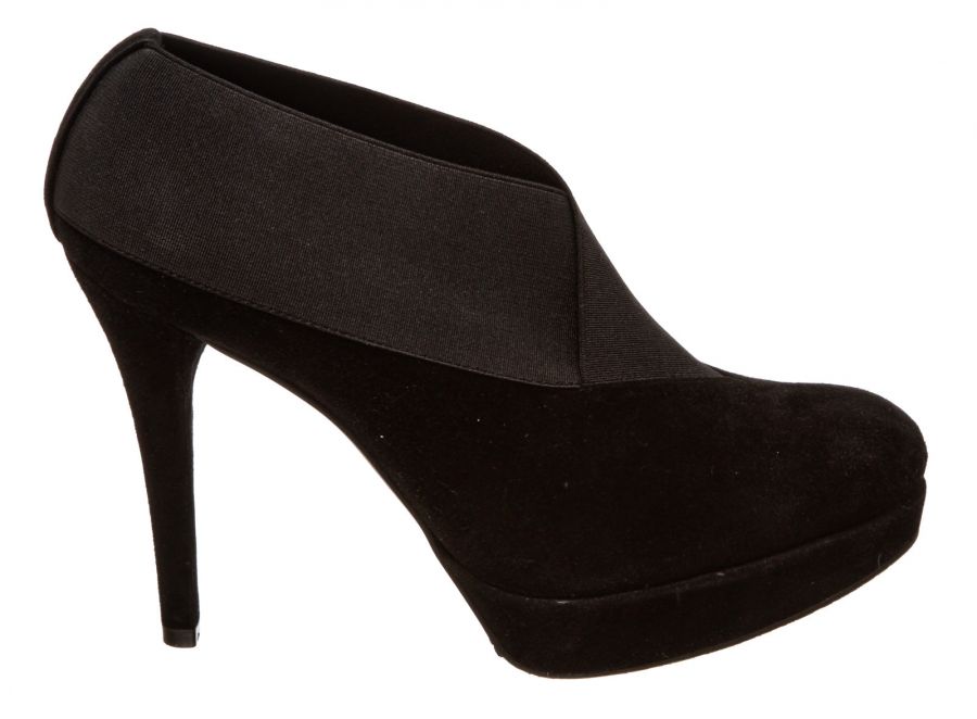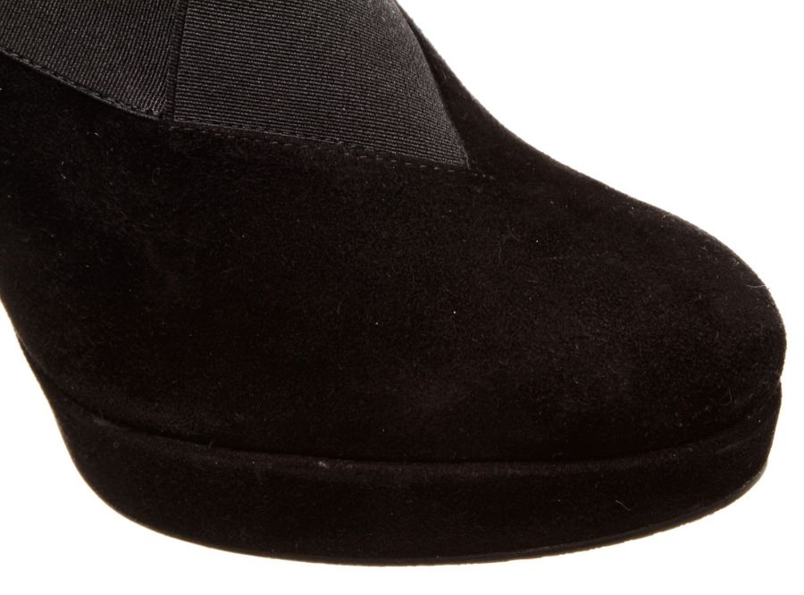 Black suede ankle bootie that features an elastic-trim, tonal stitching, front platform and a covered heel. RC 488558 MP 2.14.19